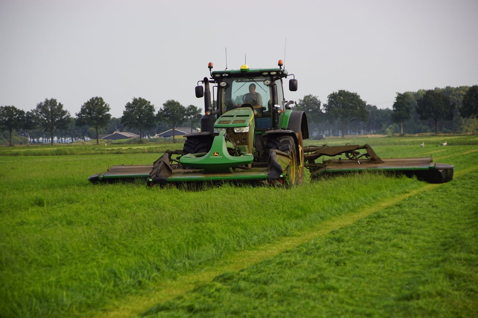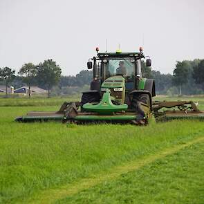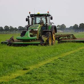 De John Deere-maaiers maken het plaatje compleet, een mooie combinatie om mee te maaien.