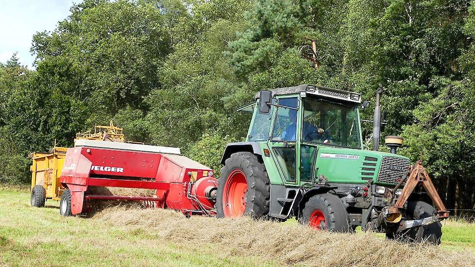 Melkveebedrijf Overeem (Boerderij Meerhoeve) uit Staverden (gem. Ermelo, GD) aan het hooibalen persen met een Fendt Farmer 308 LS met Lely Welger AP 730 en Hack SK 24 P.