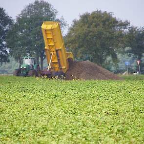 Zetmeelaardappelen rooien met een Grimme-zelfrijder. Een John Deere 6170M met een Tiger 220-kipper zorgt voor het transport naar de bult.