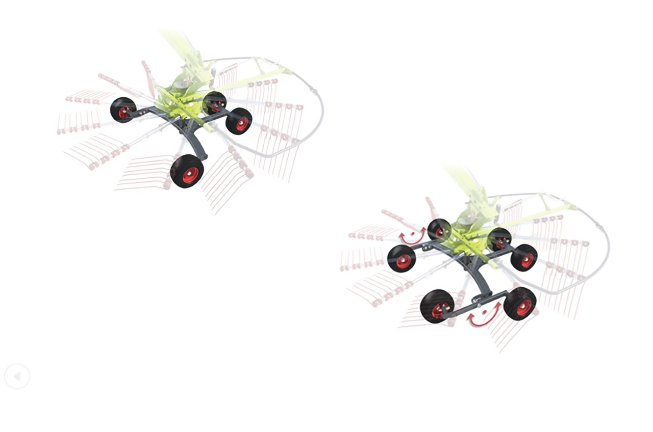 Ook de nieuwe generatie Liner-zwadharken met twee rotoren kenmerkt zich door een uitstekende bodemaanpassing van de rotoren, waarmee schoon kan worden geharkt en mogelijke opname van vuil in het voer tot een minimum wordt beperkt. Dankzij de Grass Care-rotorgeleiding worden de rotoren tijdens werkzaamheden actief ontlast. Wanneer de armen dalen worden eerst de achterwielen van de rotoren op de grond gezet - het zogenaamde 'Jet Effect' - waardoor beschadiging van de graszode wordt voorkomen. Bij de Business-modellen kunnen de rotoren afzonderlijk worden opgeheven met behulp van op de terminal vastgelegde voorkeuzes. Voor Trend-modellen kunnen de rotoren eveneens als optie afzonderlijk worden opgeheven. Hierbij worden de rotoren echter direct aangestuurd met behulp van regelventielen. Alle zwadharken zijn standaard voorzien van een onderstel met vier wielen. Liner 3100 daarentegen beschikt over een onderstel met zes wielen. De wielen zijn dichtbij de tanden aangebracht, om zo een rustige geleiding van de rotoren en uitstekende aanpassing aan de bodem te waarborgen. De twee voorwielen van het onderstel worden gestuurd. Modellen Liner 2700 - 2900 kunnen als optie worden uitgerust met een onderstel met zes wielen, waarbij de achterwielen van de rotor worden vervangen door pendelassen. De constructie van het onderstel zorgt samen met de cardanische ophangen met royale driedimensionale bewegingen van de rotoren tot een uitstekende aanpassing aan de bodem, ook wanneer slechts beperkt gemanoeuvreerd kan worden op kleine percelen met oneffenheden. Dankzij deze voorzieningen kan er schoon worden geharkt, waarbij mogelijke opname van vuil in het voeder tot een minimum wordt beperkt. De harkhoogte kan snel en soepel met behulp van een slinger aan de rotoren zelf worden ingesteld. Hiervoor is goed zichtbaar een schaalverdeling op de centrale pijp van de rotor aangebracht. Voor de betreffende zwadharken is als optie eveneens een hydraulische verstelling van de harkhoogte leverbaar. Bij de modellen Liner 2900 en 2800 Business kan de harkhoogte voor elke rotor afzonderlijk worden aangestuurd met voorkeuzes op de ergonomisch vormgegeven Cemis 10-bedieningsunit en met behulp van de regelventielen. Voor Liner-zwadharken met twee rotoren in de uitvoering Trend is een hydraulische hoogteverstelling van de rotoren met directe aansturing door de regelventielen als optie leverbaar.