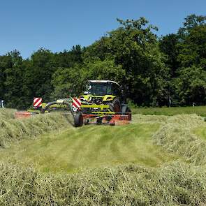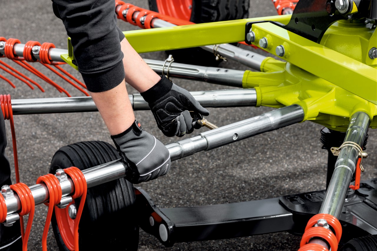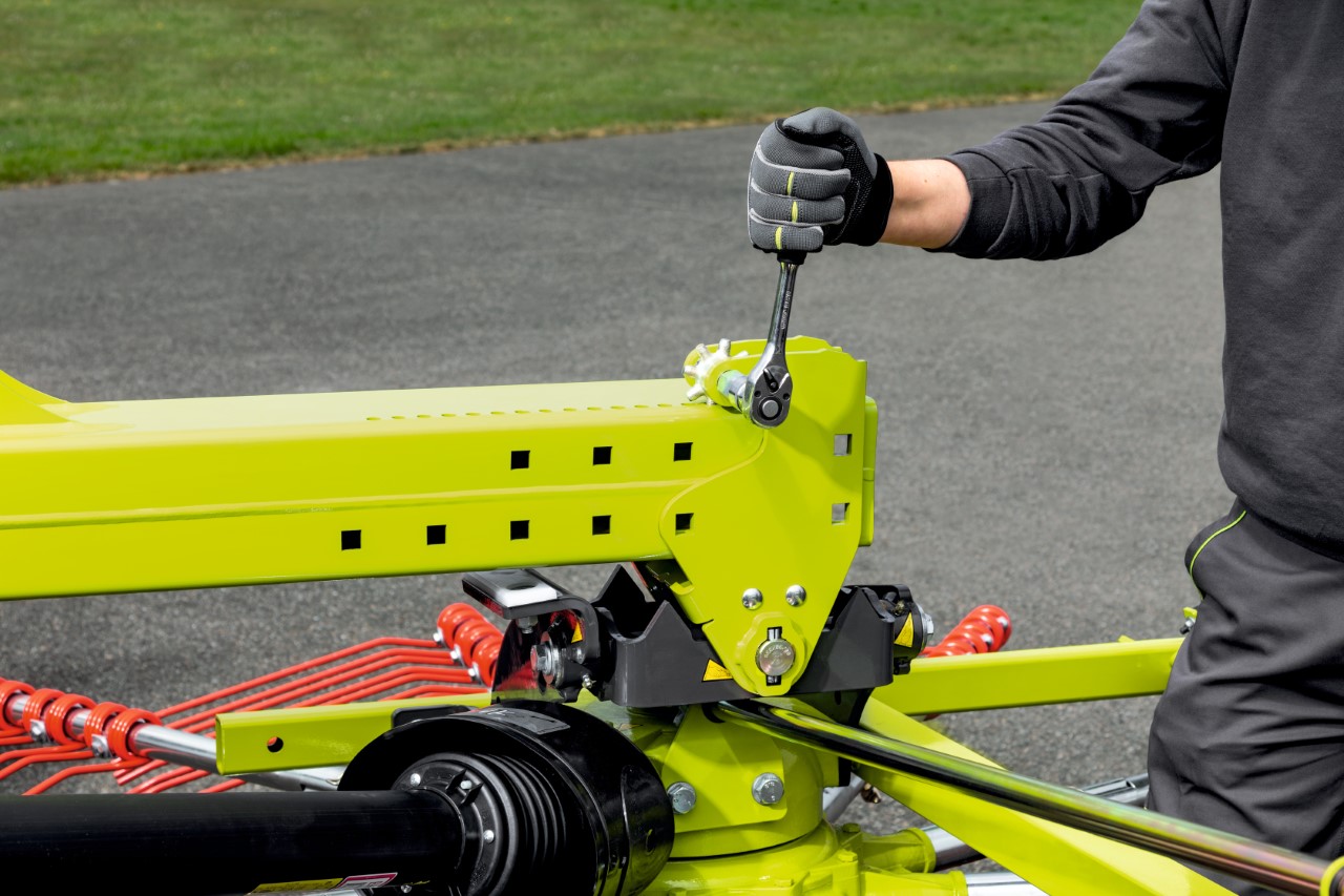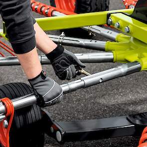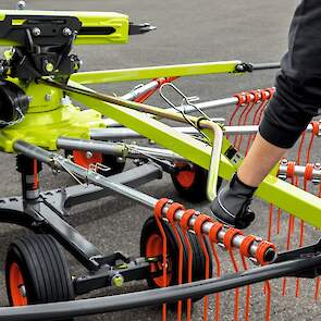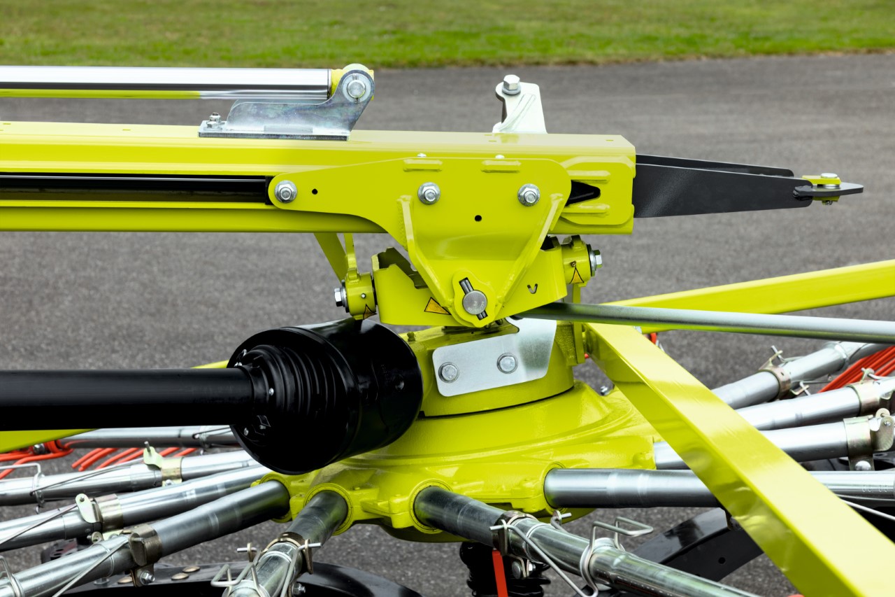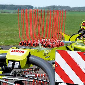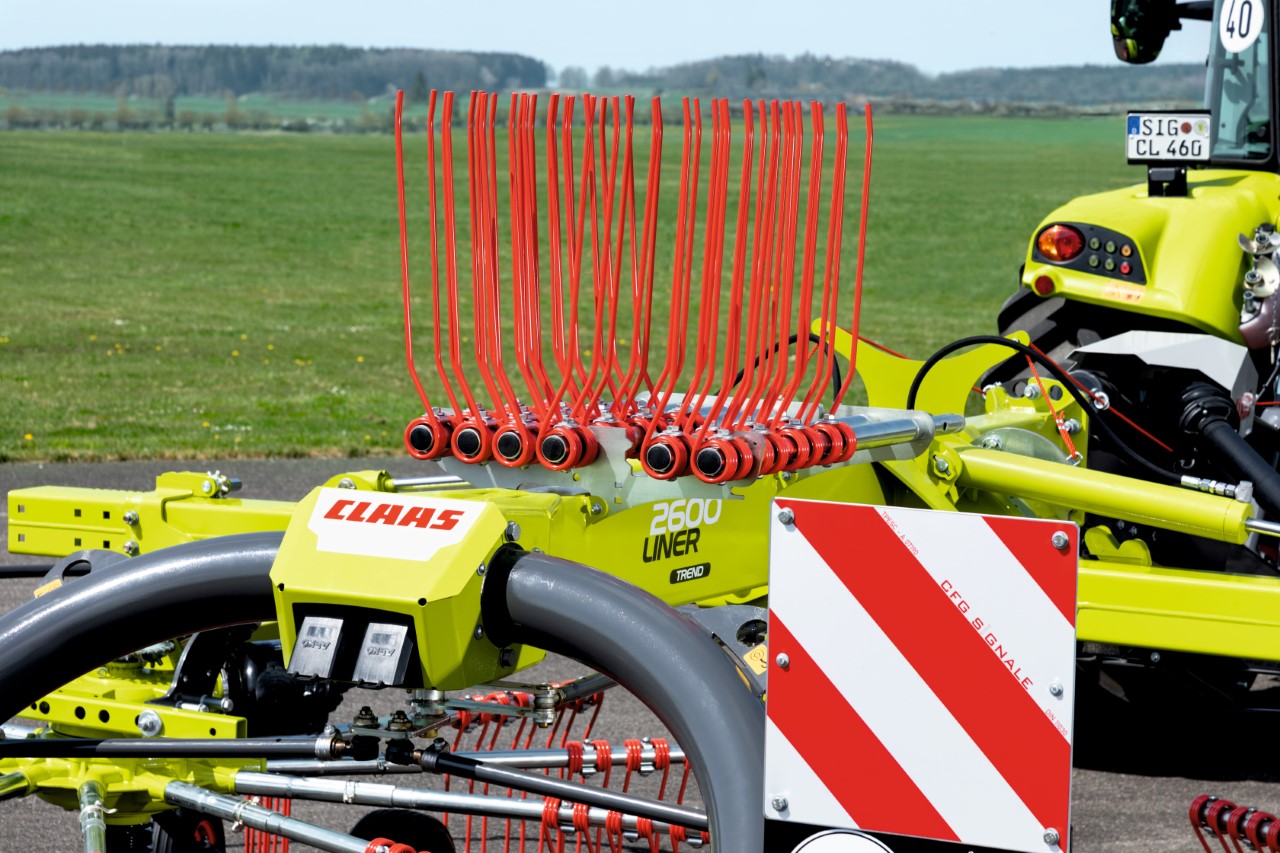 De uit twintig delen bestaande multisplines van de tandarmen van Liner 3100-2700 zijn spelingsvrij gemonteerd en voorzien van een Profix-beugelbeveiliging. Deze kunnen dan ook heel eenvoudig worden verwijderd en vervangen. Ook de zwadklok is uitstekend beveiligd met een geïntegreerde, gedefinieerde buigplaats voor alle tandarmen. De dubbele tanden worden op de tandarmen geschoven en vervolgens met een bout vastgezet om het risico op breuk te verminderen. Mocht dit echter toch optreden, dan blijft de betreffende tand op de arm aanwezig en gaat dan niet verloren. Per tandarm zijn vier dubbele tanden met een diameter van 9,5 mm gemonteerd. Dankzij de dubbel gedraaide vorm van de silagetanden met een hoek van 10 graden aan het uiteinde en naloop van 10 mm, kan niet alleen gelijkmatig worden geharkt, maar kunnen ook optimaal zwaden worden gevormd. Alle rotoren zijn afzonderlijk met slipkoppelingen tegen overbelasting beveiligd die, in tegenstelling tot nokkenschakelingkoppelingen, zachter aangrijpen en ook bij voorkomende belastingspieken ervoor zorgen dat er non-stop kan worden doorgewerkt. In de twee Y-aandrijfkasten op het hoofdframe wordt het toerental van de aftakas gereduceerd van 540 t/ min naar 350 t/ min, waardoor de aandrijflijn wordt ontzien. De vrijloop van de aftakas is in de Y-aandrijfkast ondergebracht, waardoor de rotoren in de transportstand vrij kunnen draaien. Bij de modellen Liner 3100 en 2900 worden de werk- en zwadbreedte hydraulisch en synchroon versteld met telescooparmen. Bij Liner 2700 en 2600 daarentegen wordt de verstelling mechanisch uitgevoerd. Bij Liner 2700 geschiedt dit met behulp van een gatenpatroon met borgpennen voor verschillende werkbreedten. Bij Liner 2600 wordt de gewenste werkbreedte ingesteld door bouten los te draaien.