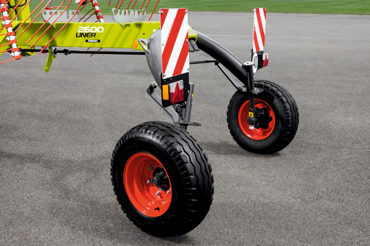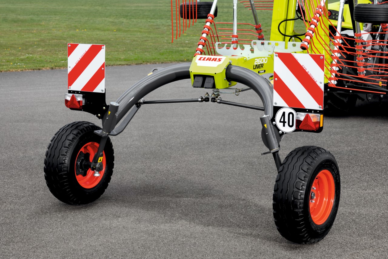 Alle nieuwe Liner-zwadharken met twee rotoren worden gedragen door een brede en stabiele transportas met spelingsvrije en mechanische, gedwongen besturing. De wieluitslag kan mechanisch worden ingesteld op een vrijwel directe of indirectere reactie. Dankzij de schuine wielophanging is weinig kracht vereist bij het sturen. Bovendien beschikken de modellen over een perfecte rechtuitstabiliteit. De maximale transportsnelheid bedraagt 40 km/ h voor de zwadharken. De standaard wielgewichten van Liner 3100 zorgen voor een nog hogere stabiliteit. Voor alle overige Liner-zwadharken met twee rotoren zijn wielgewichten als optie leverbaar. Bij de modellen Liner 3100 - 2700 bedraagt de transportbreedte 2,97 m. Bij Liner 2600 met banden 260/75-15.3 blijft de transportbreedte zelfs beperkt tot 2,55 m. Bij alle Liner-zwadharken met twee rotoren, met uitzondering van Liner 3100, blijft de transporthoogte met tandarmen onder de 4 meter. Bij Liner 3100 moeten voor transport op straat eerst drie tandarmen per rotor worden gedemonteerd.