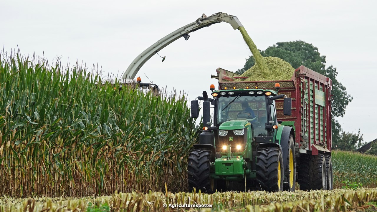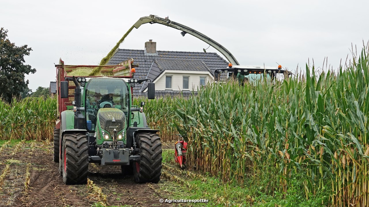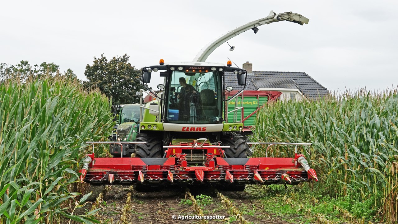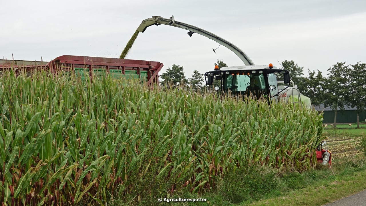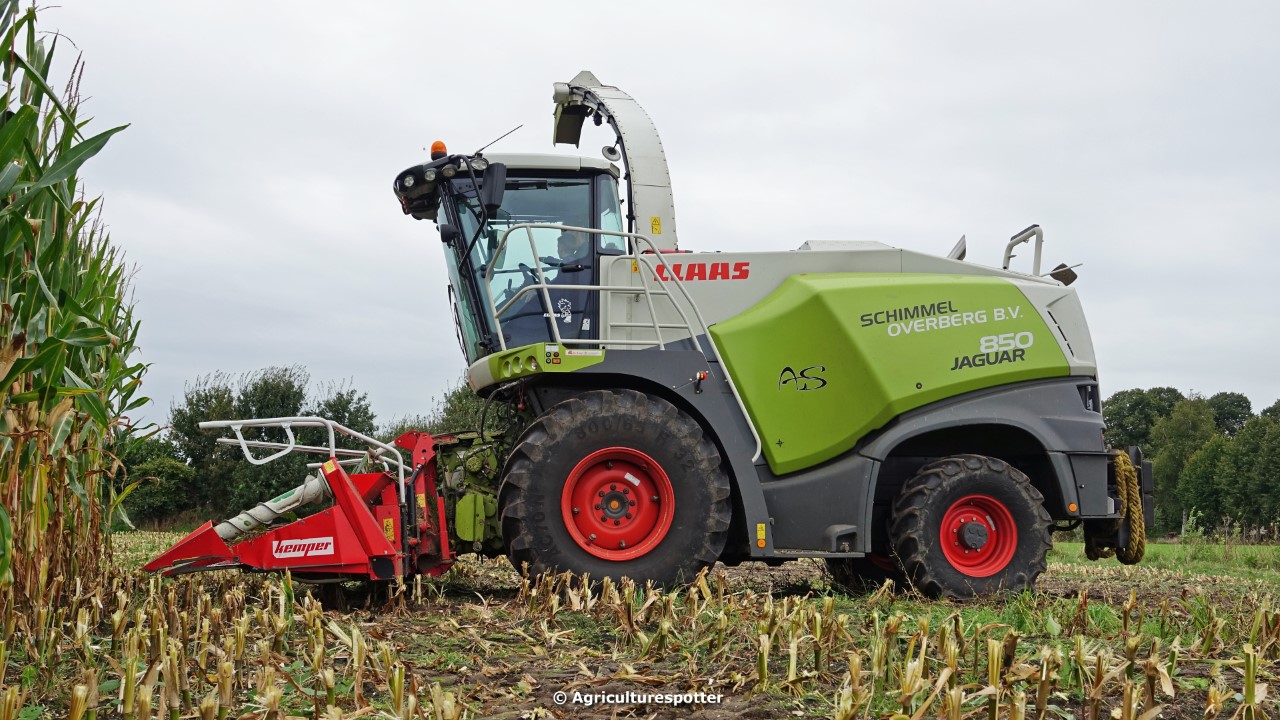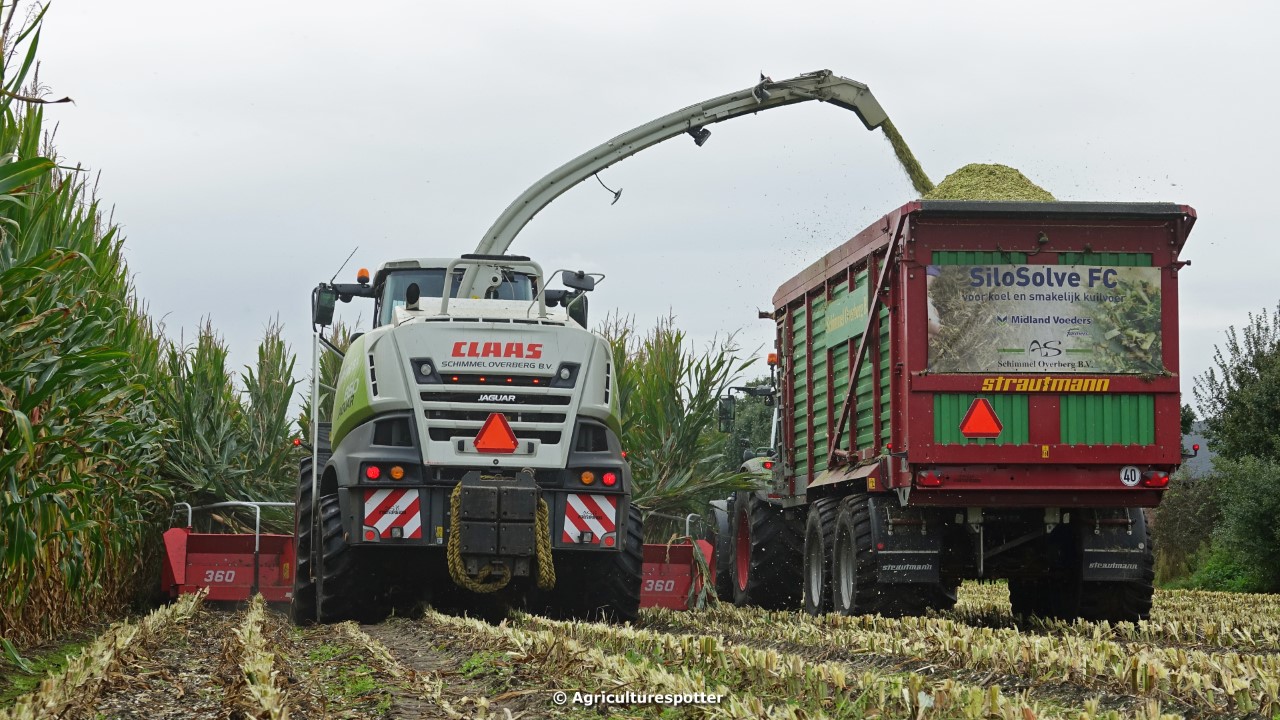 Maïs hakselen in Lunteren (GD) met een Claas Jaguar 850 en een Kemper 360 (8-rijer) van Loonbedrijf Schimmel Overberg BV. Het transport werd gedaan met een Fendt 722 Vario en een John Deere 6175R met Strautmann Giga-Trailer 4601-silagewagens.