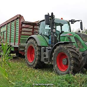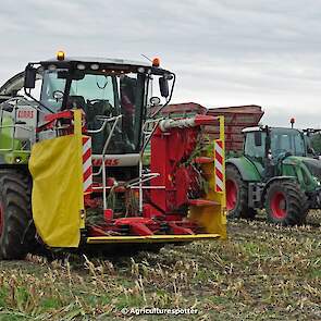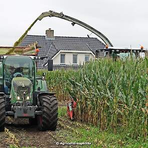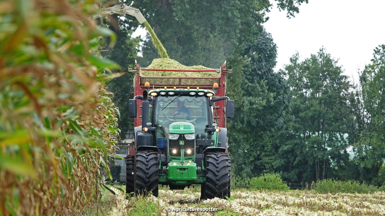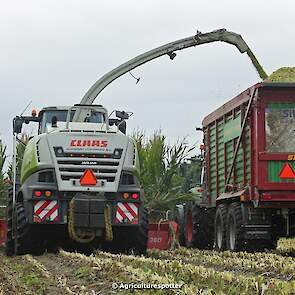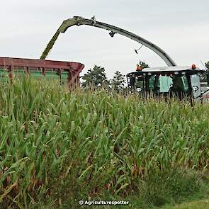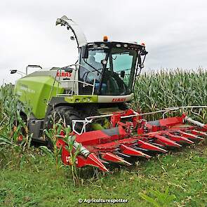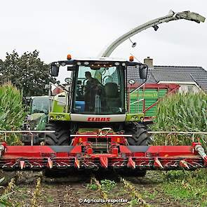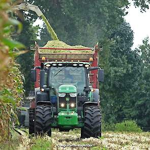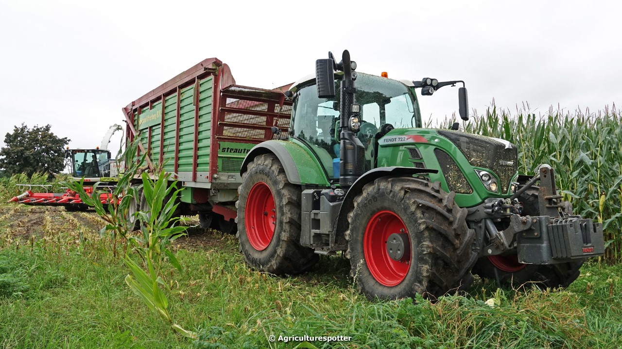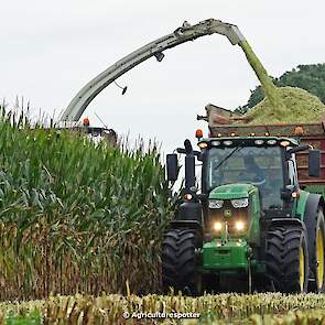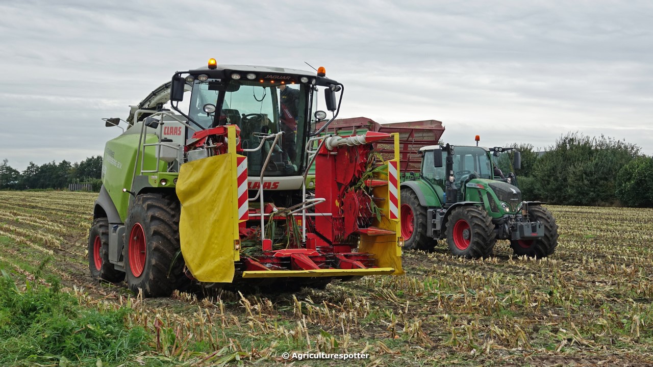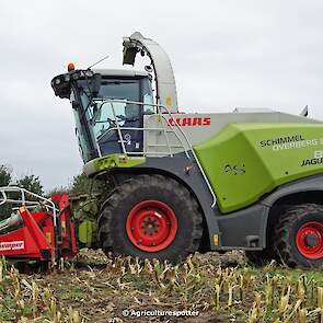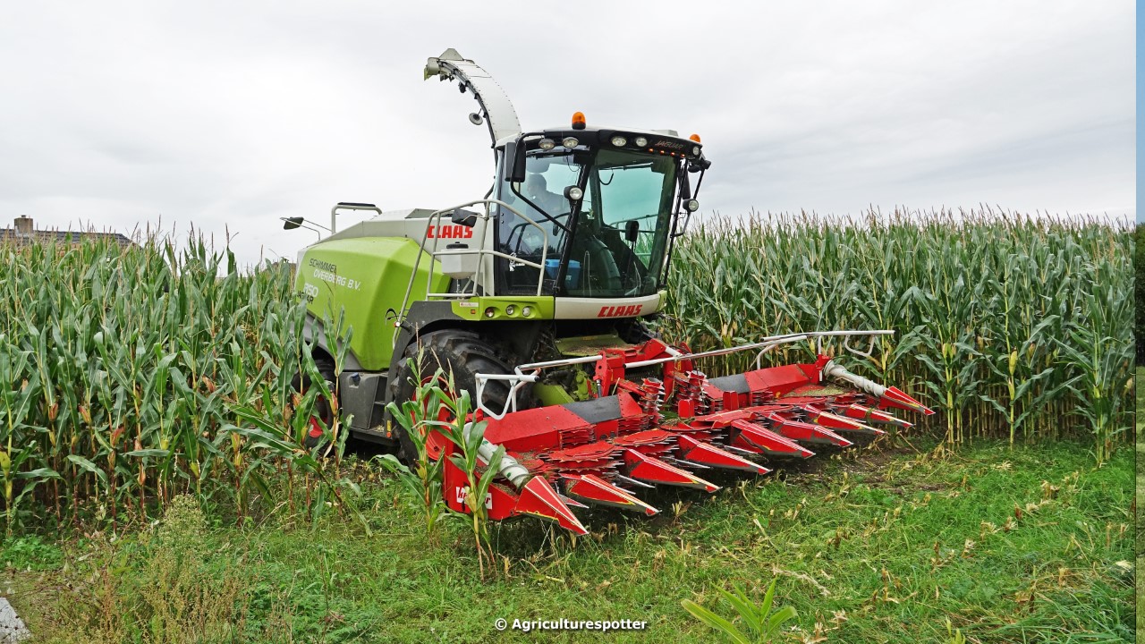 Maïs hakselen in Lunteren (GD) met een Claas Jaguar 850 en een Kemper 360 (8-rijer) van Loonbedrijf Schimmel Overberg BV. Het transport werd gedaan met een Fendt 722 Vario en een John Deere 6175R met Strautmann Giga-Trailer 4601-silagewagens.