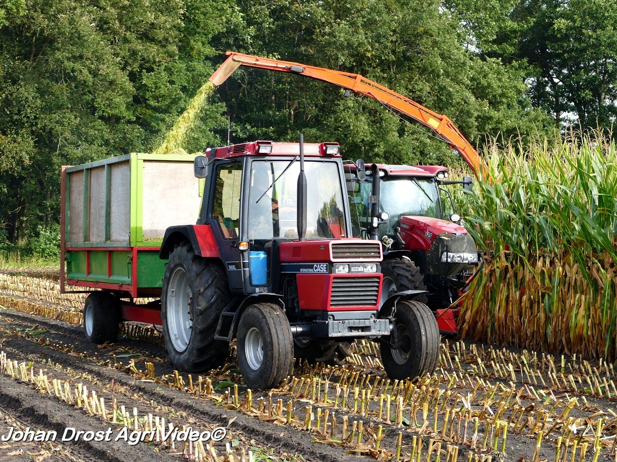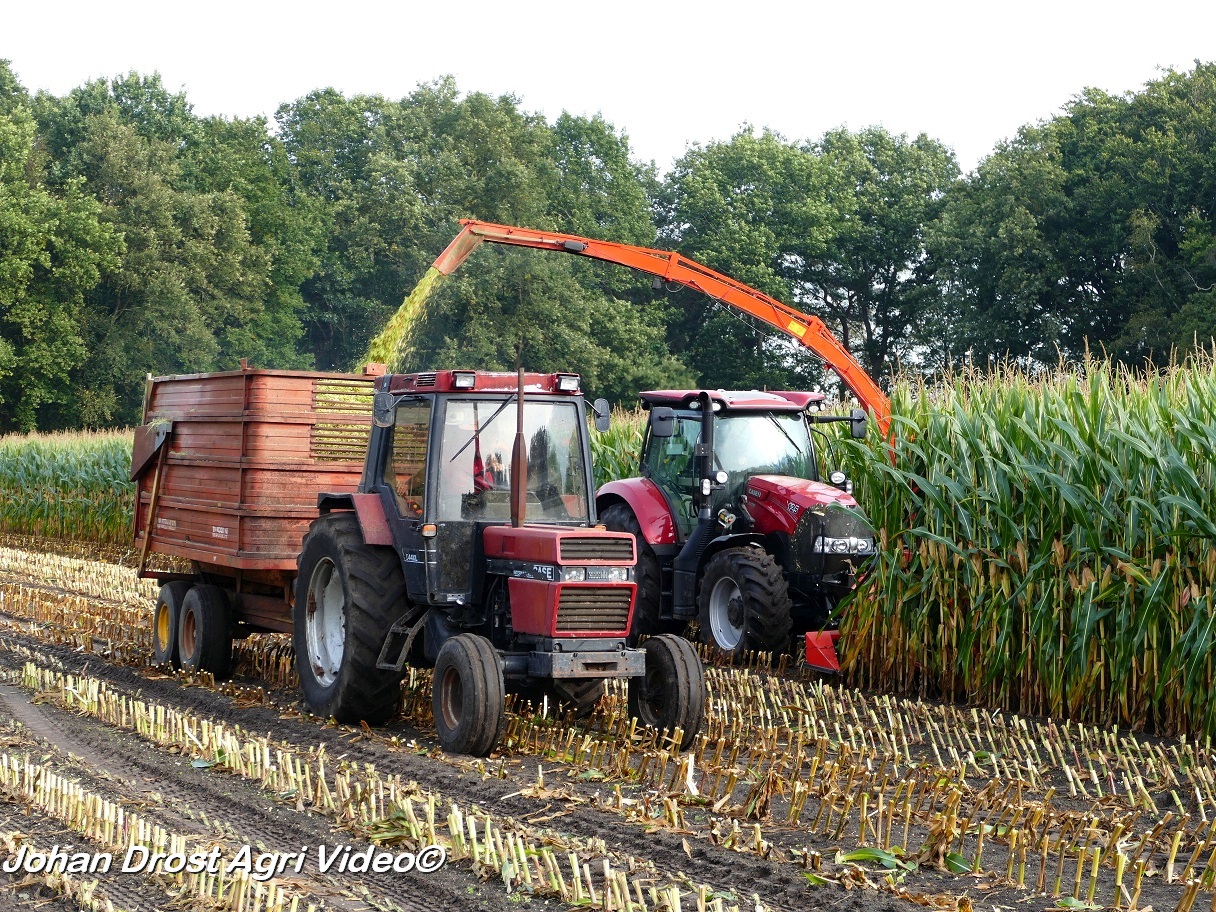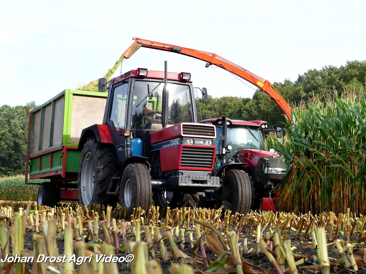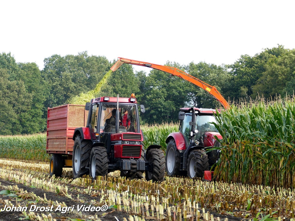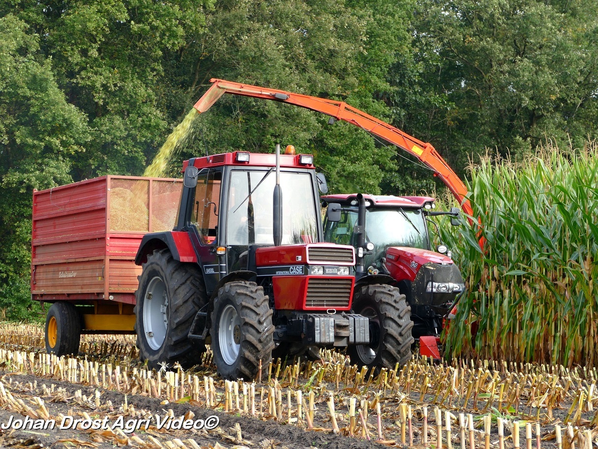 Melkveebedrijf Busweiler uit Nunspeet (GD) aan het maïs hakselen met een Case IH Maxxum 125 met een Kuhn MC 180 S Quattro, een Case International 844Xl, een Case International 845Xl met Schuitemaker-kieper en een Case International 745Xl. Op de kuil een Case International 1455XL en een Volvo L30G van A.V.S. Machineverhuur uit Doornspijk (GD).