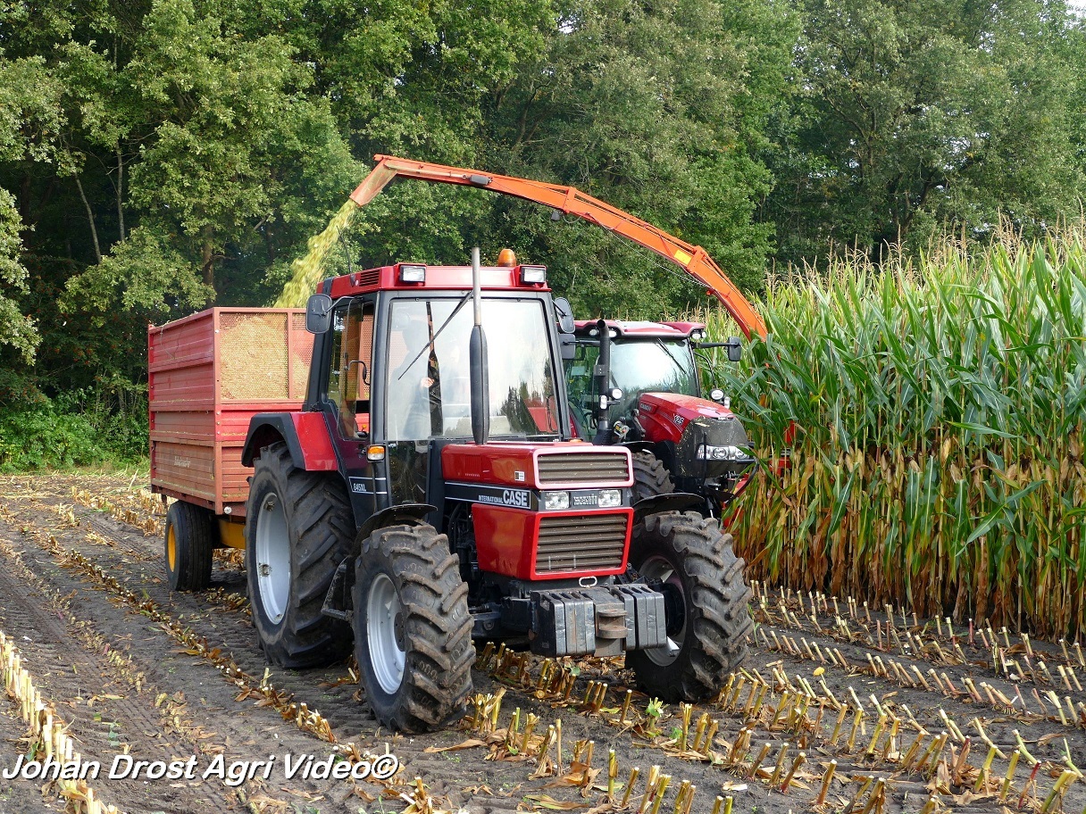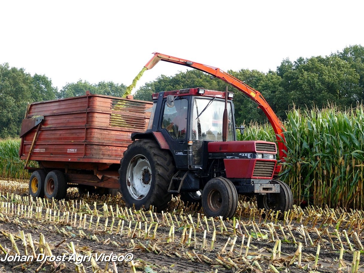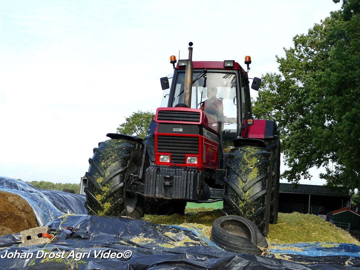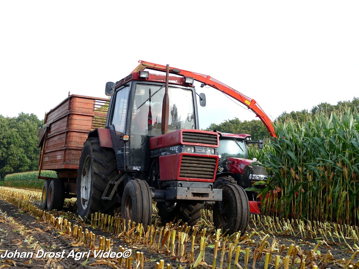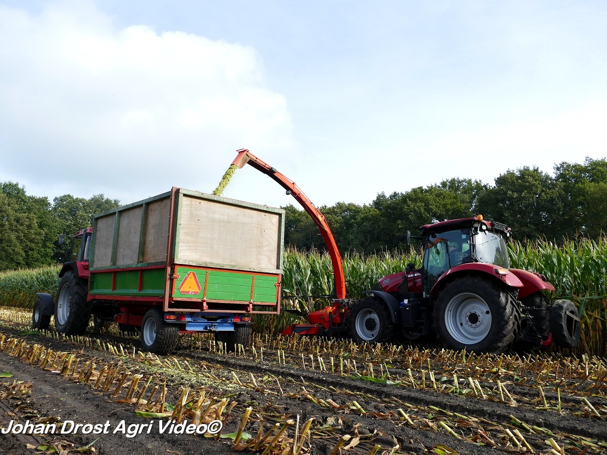 Melkveebedrijf Busweiler uit Nunspeet (GD) aan het maïs hakselen met een Case IH Maxxum 125 met een Kuhn MC 180 S Quattro, een Case International 844Xl, een Case International 845Xl met Schuitemaker-kieper en een Case International 745Xl. Op de kuil een Case International 1455XL en een Volvo L30G van A.V.S. Machineverhuur uit Doornspijk (GD).