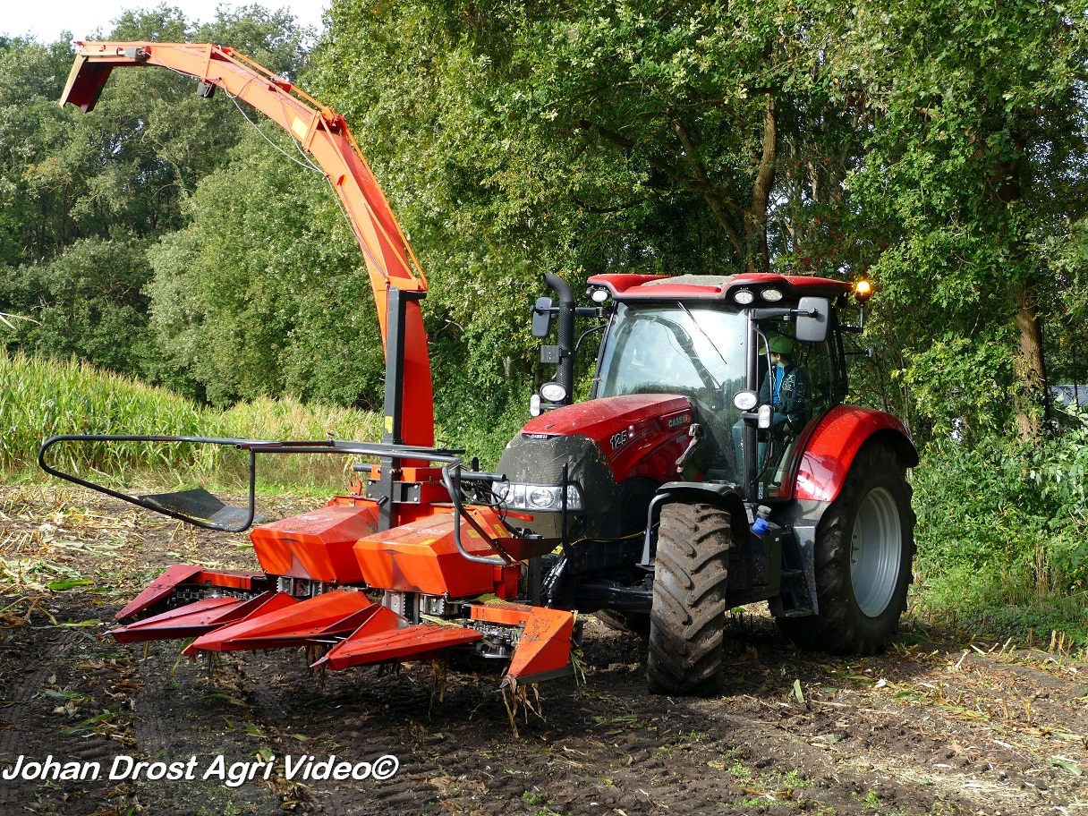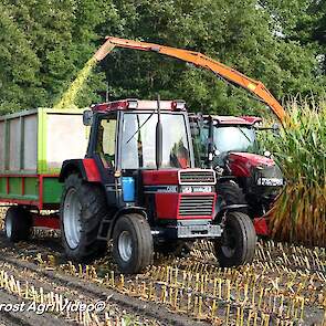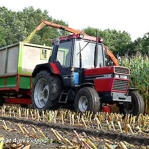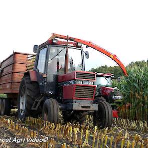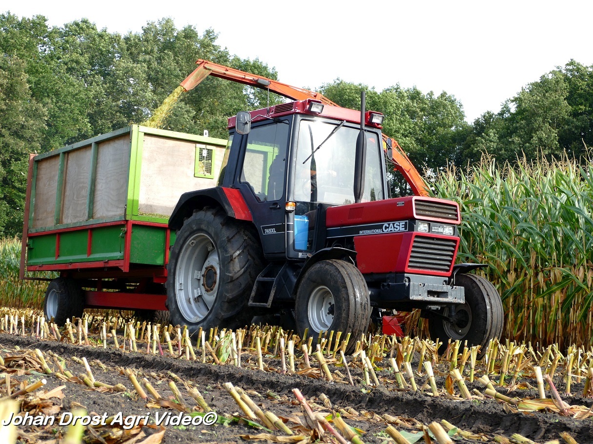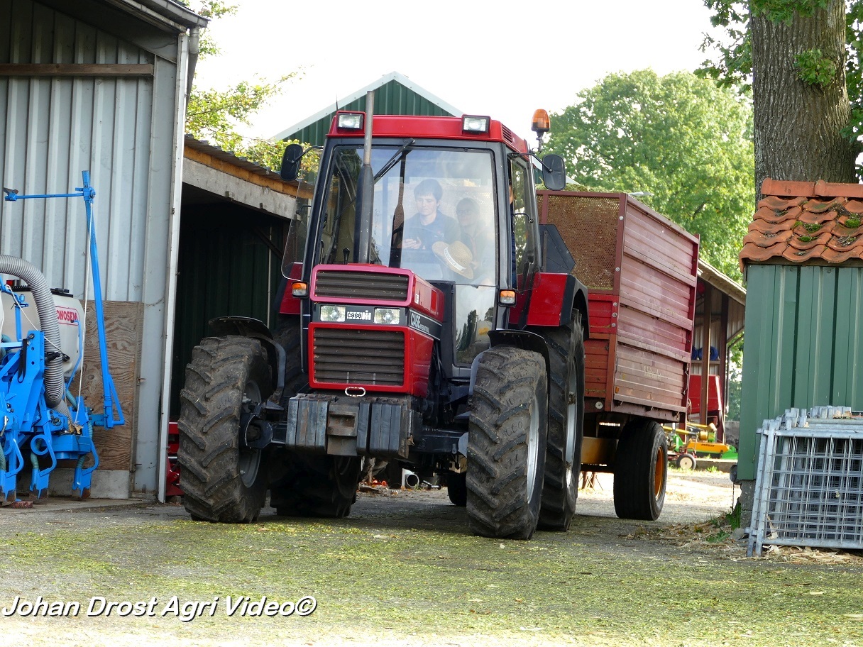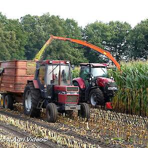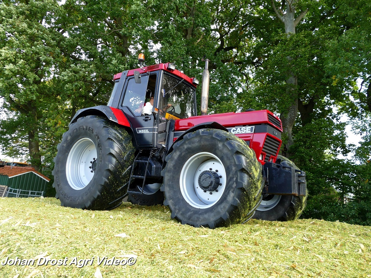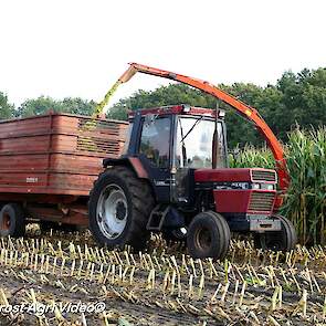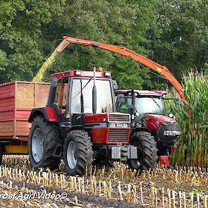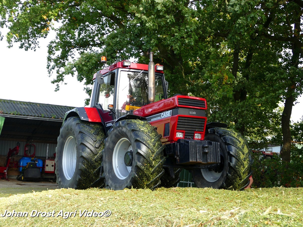 Melkveebedrijf Busweiler uit Nunspeet (GD) aan het maïs hakselen met een Case IH Maxxum 125 met een Kuhn MC 180 S Quattro, een Case International 844Xl, een Case International 845Xl met Schuitemaker-kieper en een Case International 745Xl. Op de kuil een Case International 1455XL en een Volvo L30G van A.V.S. Machineverhuur uit Doornspijk (GD).