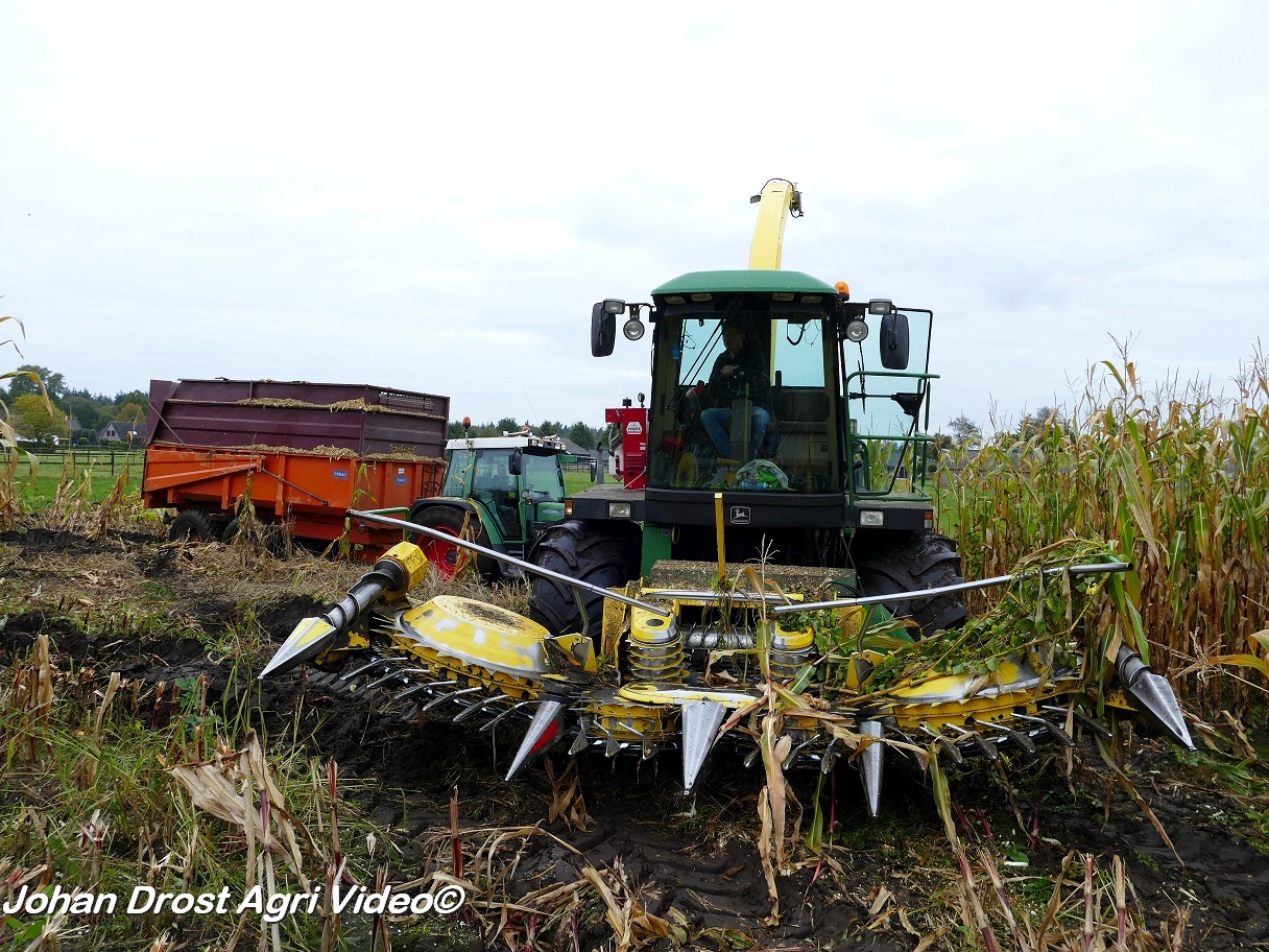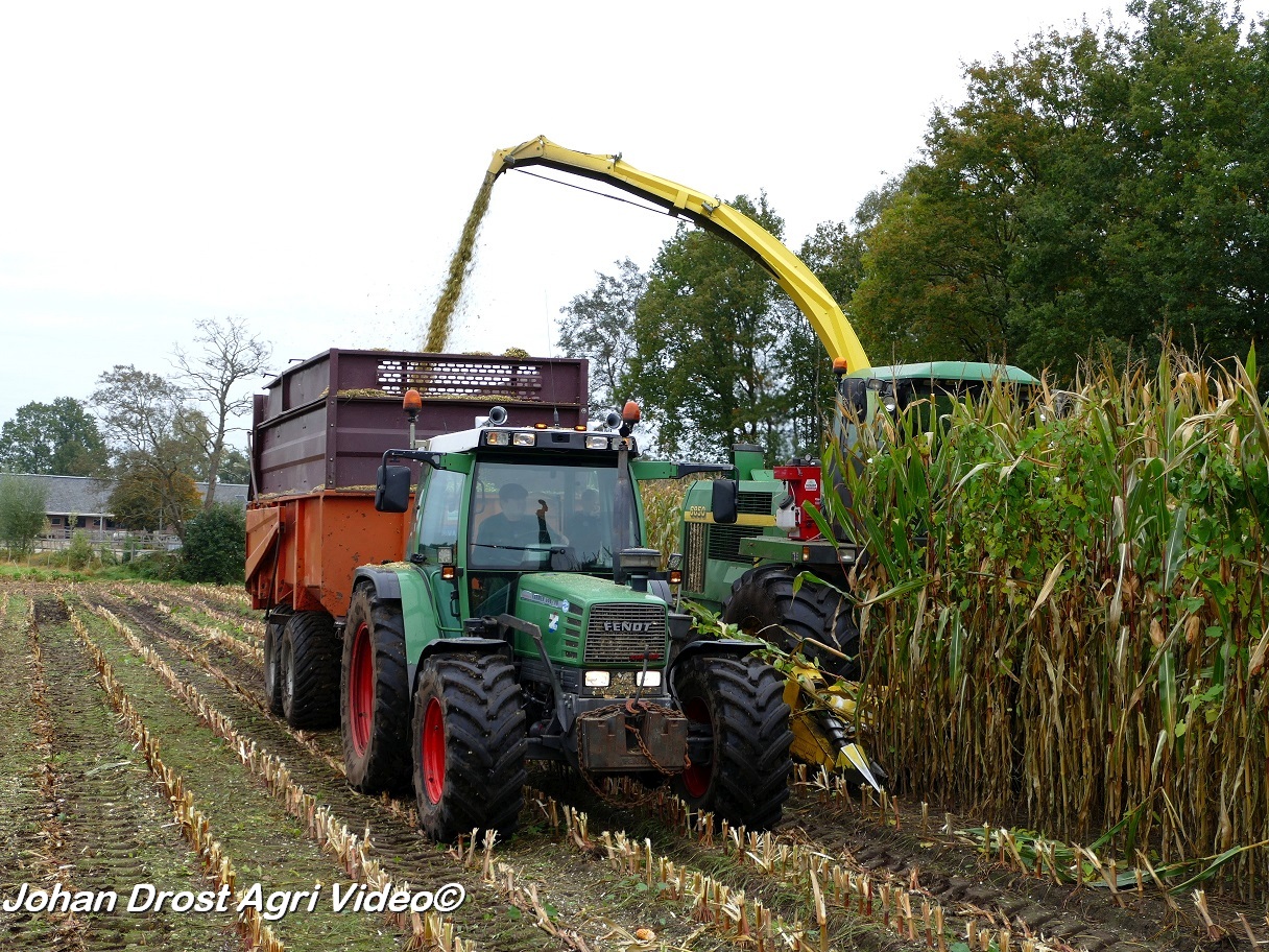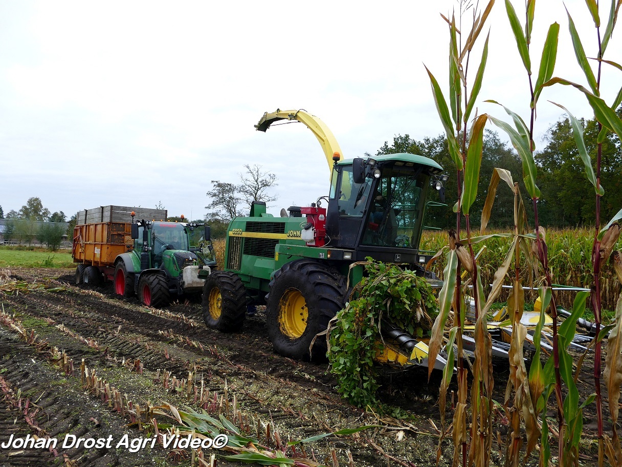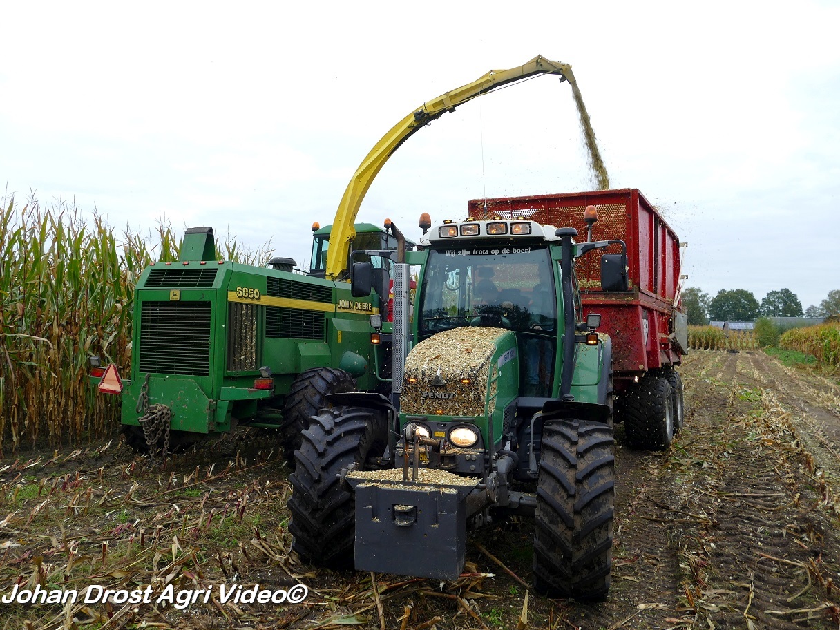 Bloemendal Dienstverlening uit Elspeet (GD) aan het modderen tijdens het maïs hakselen met een John Deere 6850, Fendt 313 Vario met Miedema, Fendt 312 Vario TMS met Beco en Fendt Farmer 308/90 met Vaia.