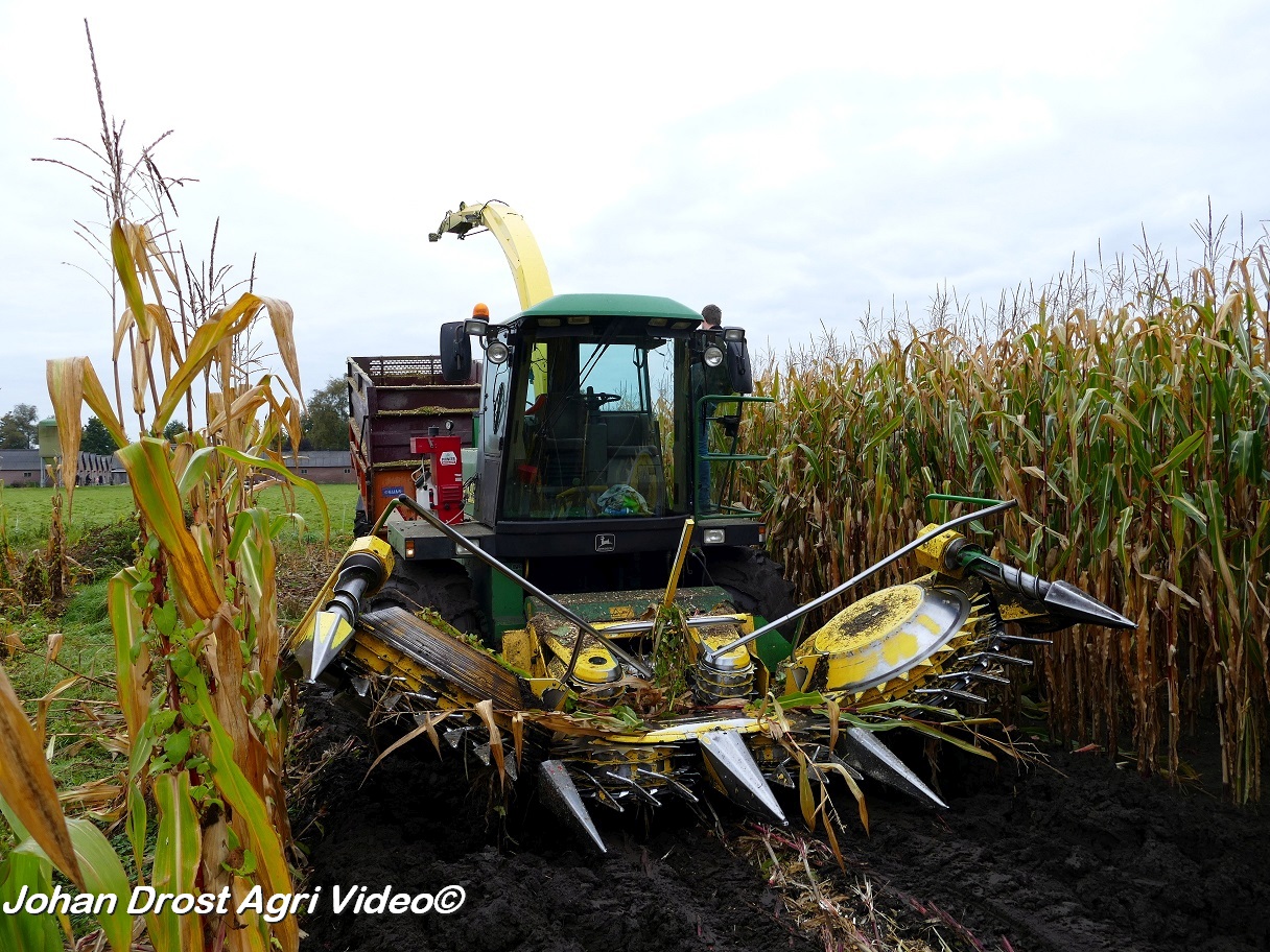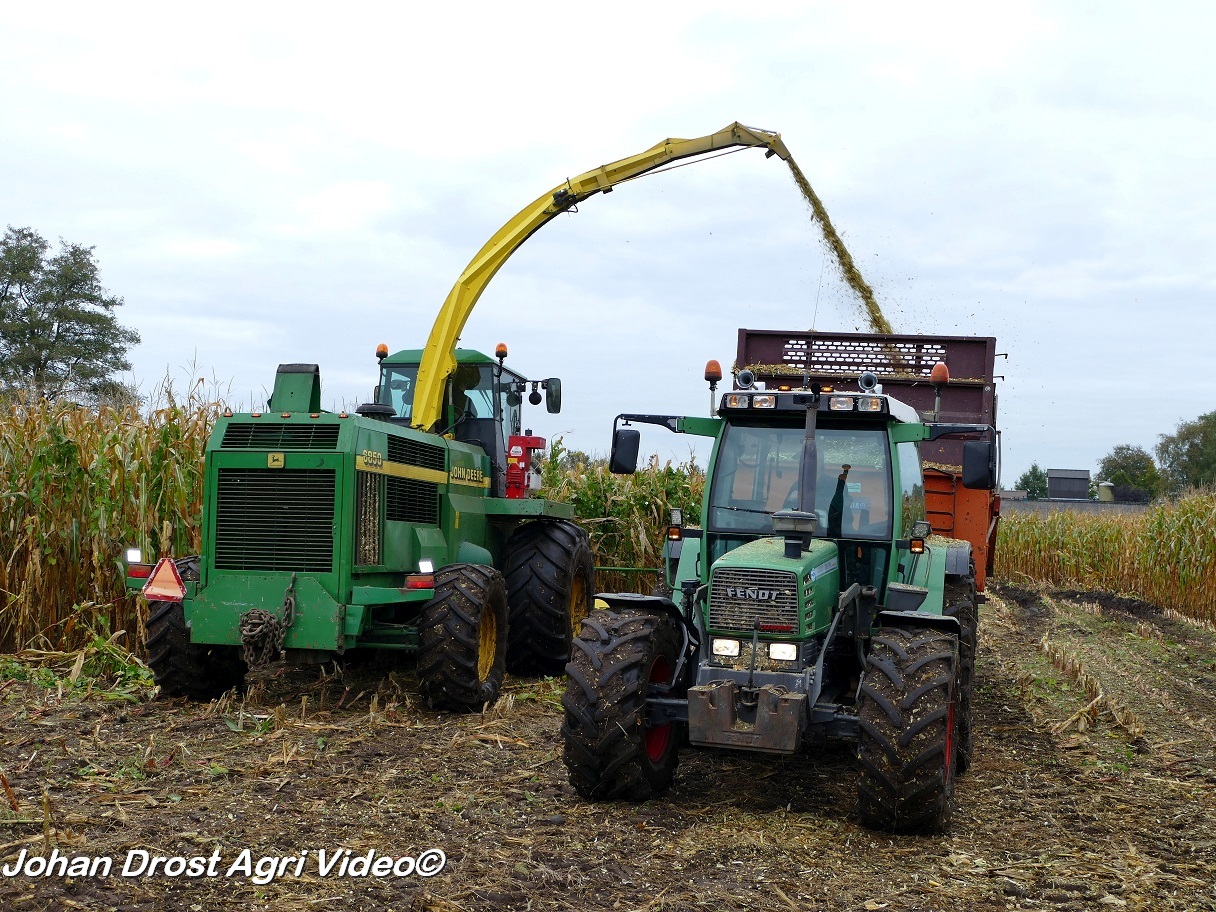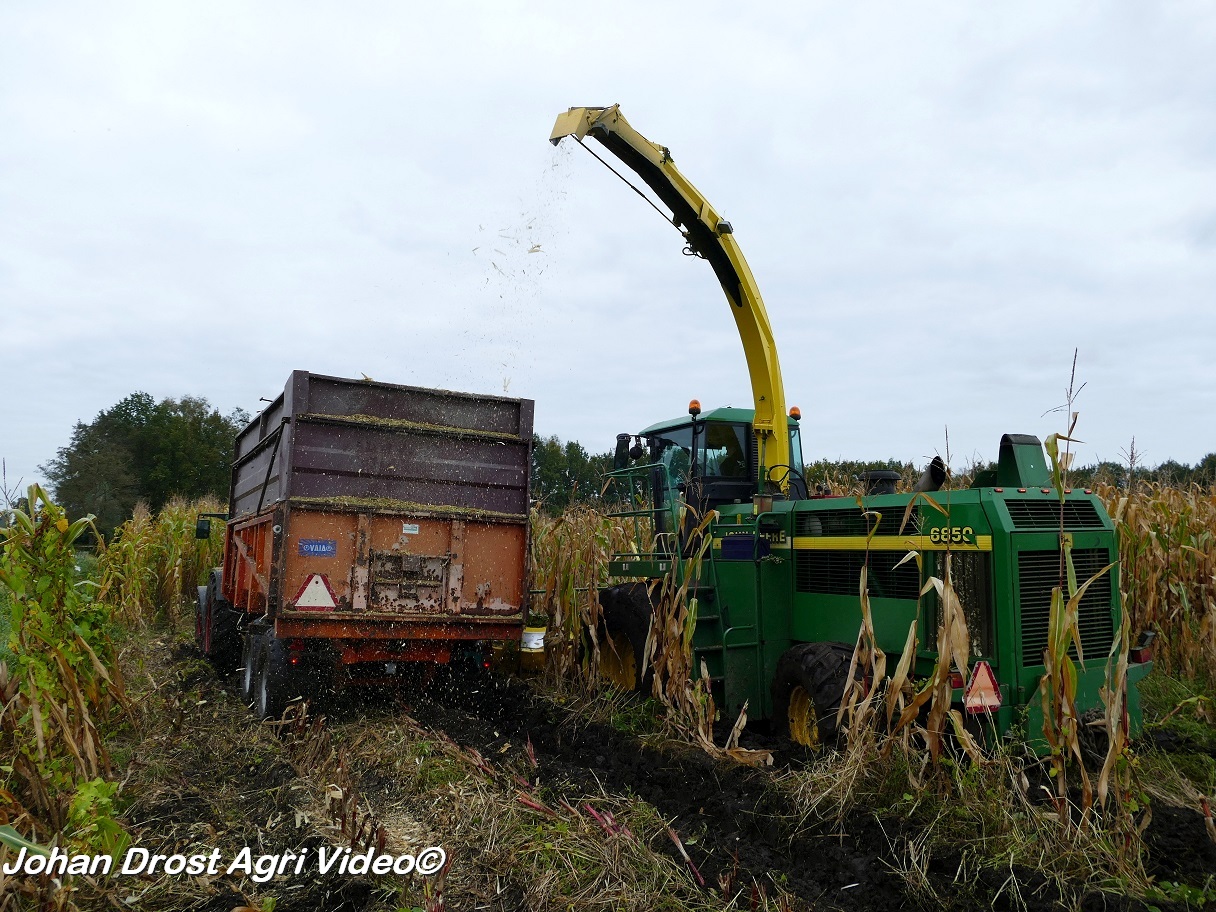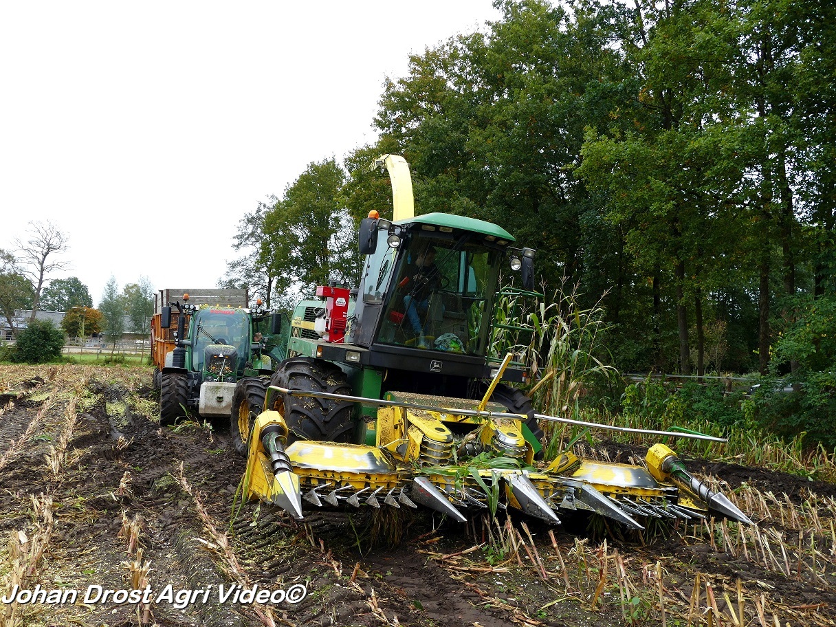 Bloemendal Dienstverlening uit Elspeet (GD) aan het modderen tijdens het maïs hakselen met een John Deere 6850, Fendt 313 Vario met Miedema, Fendt 312 Vario TMS met Beco en Fendt Farmer 308/90 met Vaia.