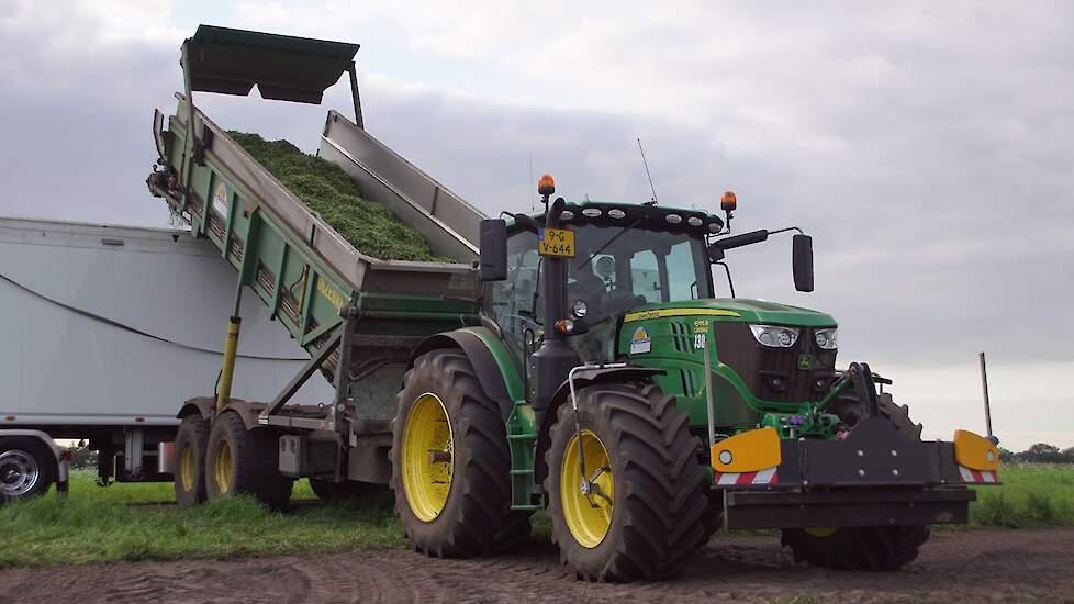 John Deere 6155 R aan het boontjes laden op de vrachtwagen met een Dezeure-hooglosser.