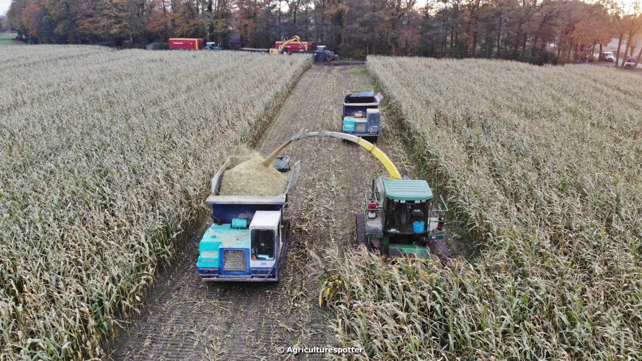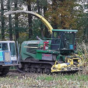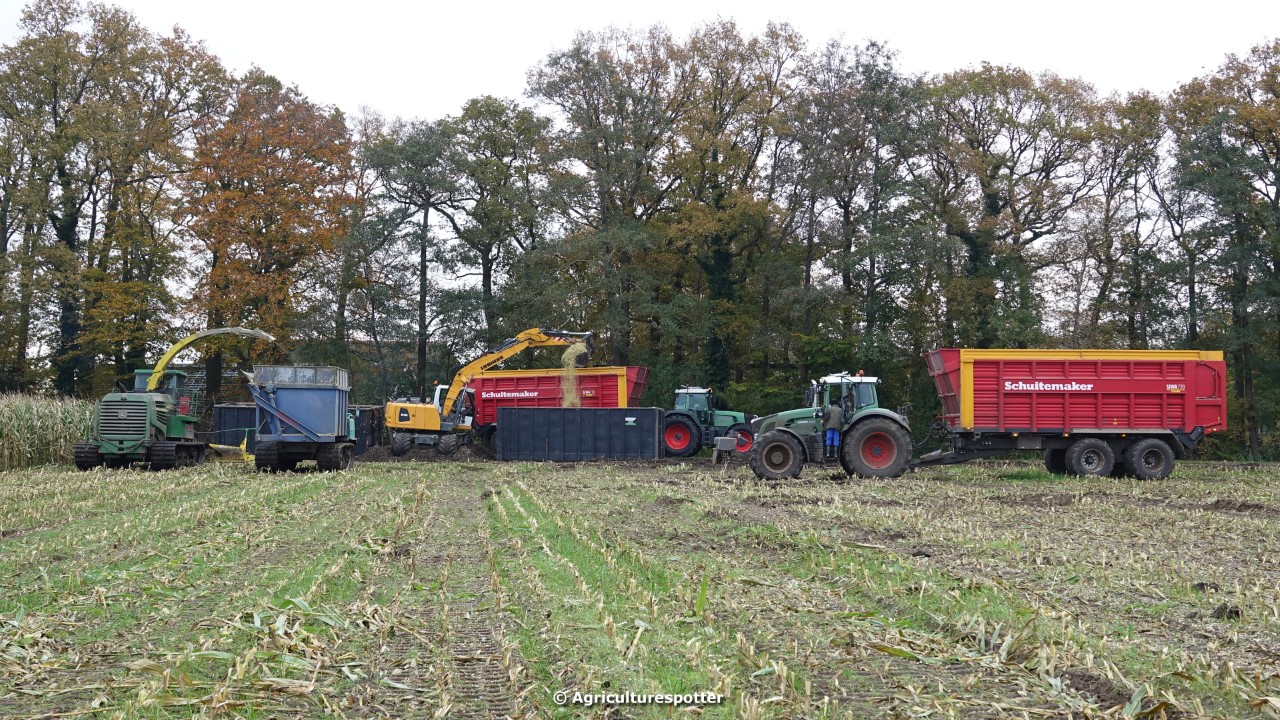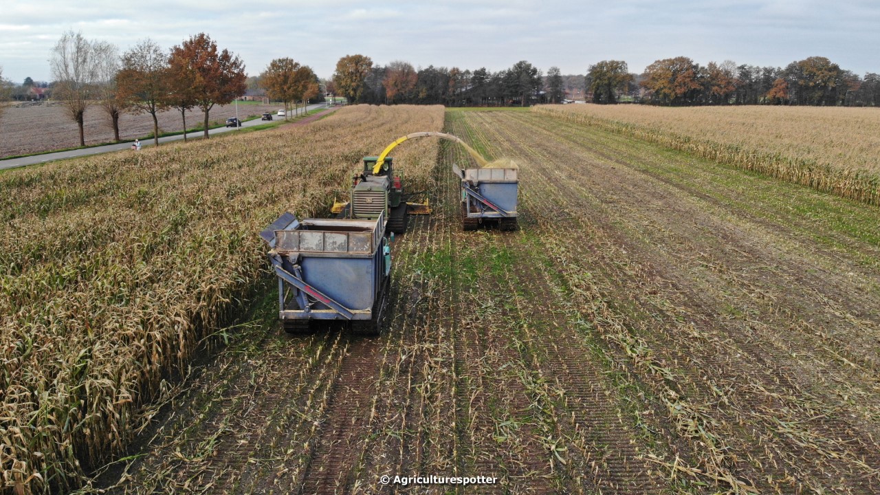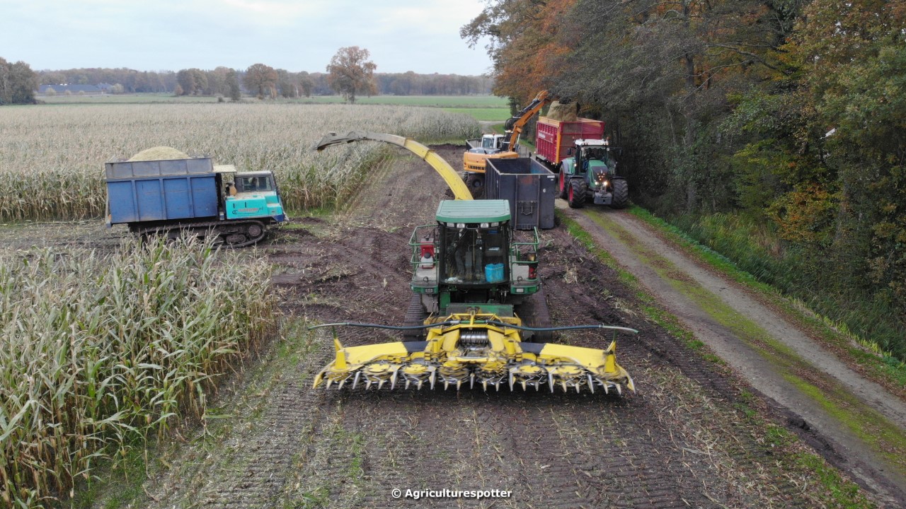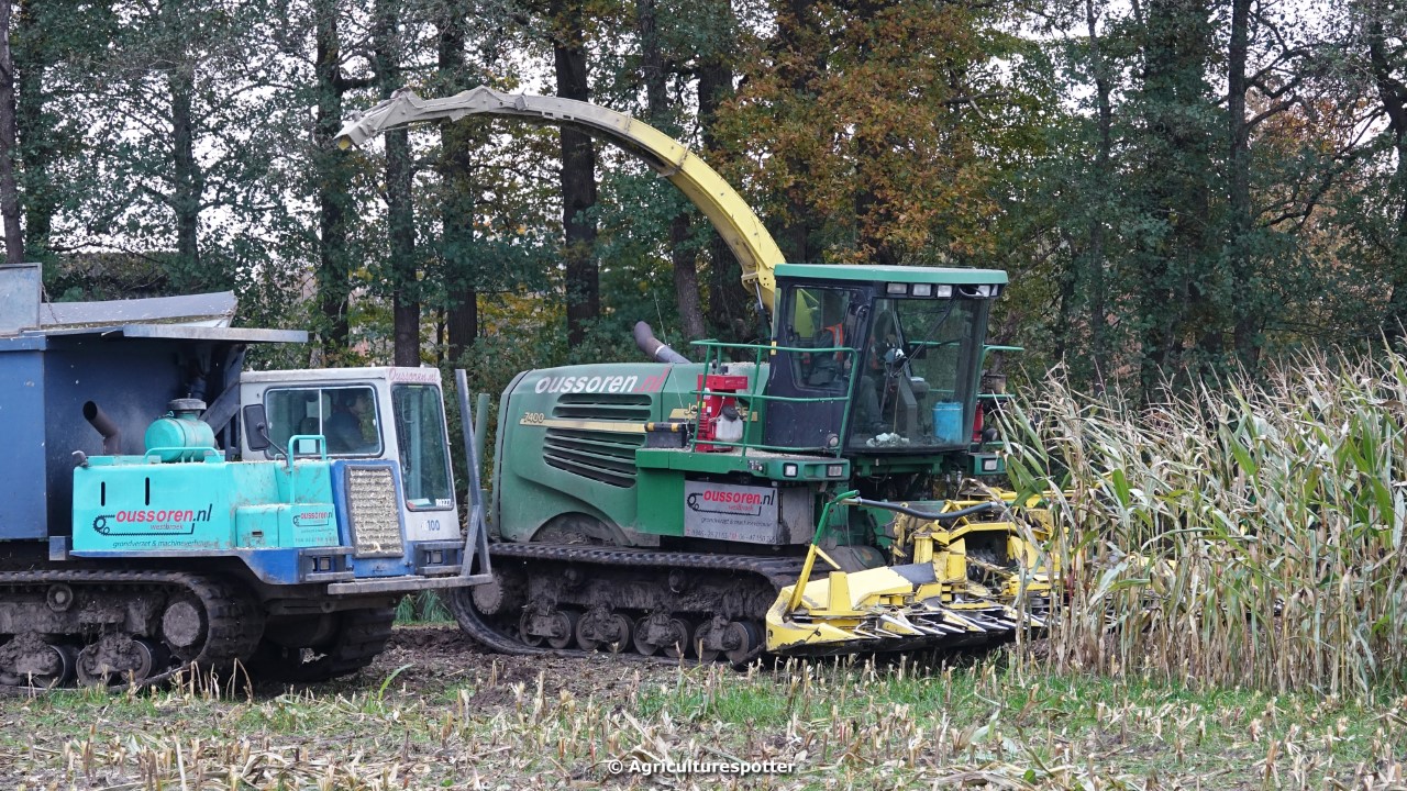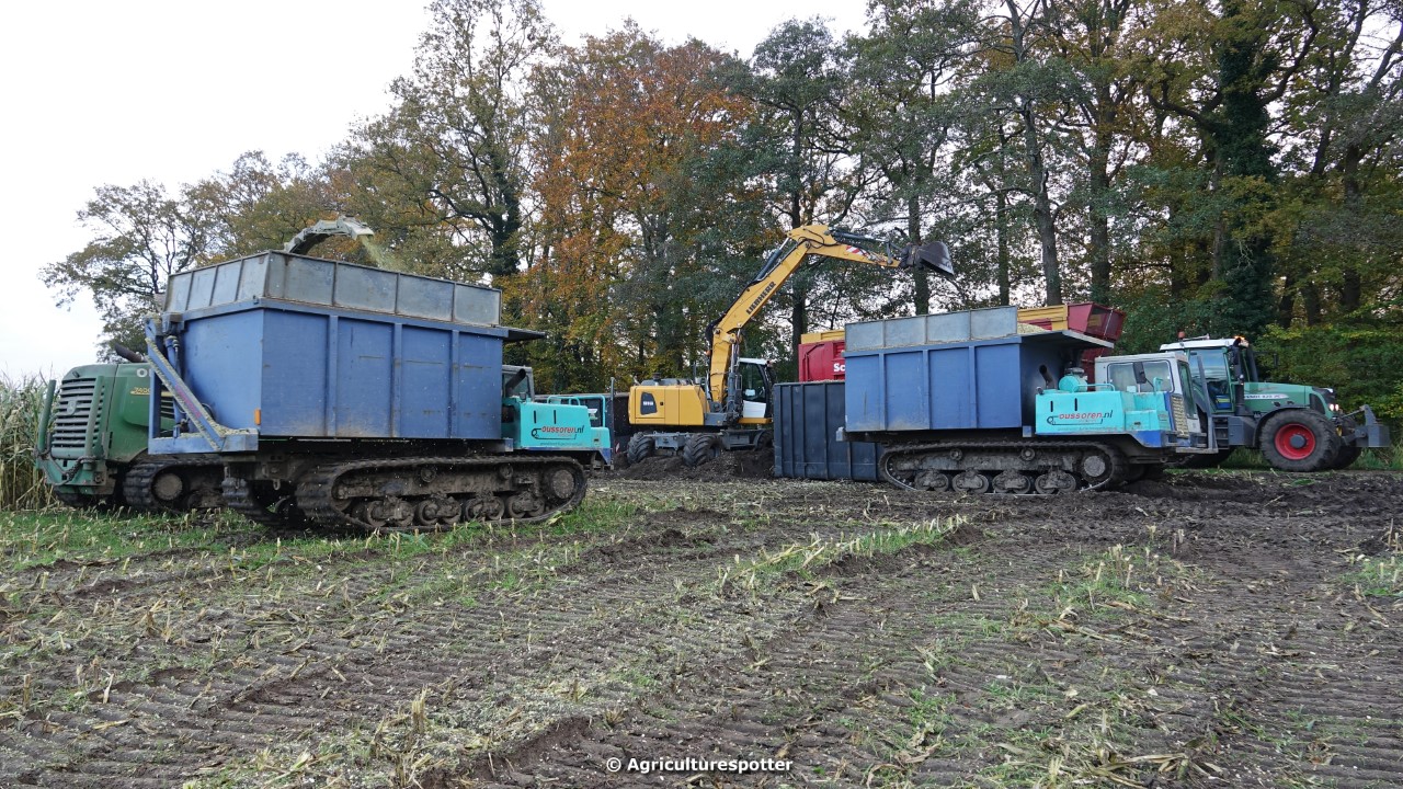 Maïs hakselen in Barneveld (GD) met een John Deere 7400-rupshakselaar van Oussoren grondverzet en machineverhuur uit Westbroek (UT). De maïs werd van het land gereden met rupsdumpers en overgeladen in containers. Er was verwacht dat het land erg nat en modderig zou zijn, maar dat viel gelukkig erg mee. Het transport van de maïs werd gedaan door met een Liebherr 916 de maïs weer over te laden in Fendt's met Schuitemaker-silagewagens van loonbedrijf Gebr. Blankespoor BV uit Harskamp (GD). De maïs ging naar melkveehouder V.O.F. Van Heerikhuize in Lunteren (GD).