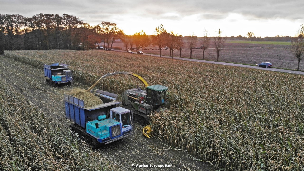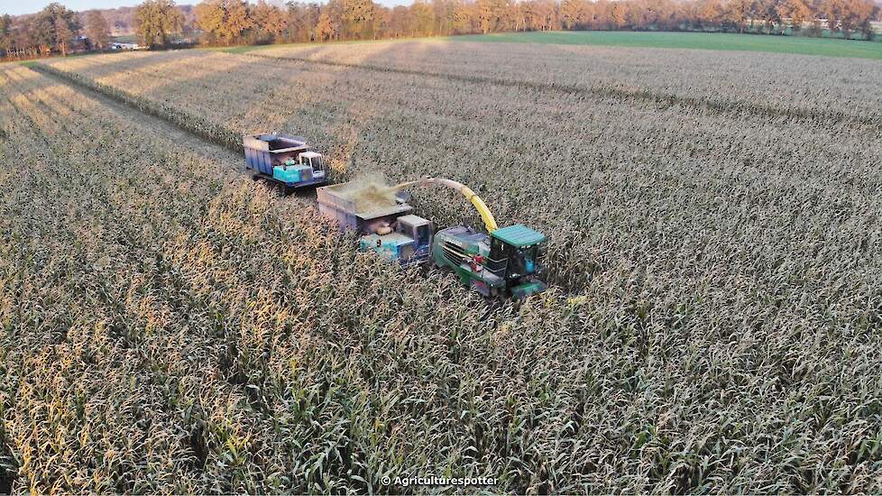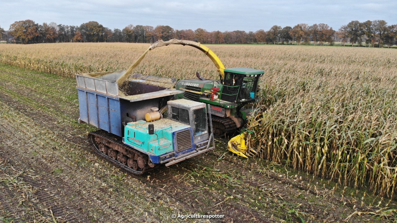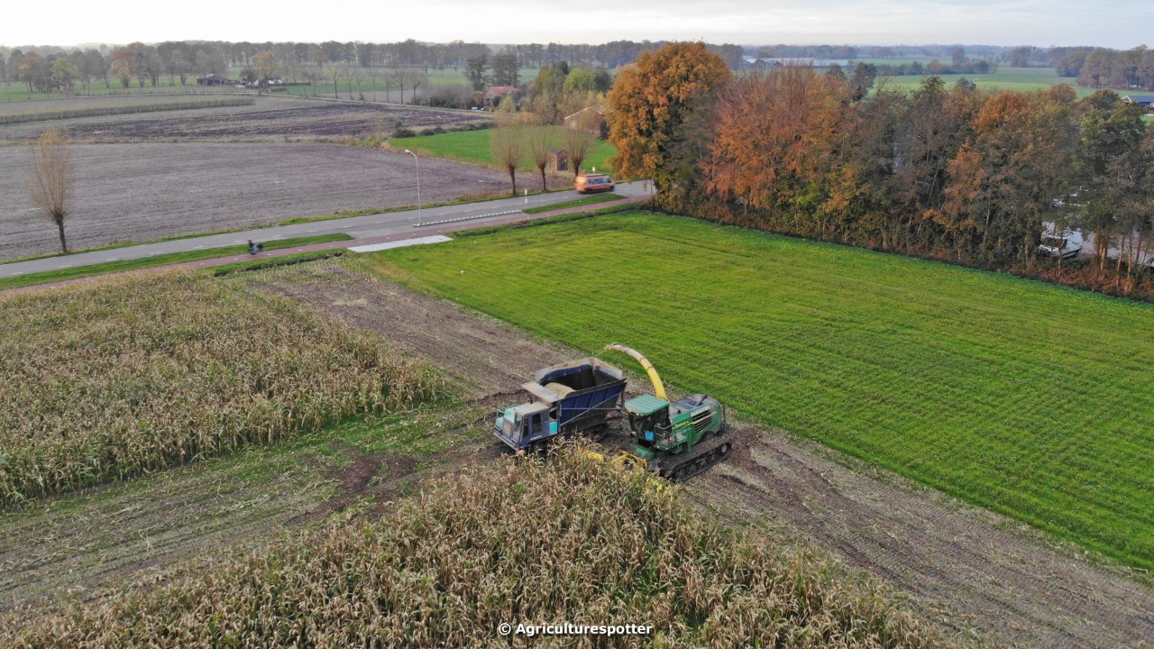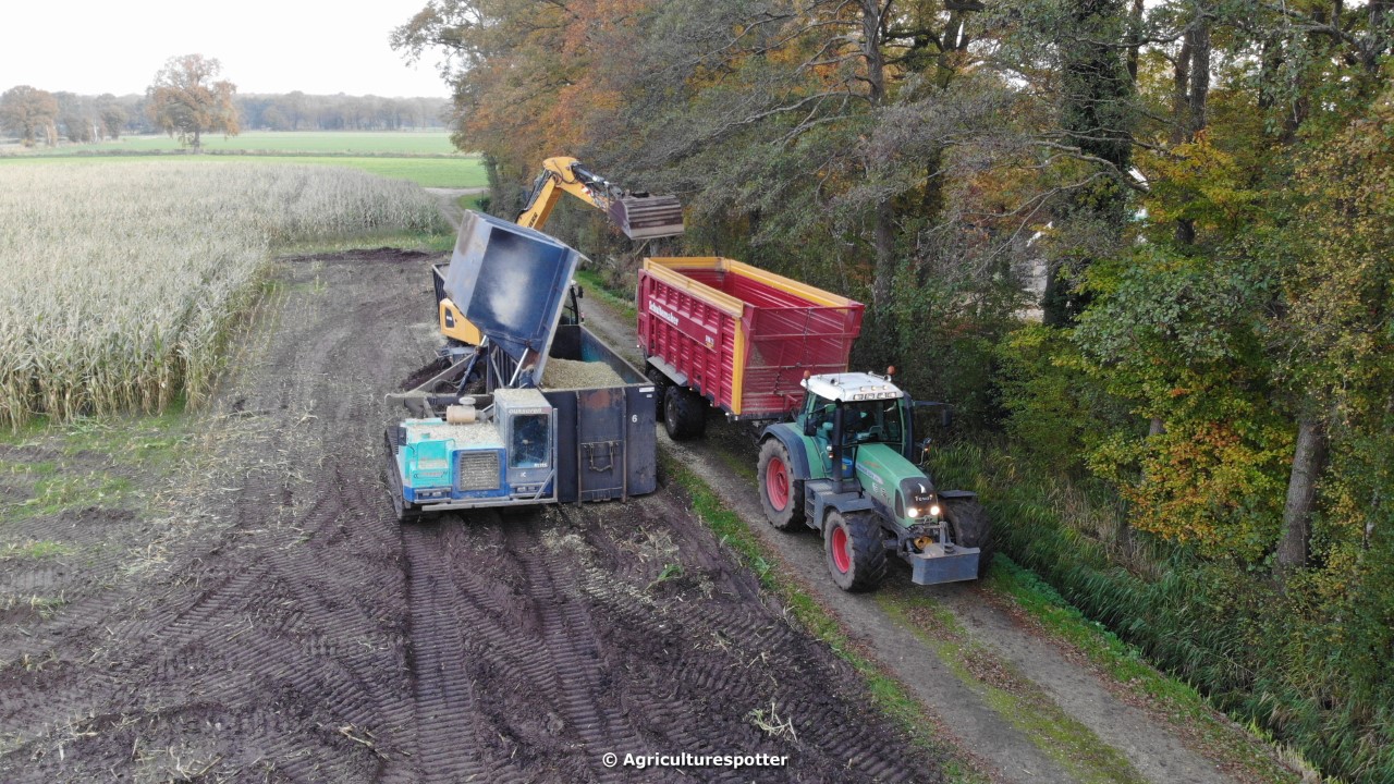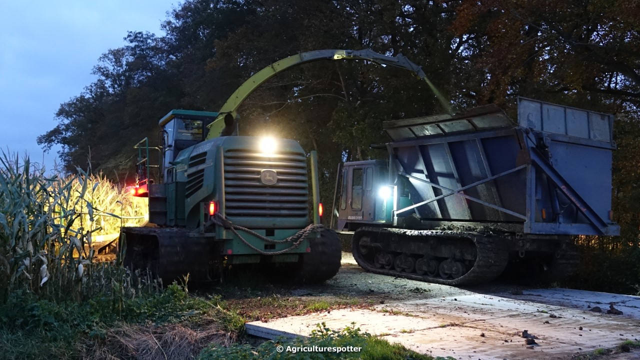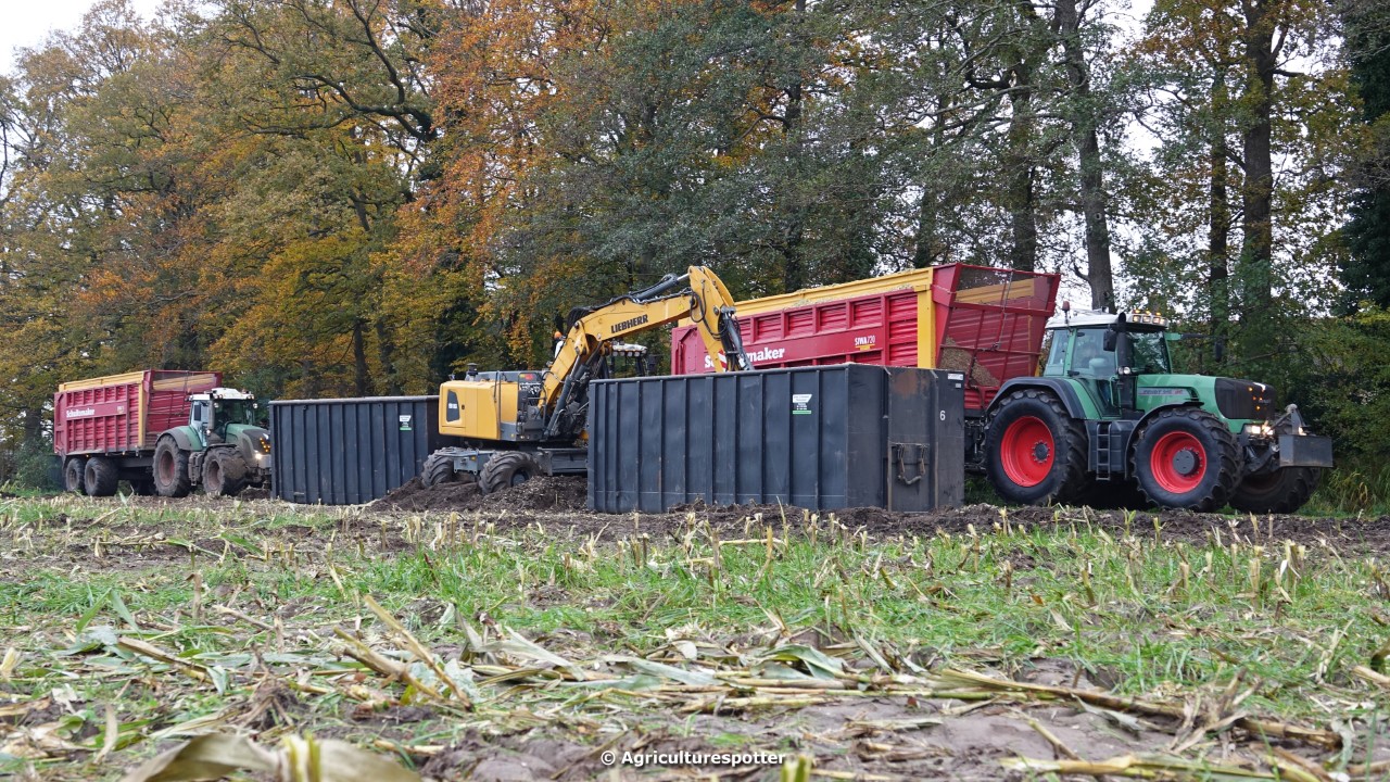 Maïs hakselen in Barneveld (GD) met een John Deere 7400-rupshakselaar van Oussoren grondverzet en machineverhuur uit Westbroek (UT). De maïs werd van het land gereden met rupsdumpers en overgeladen in containers. Er was verwacht dat het land erg nat en modderig zou zijn, maar dat viel gelukkig erg mee. Het transport van de maïs werd gedaan door met een Liebherr 916 de maïs weer over te laden in Fendt's met Schuitemaker-silagewagens van loonbedrijf Gebr. Blankespoor BV uit Harskamp (GD). De maïs ging naar melkveehouder V.O.F. Van Heerikhuize in Lunteren (GD).