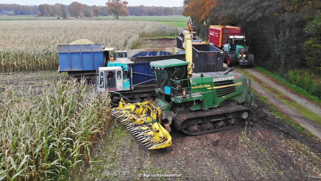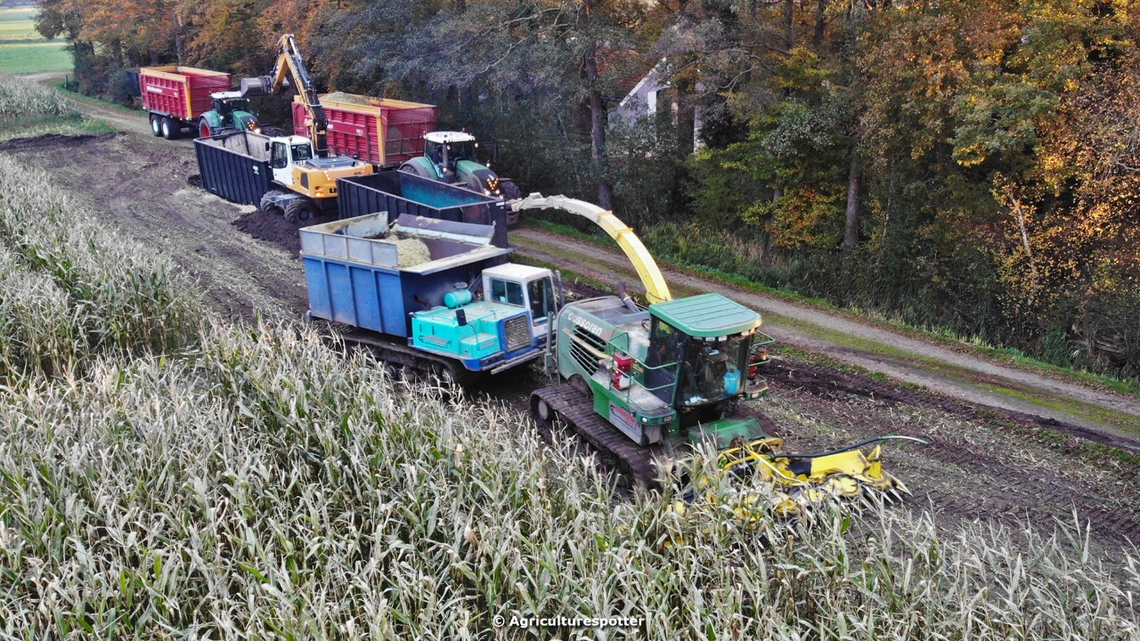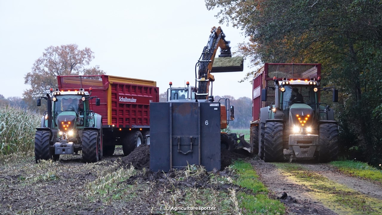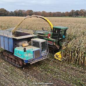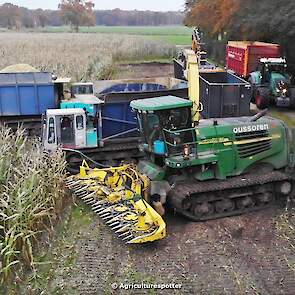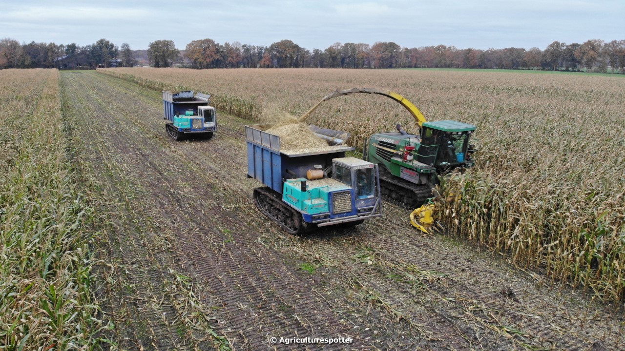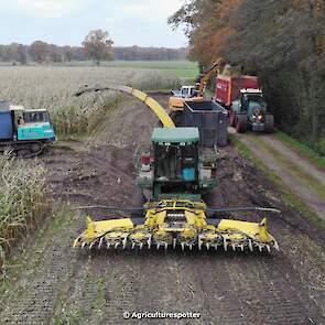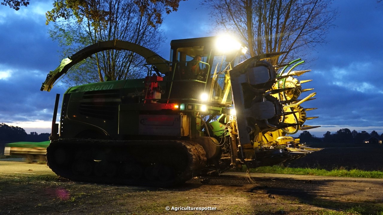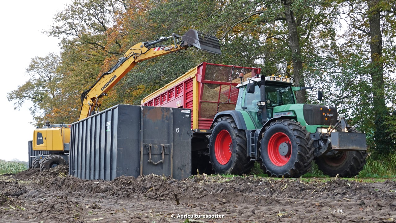 Maïs hakselen in Barneveld (GD) met een John Deere 7400-rupshakselaar van Oussoren grondverzet en machineverhuur uit Westbroek (UT). De maïs werd van het land gereden met rupsdumpers en overgeladen in containers. Er was verwacht dat het land erg nat en modderig zou zijn, maar dat viel gelukkig erg mee. Het transport van de maïs werd gedaan door met een Liebherr 916 de maïs weer over te laden in Fendt's met Schuitemaker-silagewagens van loonbedrijf Gebr. Blankespoor BV uit Harskamp (GD). De maïs ging naar melkveehouder V.O.F. Van Heerikhuize in Lunteren (GD).