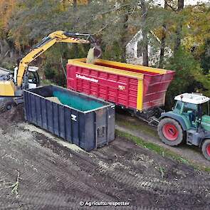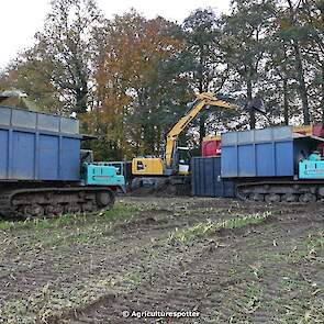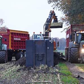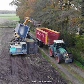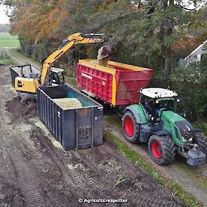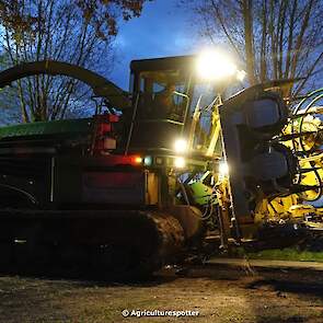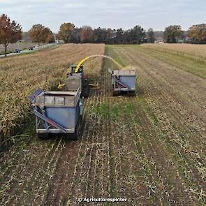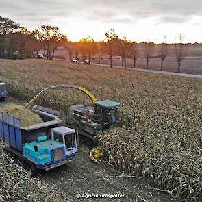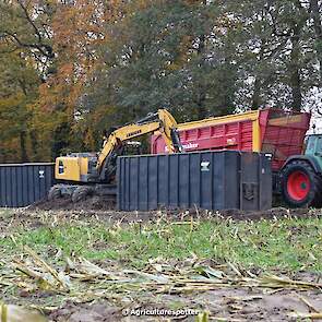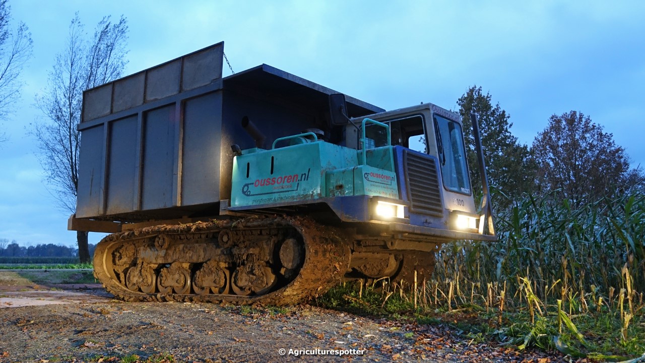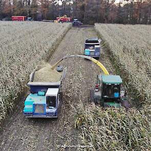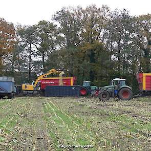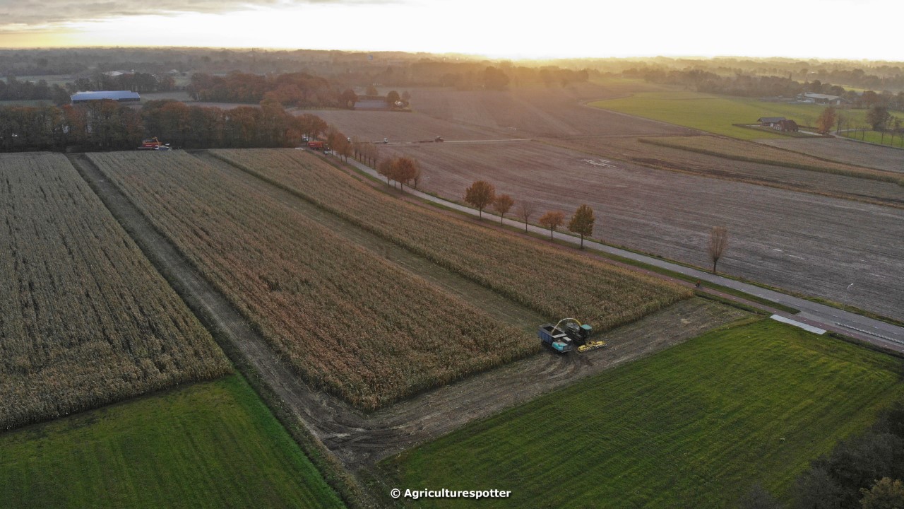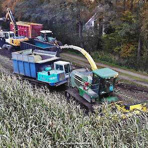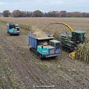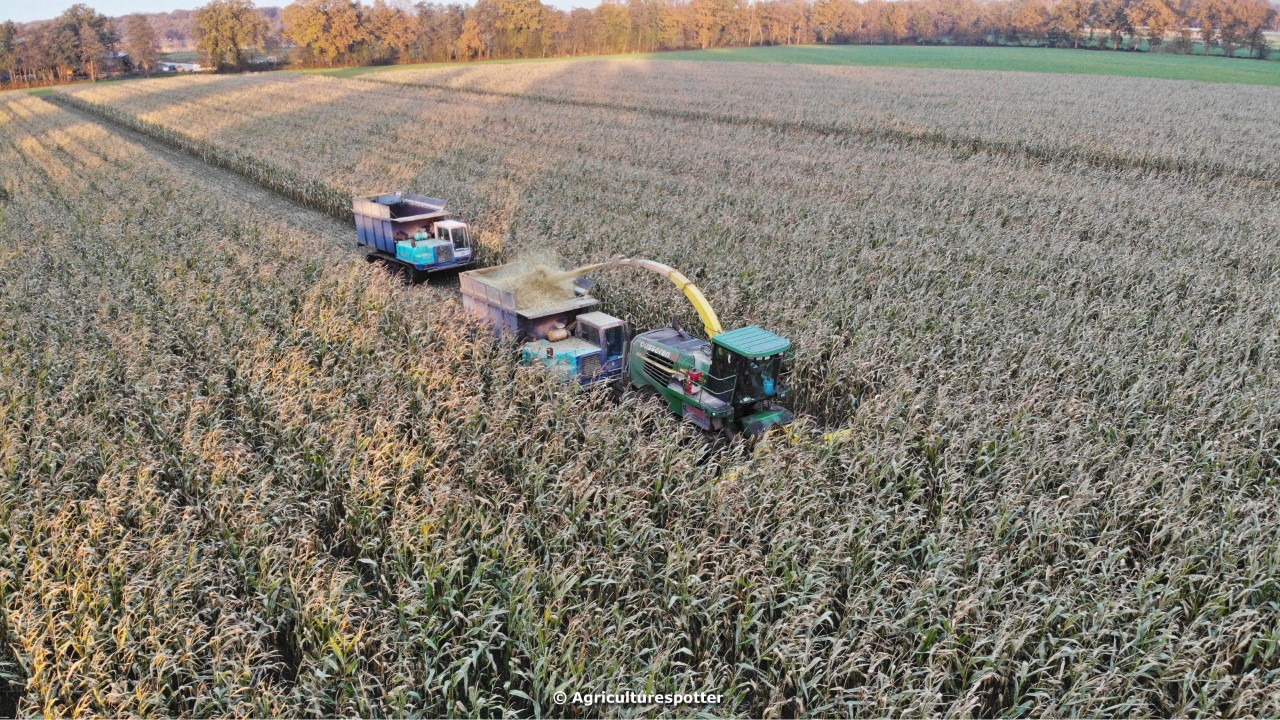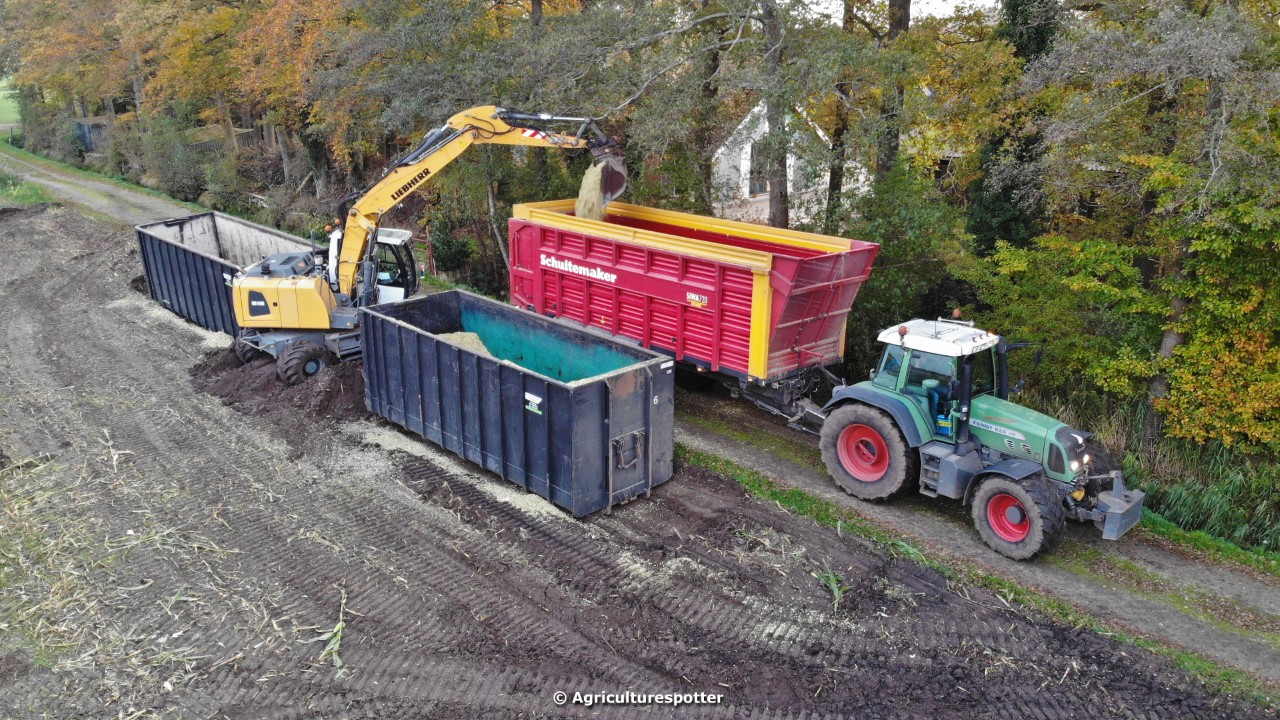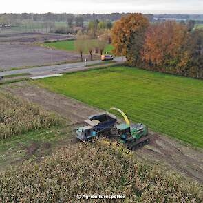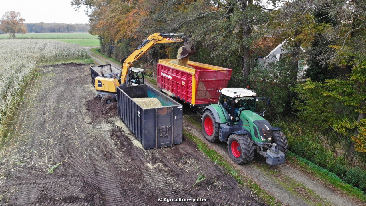 Maïs hakselen in Barneveld (GD) met een John Deere 7400-rupshakselaar van Oussoren grondverzet en machineverhuur uit Westbroek (UT). De maïs werd van het land gereden met rupsdumpers en overgeladen in containers. Er was verwacht dat het land erg nat en modderig zou zijn, maar dat viel gelukkig erg mee. Het transport van de maïs werd gedaan door met een Liebherr 916 de maïs weer over te laden in Fendt's met Schuitemaker-silagewagens van loonbedrijf Gebr. Blankespoor BV uit Harskamp (GD). De maïs ging naar melkveehouder V.O.F. Van Heerikhuize in Lunteren (GD).