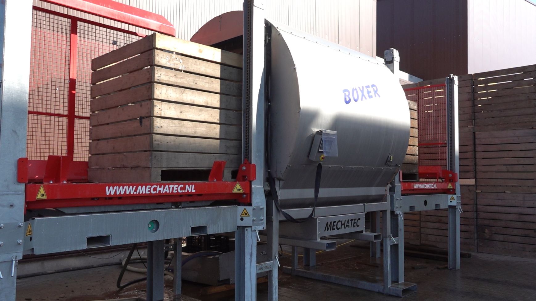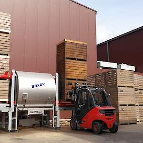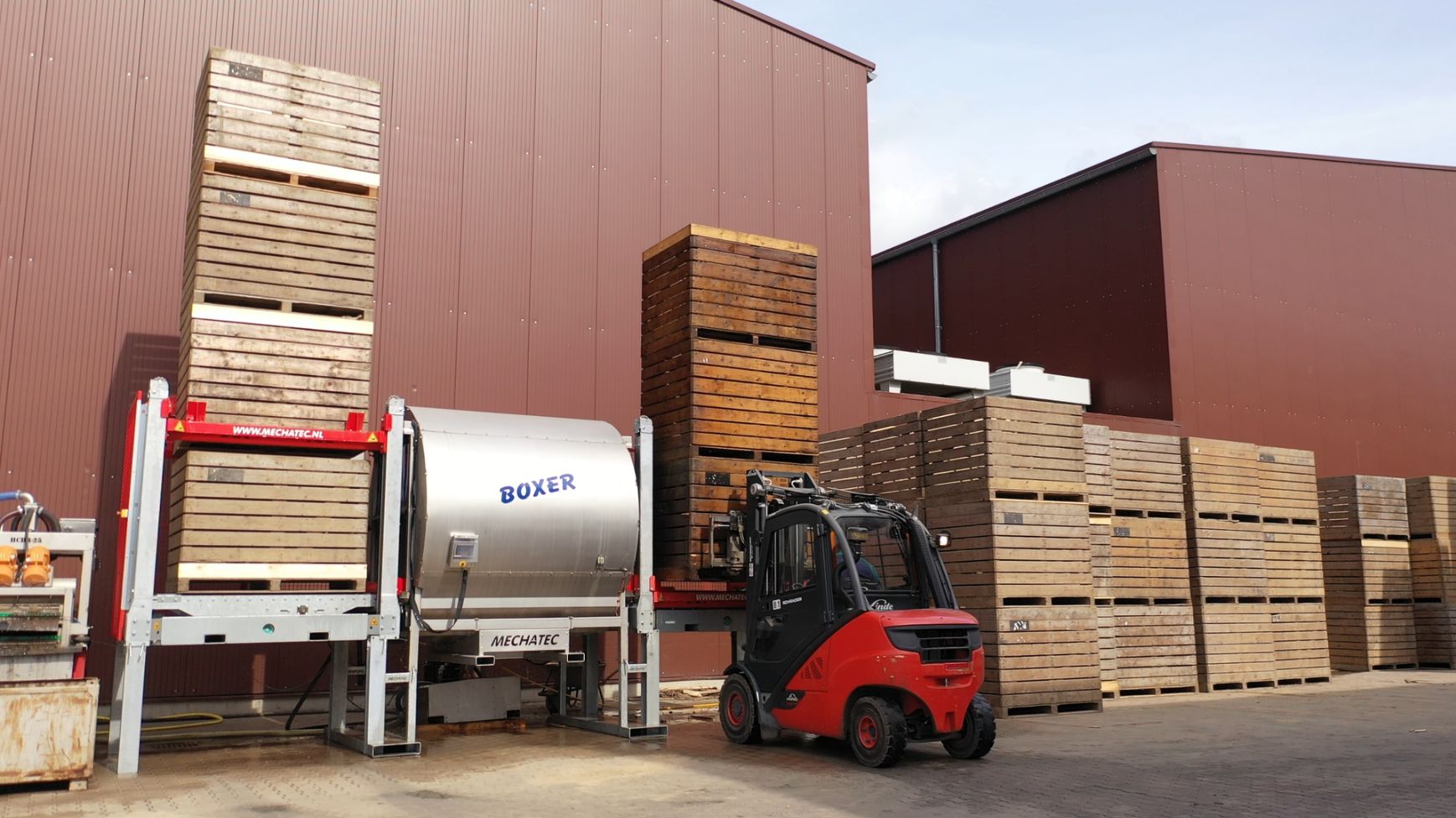 Bij Brun GmbH & Co in Borken maakt de Mechatec Boxer kistenwasser nog snel even de laatste 2000 wortelkisten schoon.