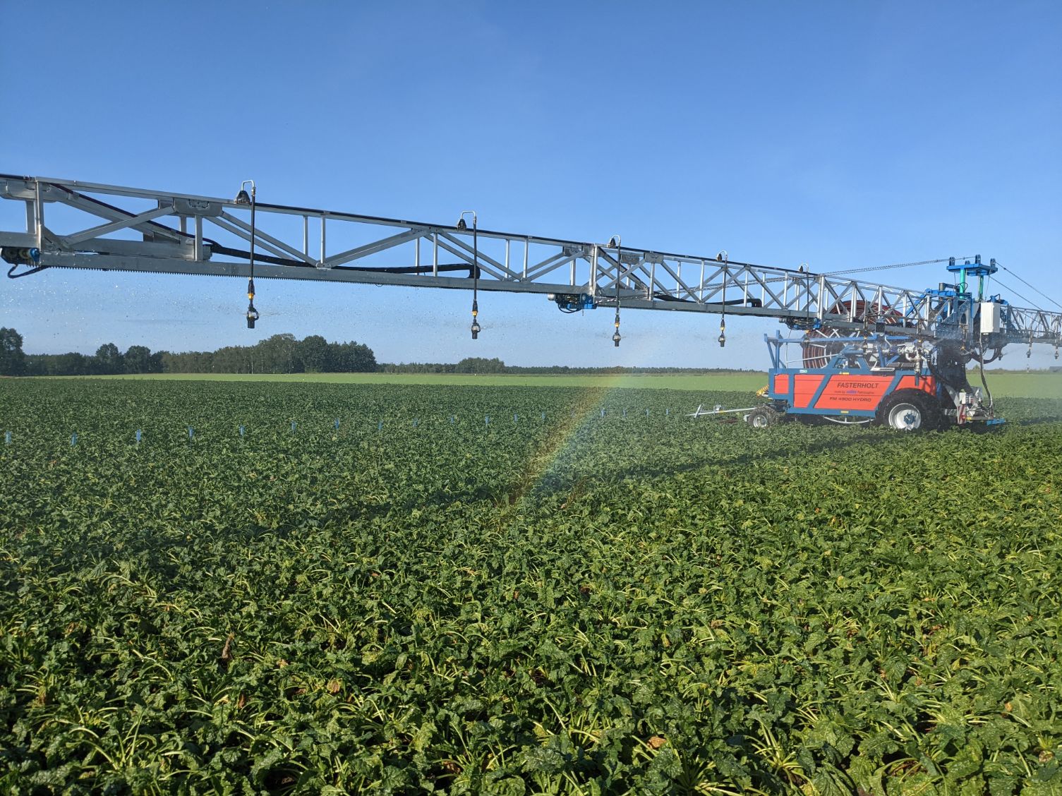 Fasterholt uit Denemarken komt met een 66 meter sproeiboom voor haar zelfrijdende beregeningsinstallatie. De nozzles op de boom zitten laag bij de grond en werken bij een druk van 1-2 bar. Er verdampt weinig water, heet systeem is weinig gevoelig voor wind en de grond slaat niet dicht. Op de haspel van de zelfrijder kan ongeveer 1.000 meter slang.