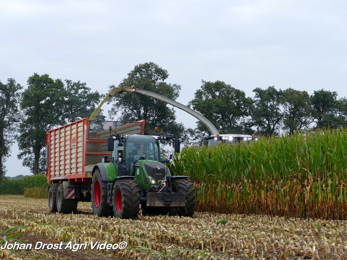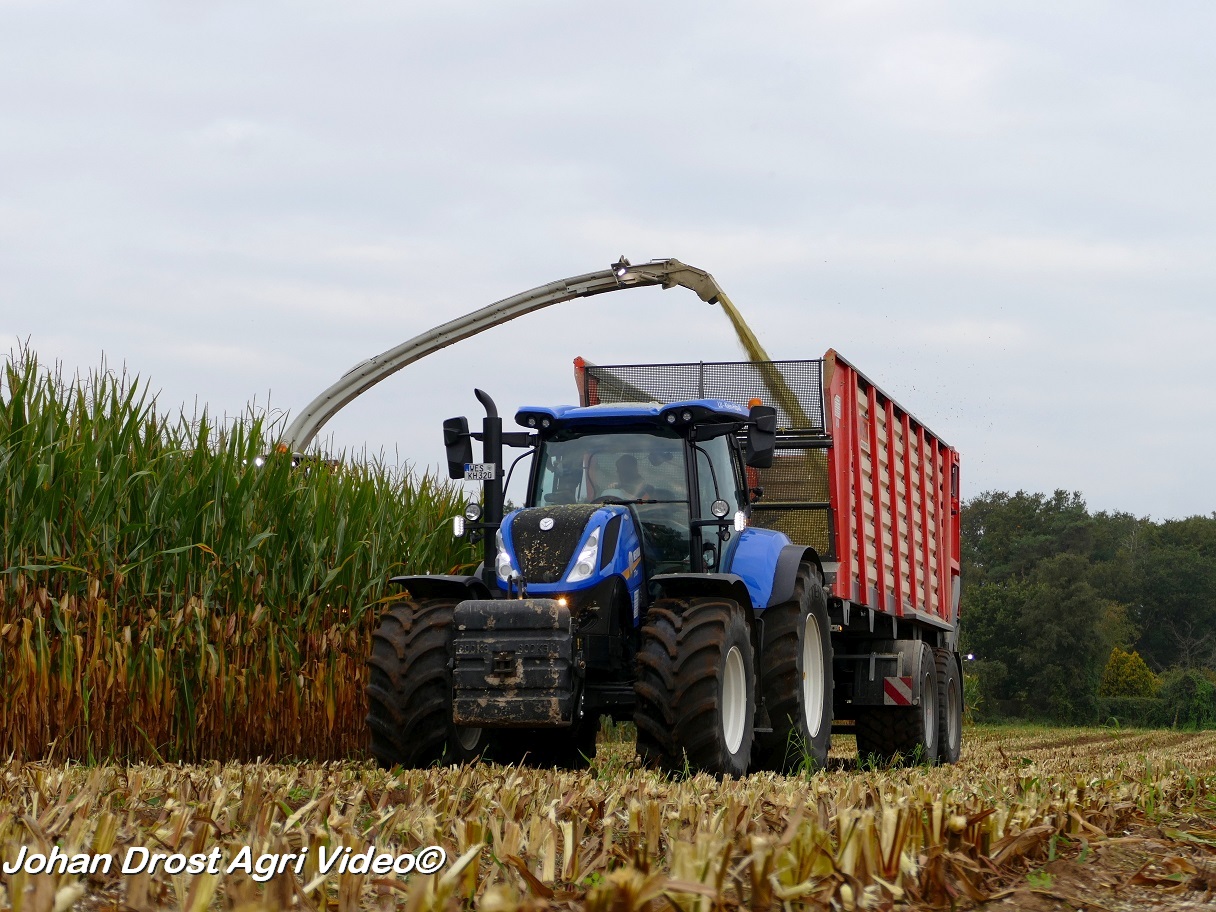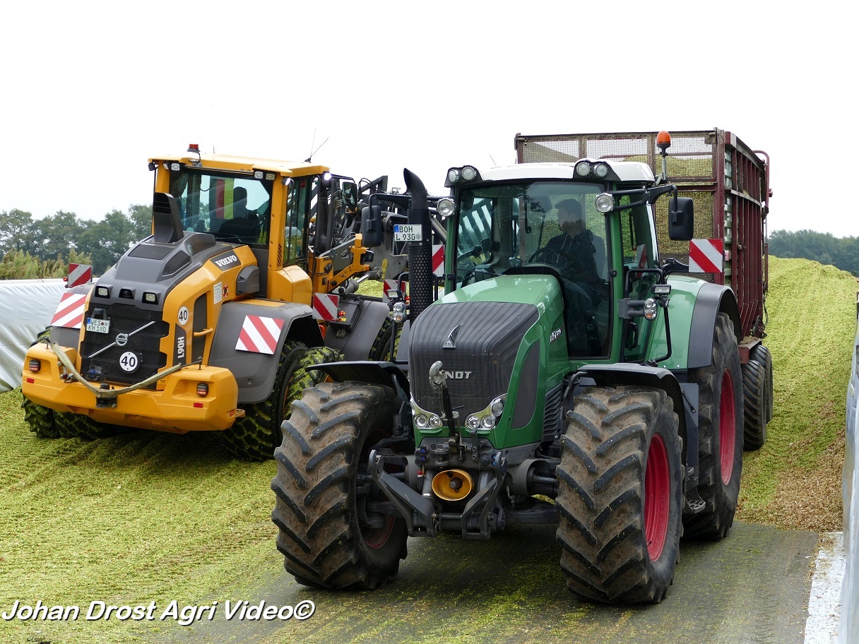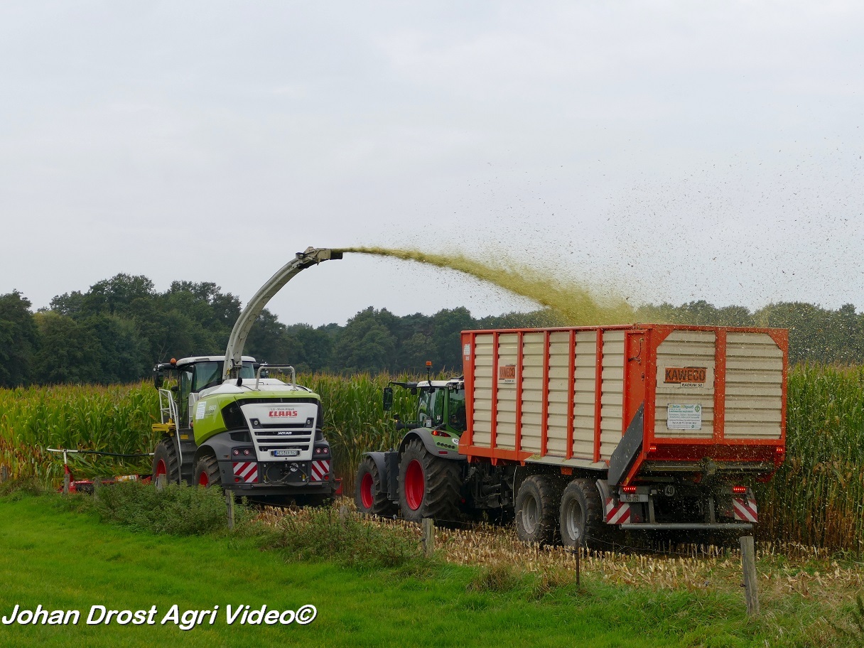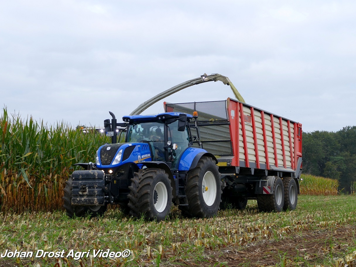 LU Klein Hitpaß uit Hamminkeln (DE) aan het maïs hakselen met een Claas Jaguar 960 (10-rijer), een New Holland T7.230 met Kaweco Radium 250, een Fendt 724 Vario met Kaweco Radium 50 en een Fendt 930 Vario met Strautmann Mega Trailer II DO. Op de kuil een Volvo L90H.