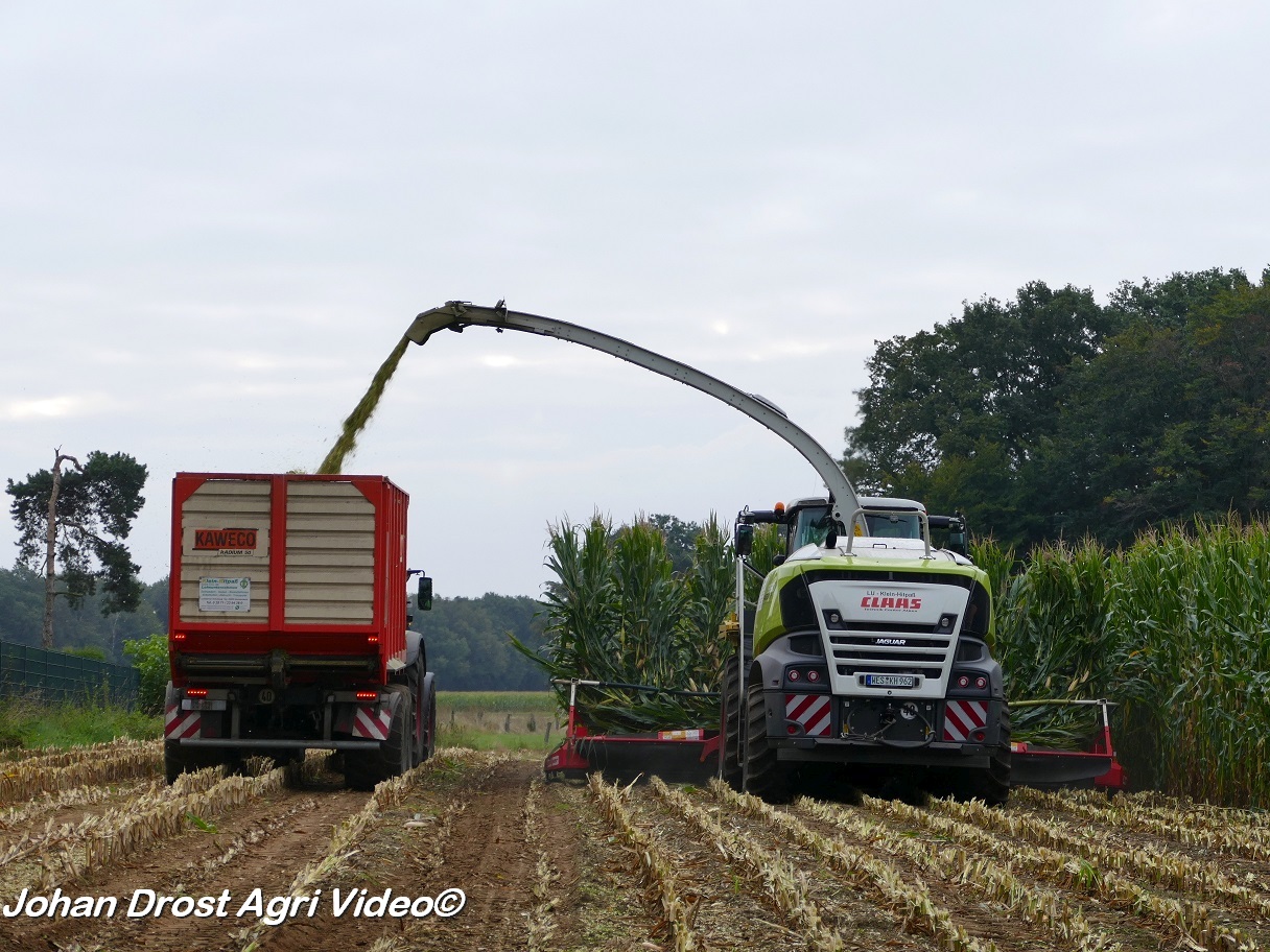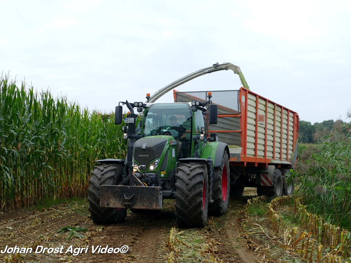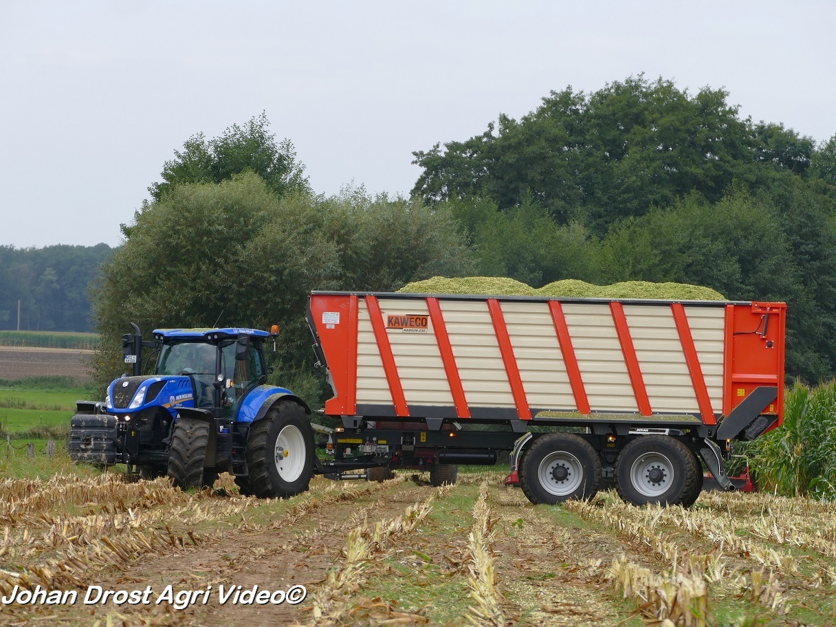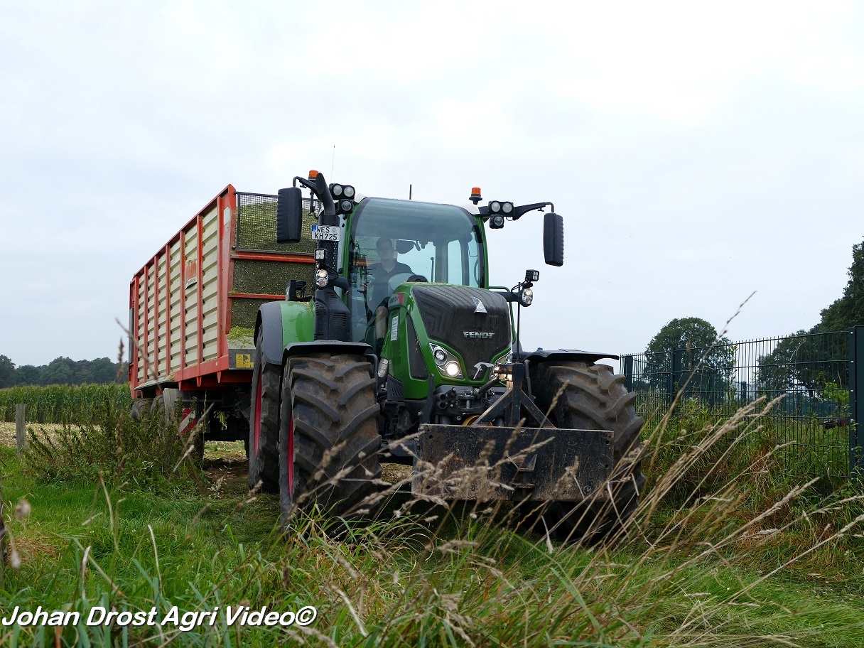LU Klein Hitpaß uit Hamminkeln (DE) aan het maïs hakselen met een Claas Jaguar 960 (10-rijer), een New Holland T7.230 met Kaweco Radium 250, een Fendt 724 Vario met Kaweco Radium 50 en een Fendt 930 Vario met Strautmann Mega Trailer II DO. Op de kuil een Volvo L90H.