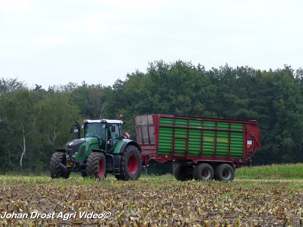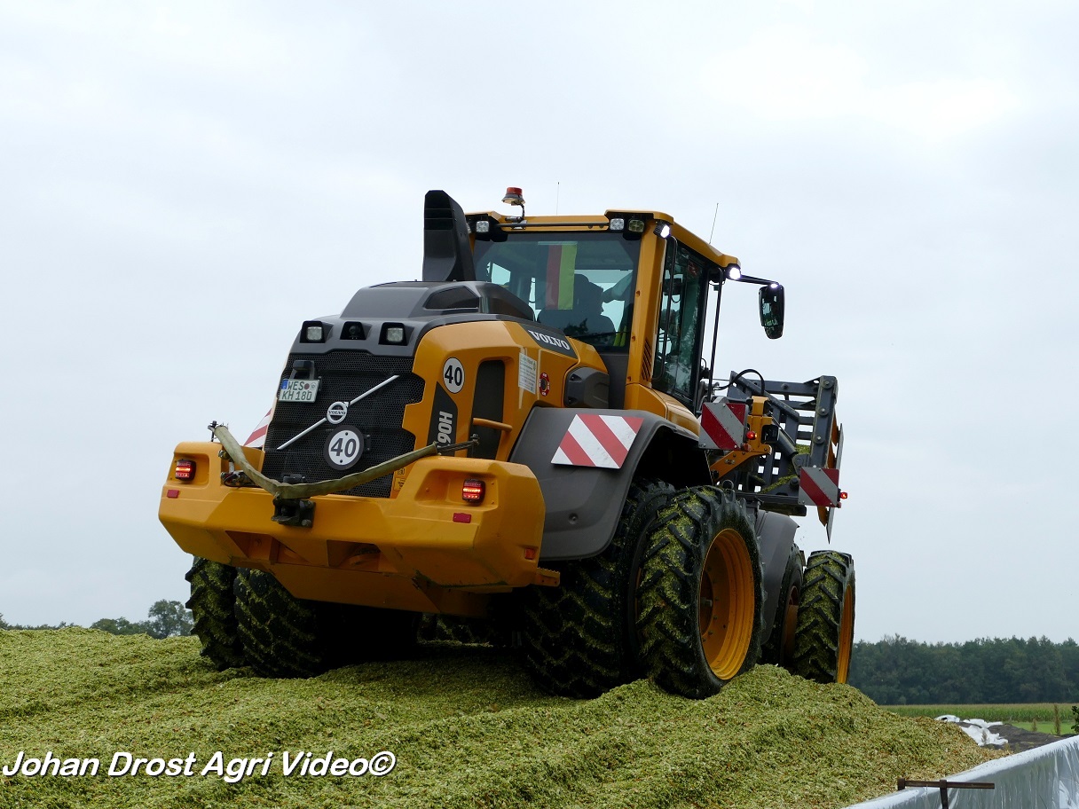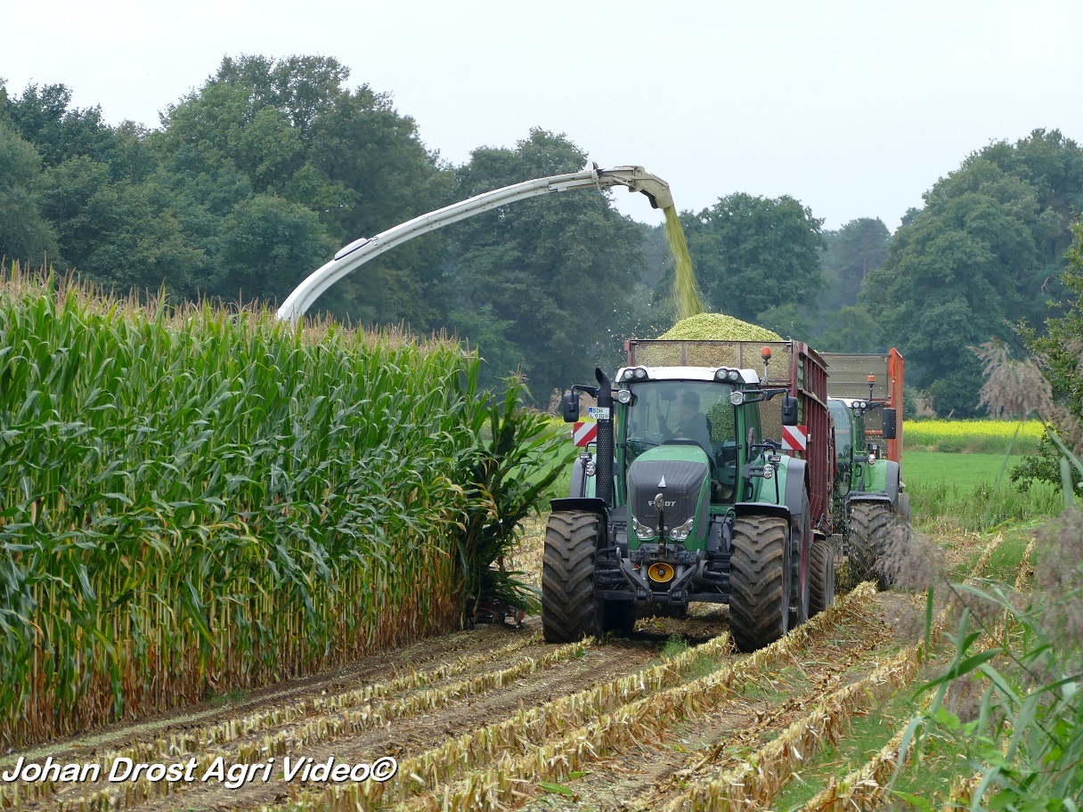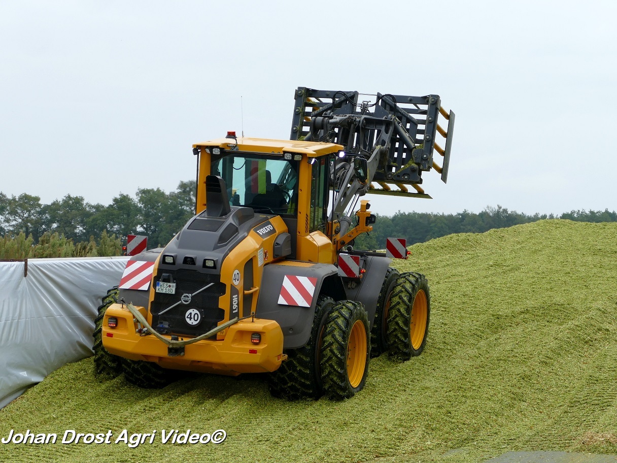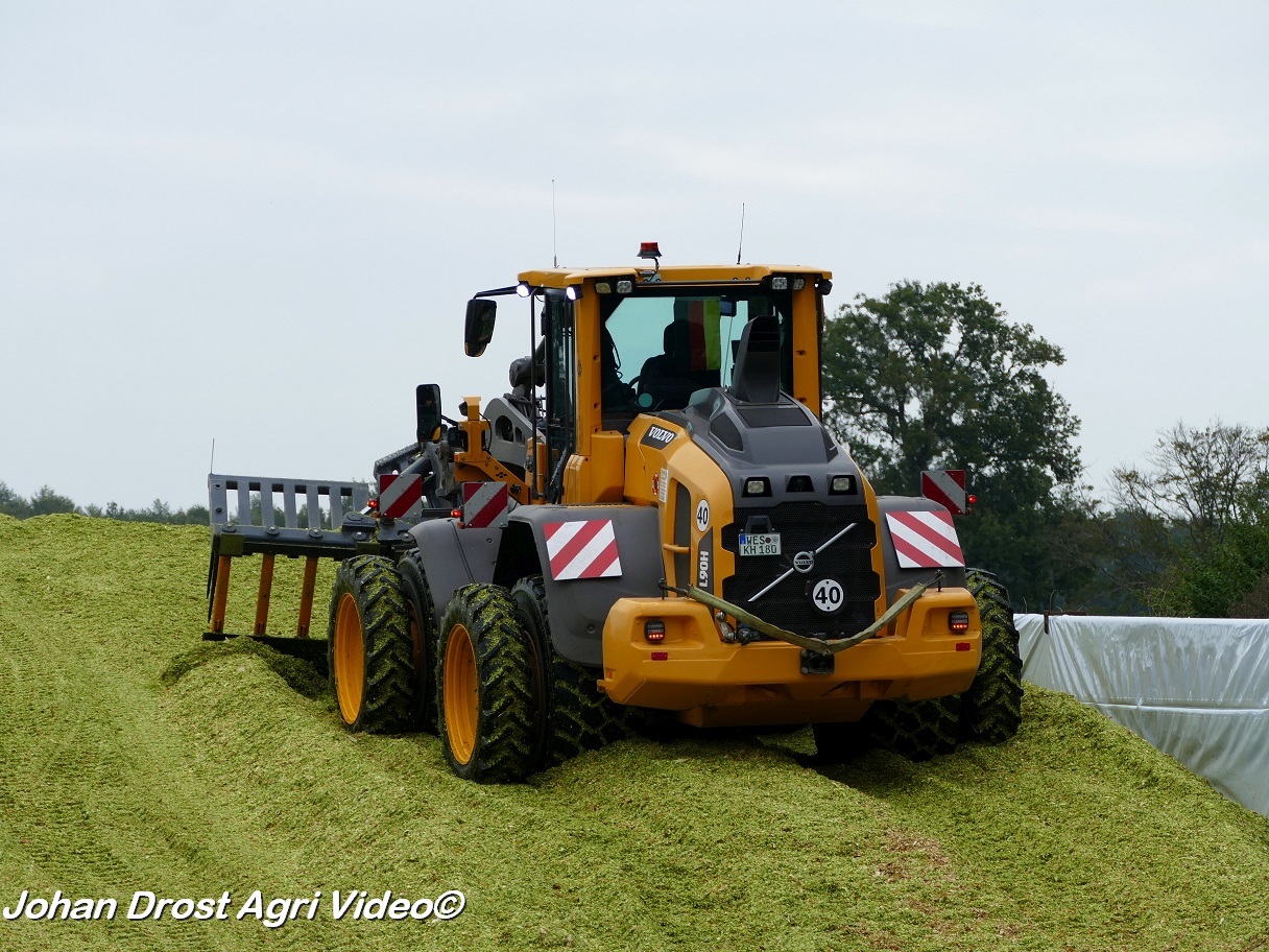 LU Klein Hitpaß uit Hamminkeln (DE) aan het maïs hakselen met een Claas Jaguar 960 (10-rijer), een New Holland T7.230 met Kaweco Radium 250, een Fendt 724 Vario met Kaweco Radium 50 en een Fendt 930 Vario met Strautmann Mega Trailer II DO. Op de kuil een Volvo L90H.
