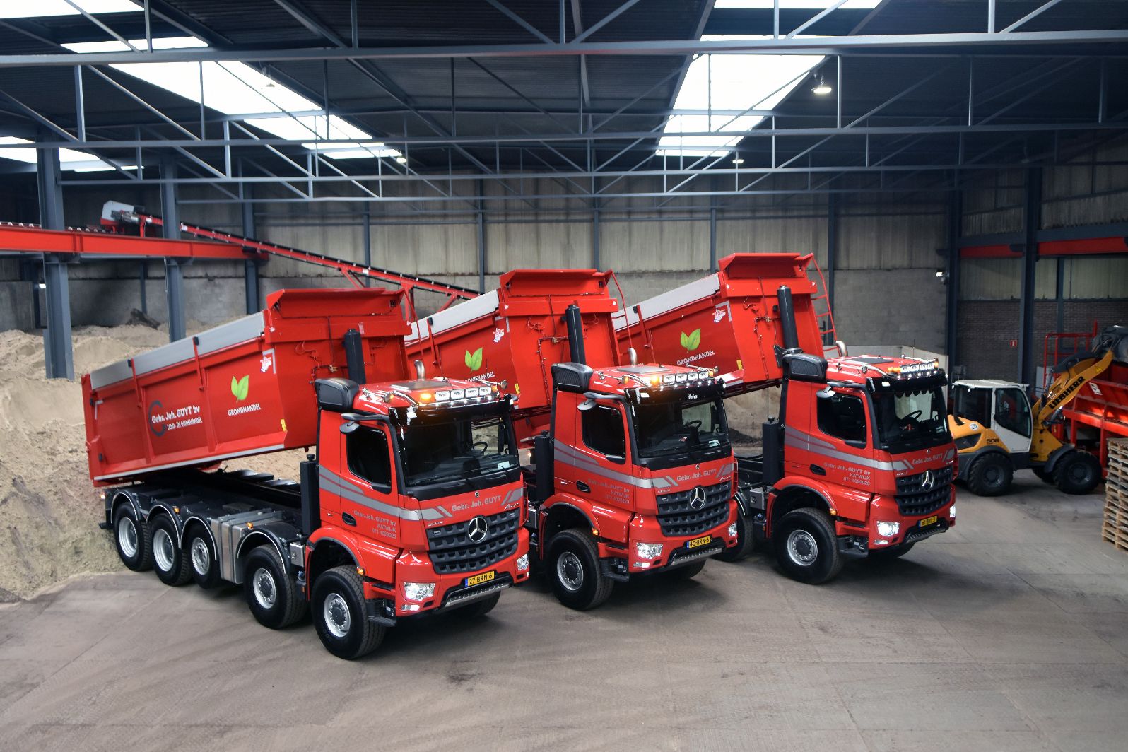 Transport en zandhandel Gebr. Joh. Guyt B.V uit Katwijk heeft drie Mercedes-Benz Arocs 10x8-kippers in gebruik genomen. Het gaat om bijzonder compact gebouwde vijf-assers met Ruijzeveld-kippers.