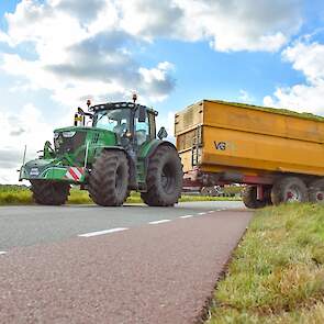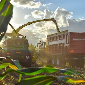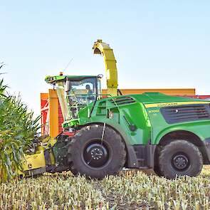 De John Deere 9700i-hakselaar gebruikt zijn John Deere 475 plus-maisbek om in een werkgang 10 rijen maïs te hakselen en daarmee de vier afvoercombinaties aan het werk te houden. Allereerst verschijnt de John Deere 6215R Black Edition onder de pijp, gevolgd door de Fendt 718 Vario met beide een VGM 2-asser kiepkar. Daarna volgen de John Deere 6230R en 6250R Black Edition met een Schuitemaker Rapide 6600-dubbeldoelwagen.