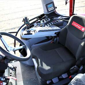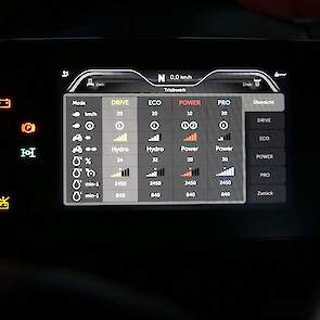 De trekker heeft vier aftakastoerentallen en dat is voor een trekker in dit vermogenssegment niet vanzelfsprekend. Je kunt in de cabine rechts van de stoel met één hendel kiezen voor 540 of 1.000 en met een tweede voor standaard of eco. In die laatste stand gaan de toerentallen naar 750 en 1.