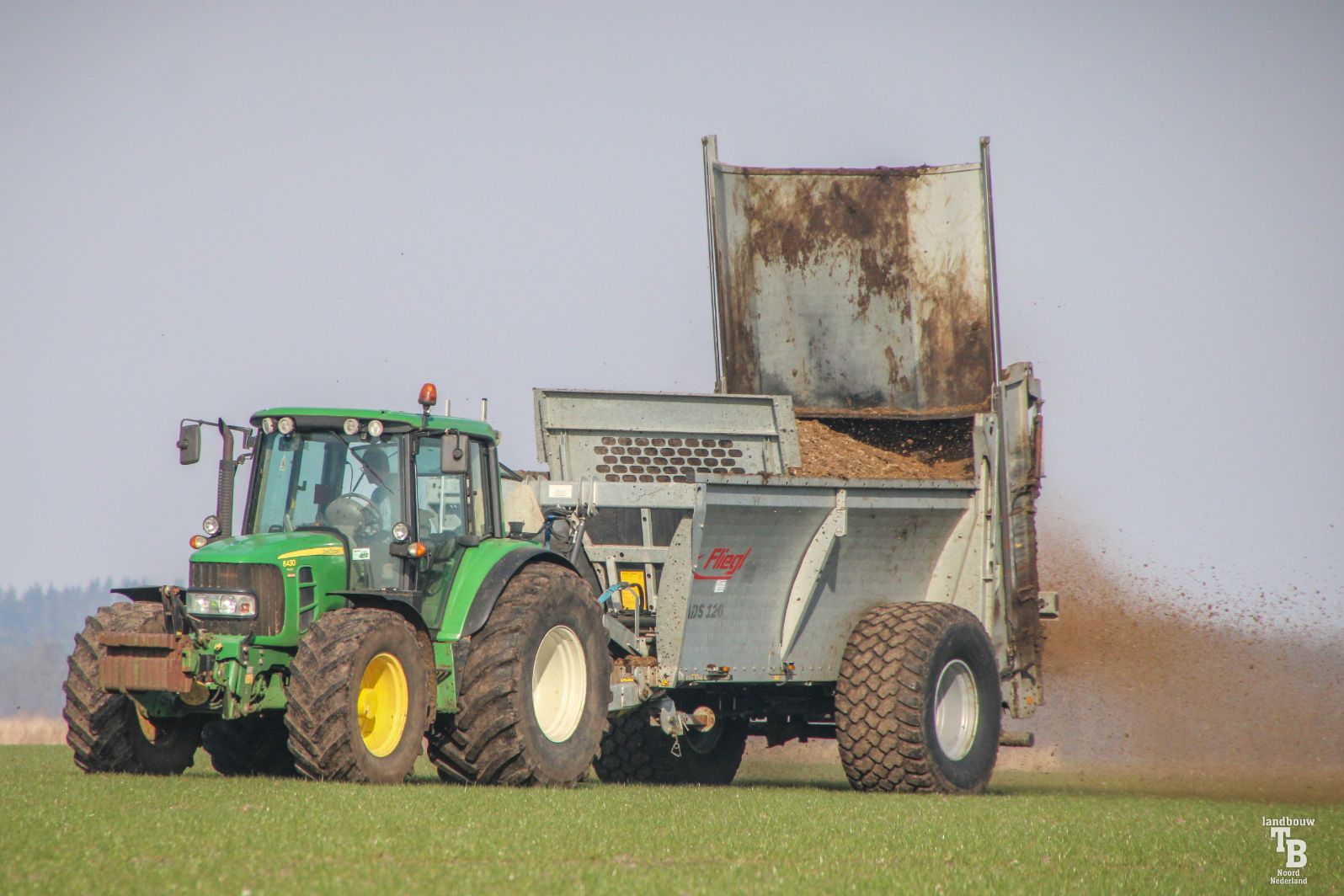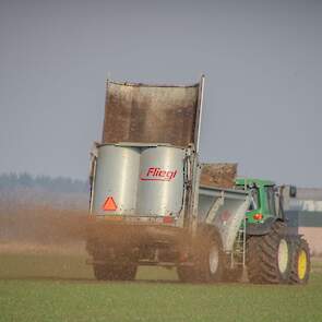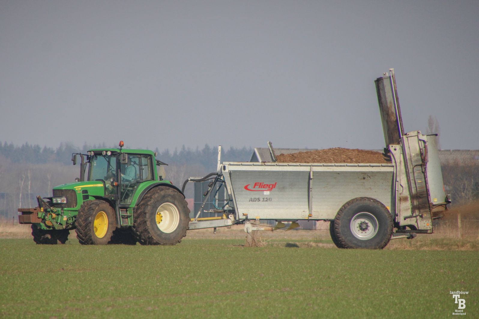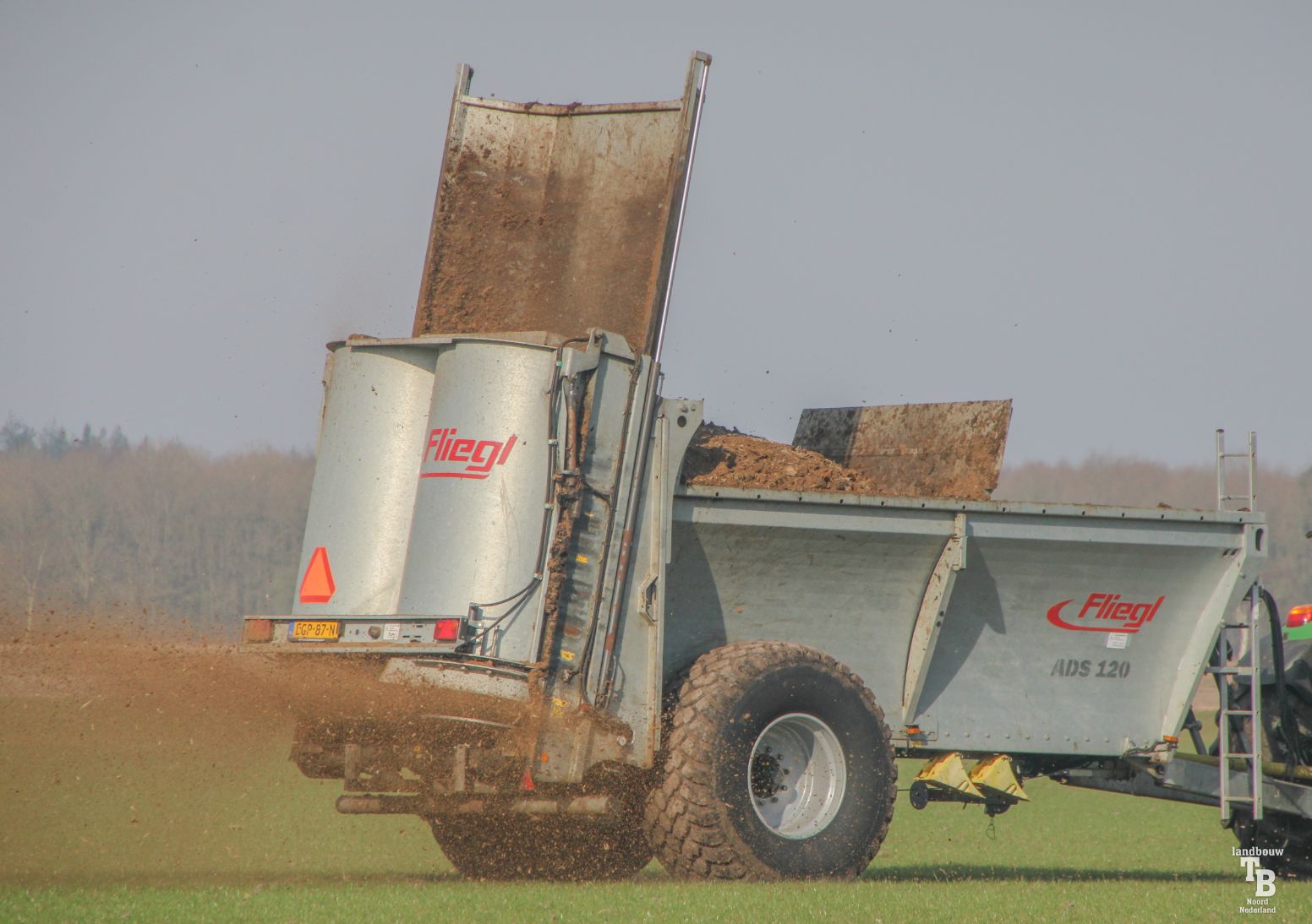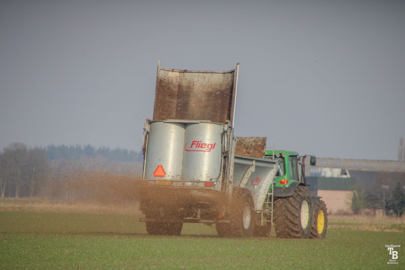 Kippenmest verspreiden met een John Deere 6430 met daarachter een Fliegl ADS 120.