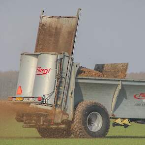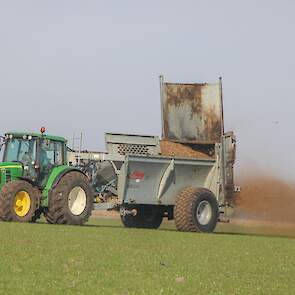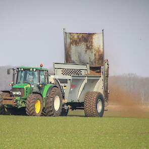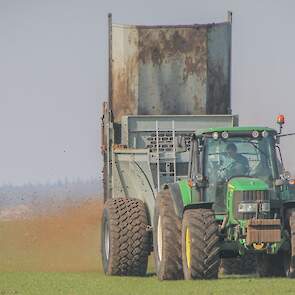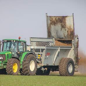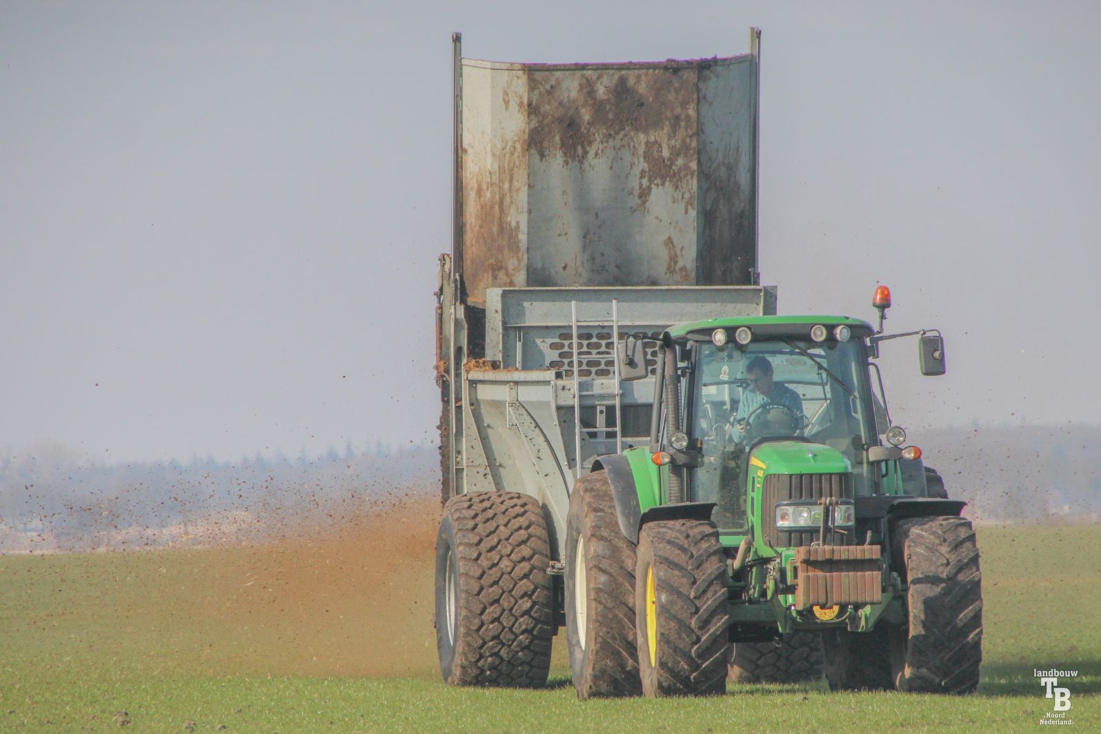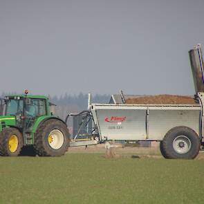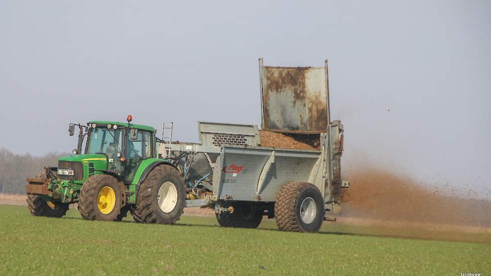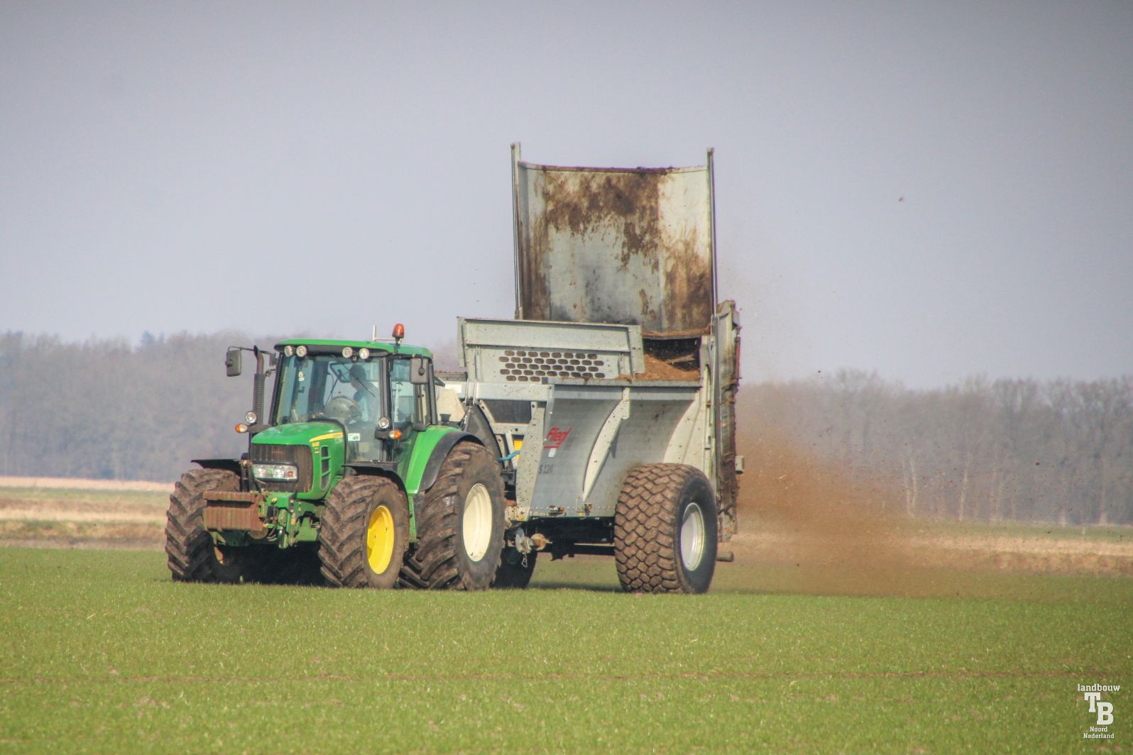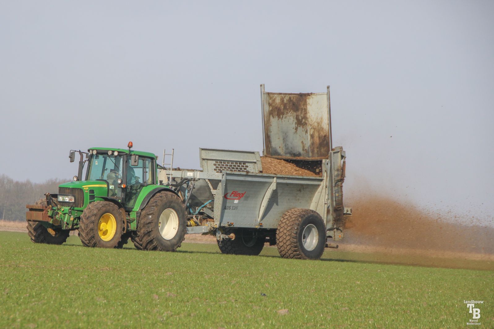 Kippenmest verspreiden met een John Deere 6430 met daarachter een Fliegl ADS 120.