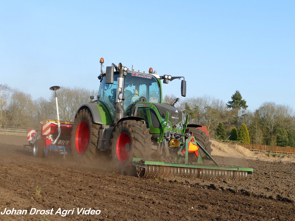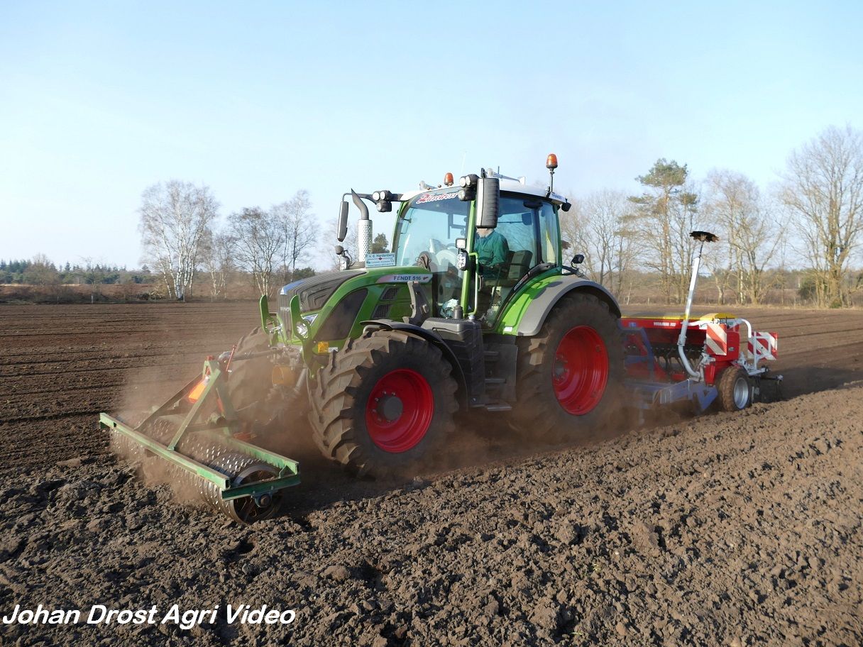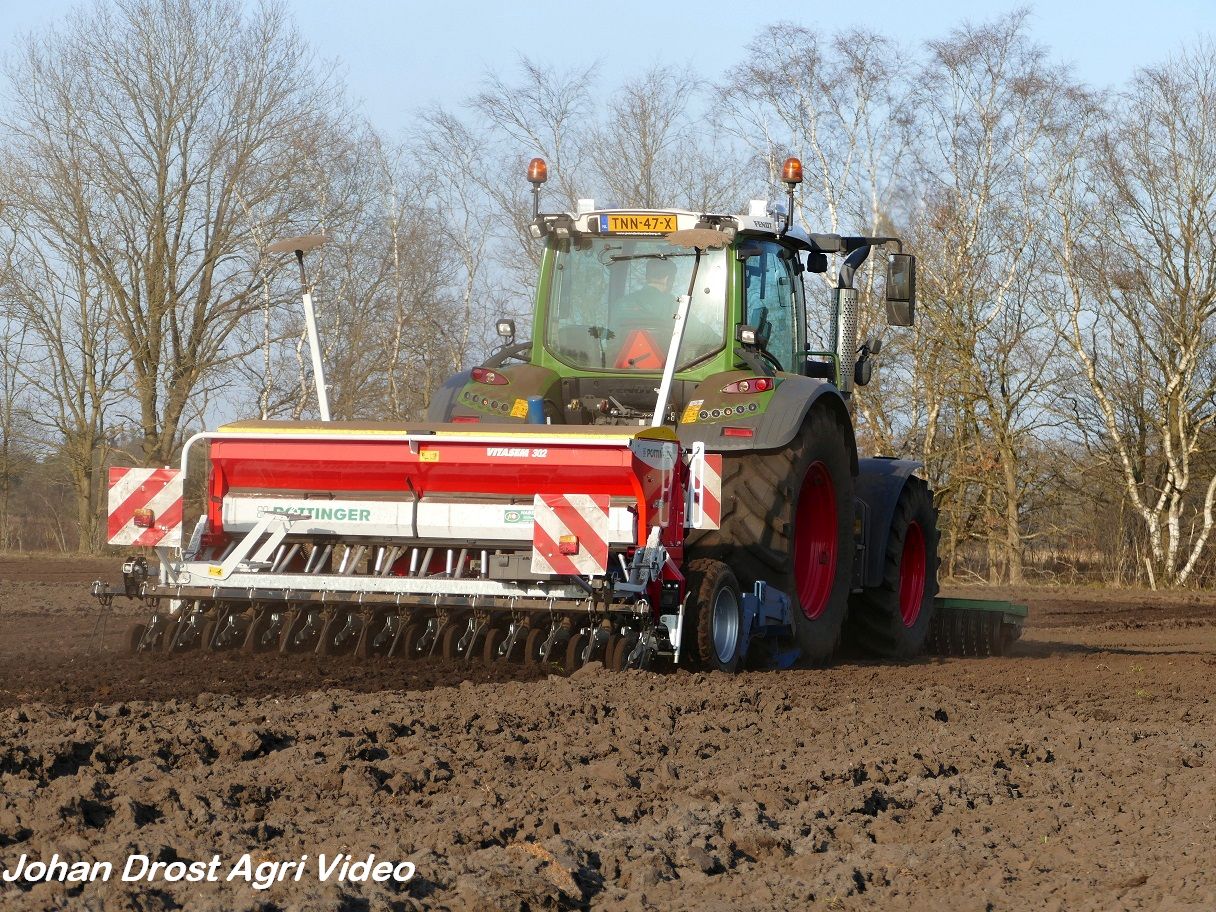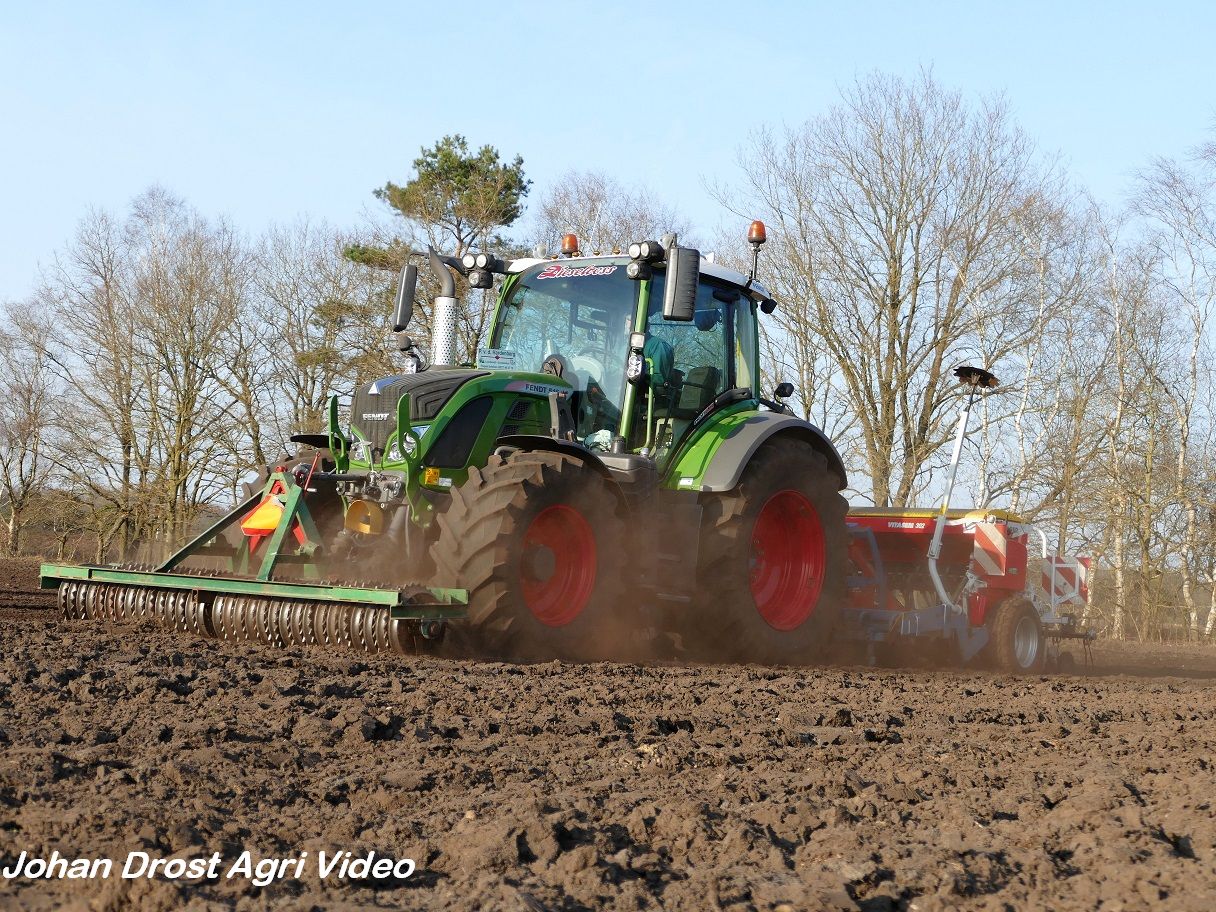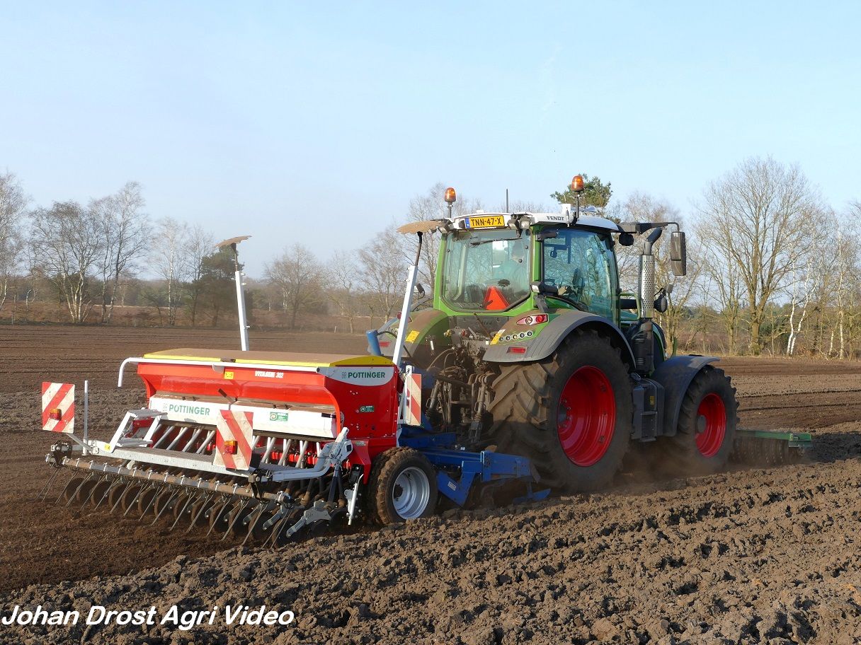 Loonbedrijf P. van den Hardenberg uit Elspeet (GD) aan het graan zaaien met een Fendt 516 Vario en Pöttinger Vitasem 302.