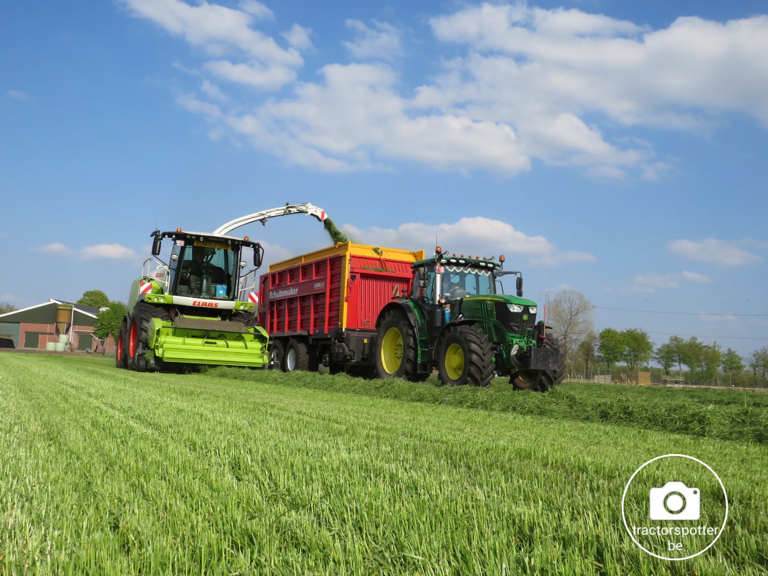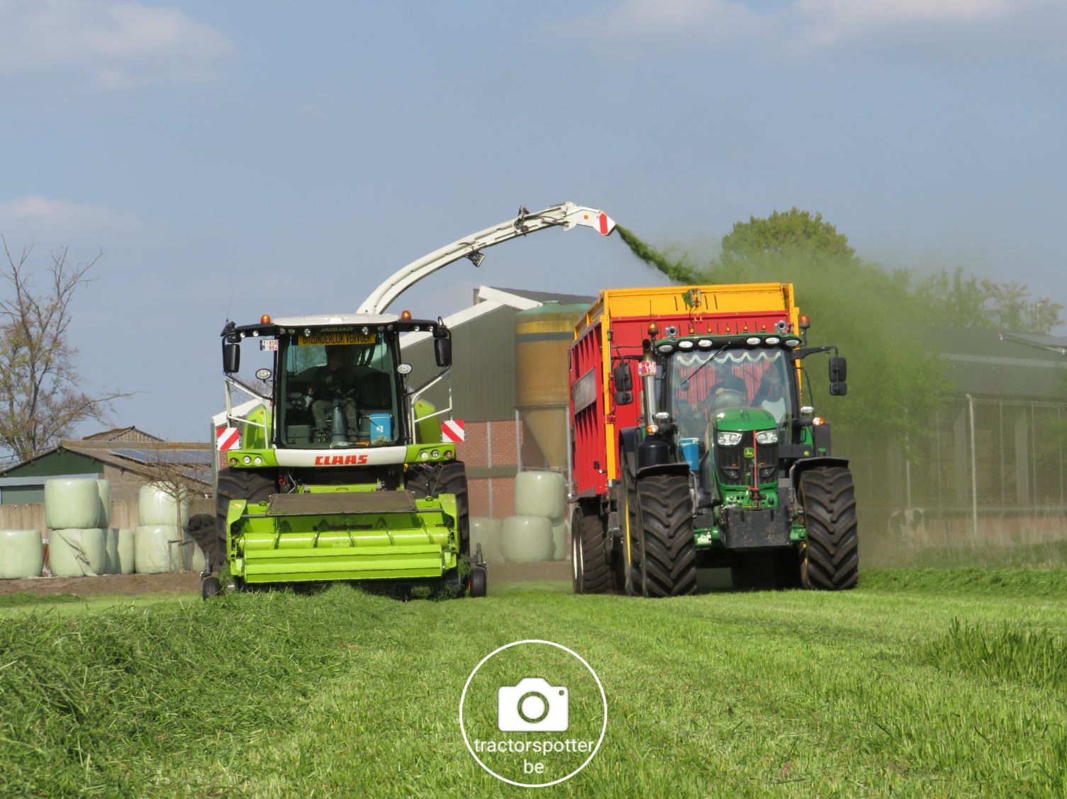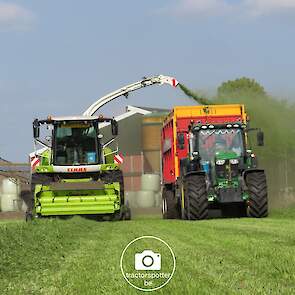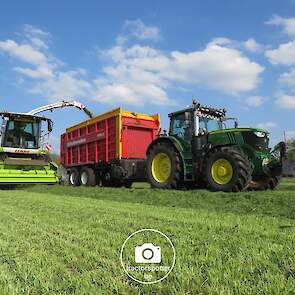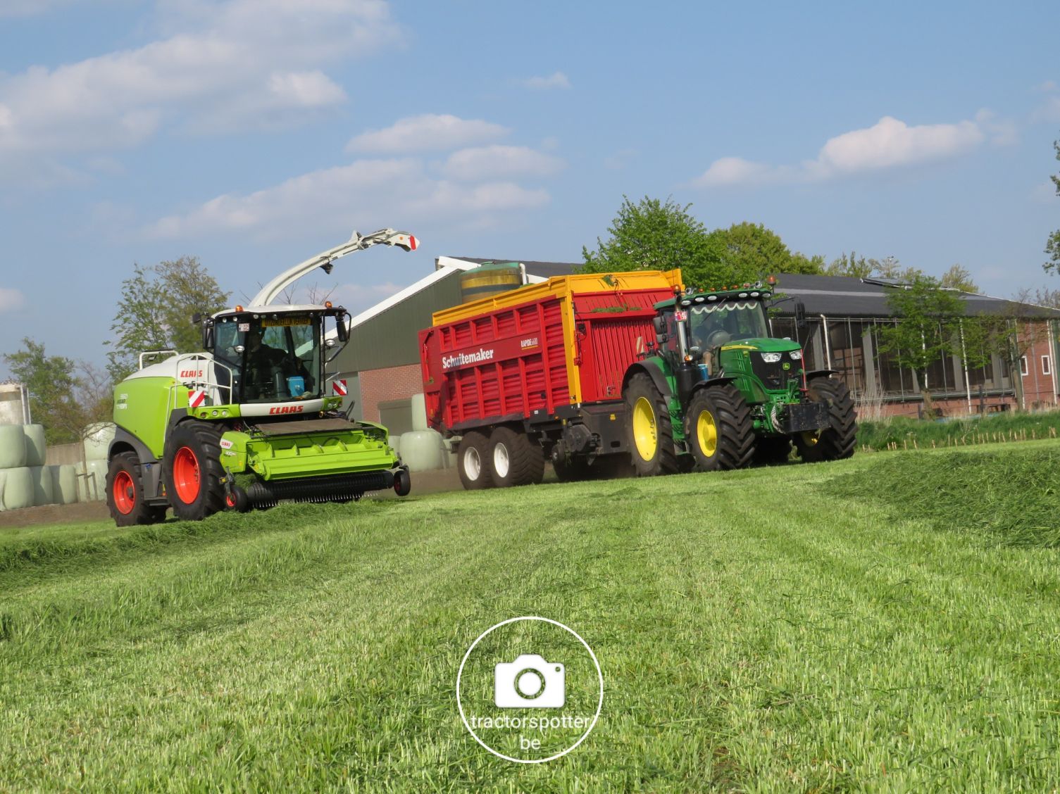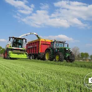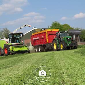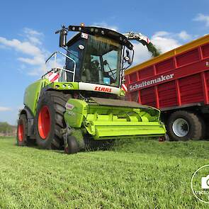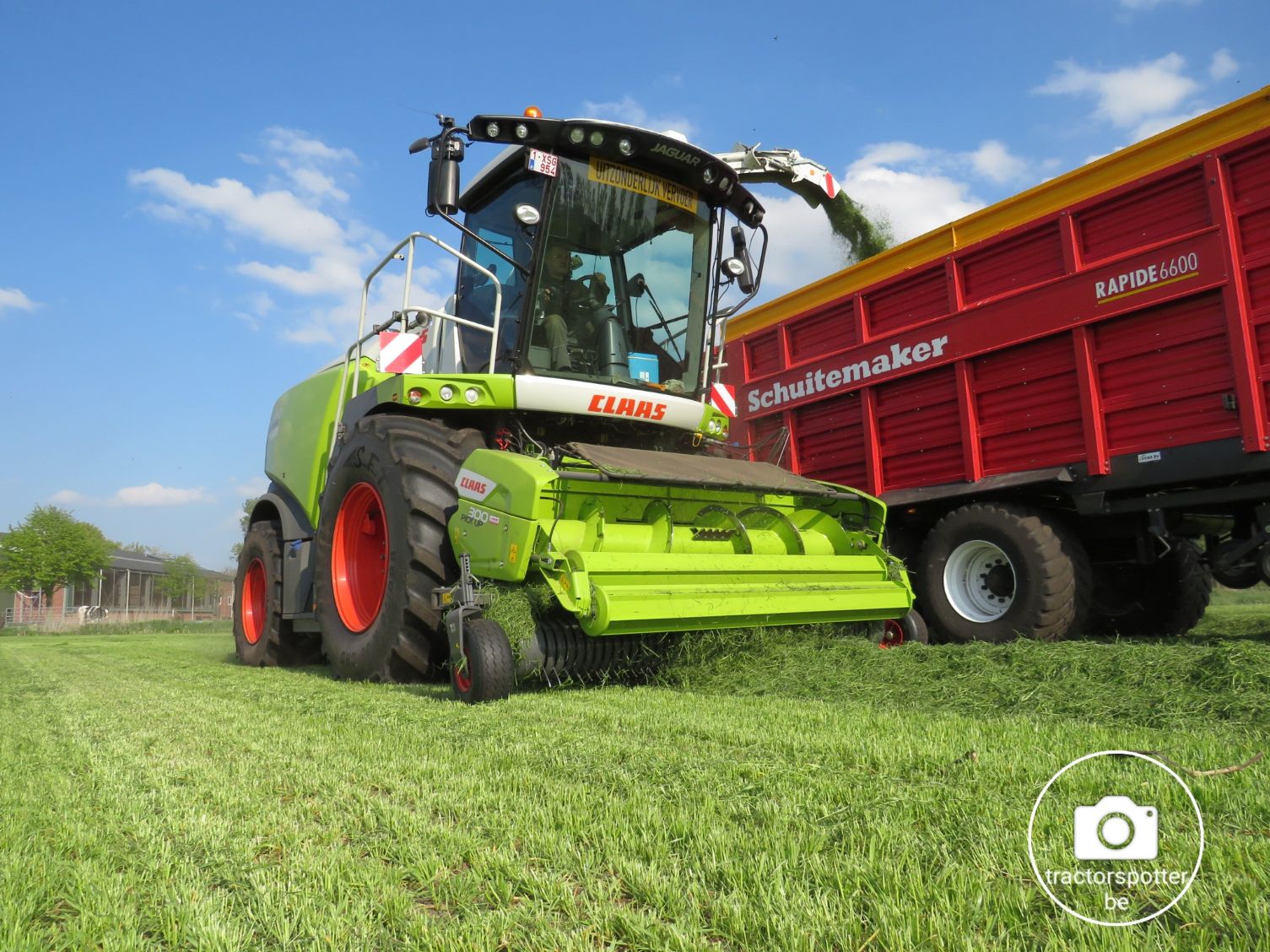 Loonbedrijf Kemps aan het gras hakselen en inkuilen met hun Claas 960 Jaguar en Case 721G-bulldozer.