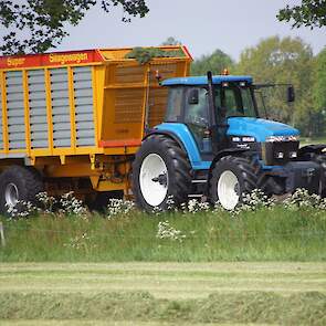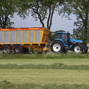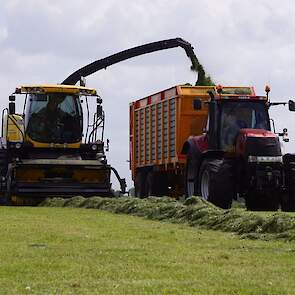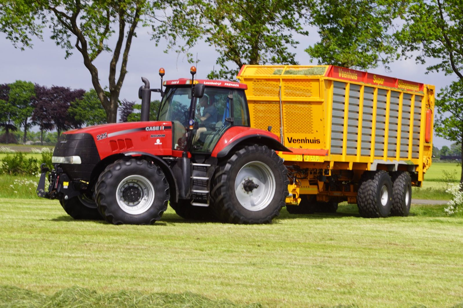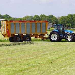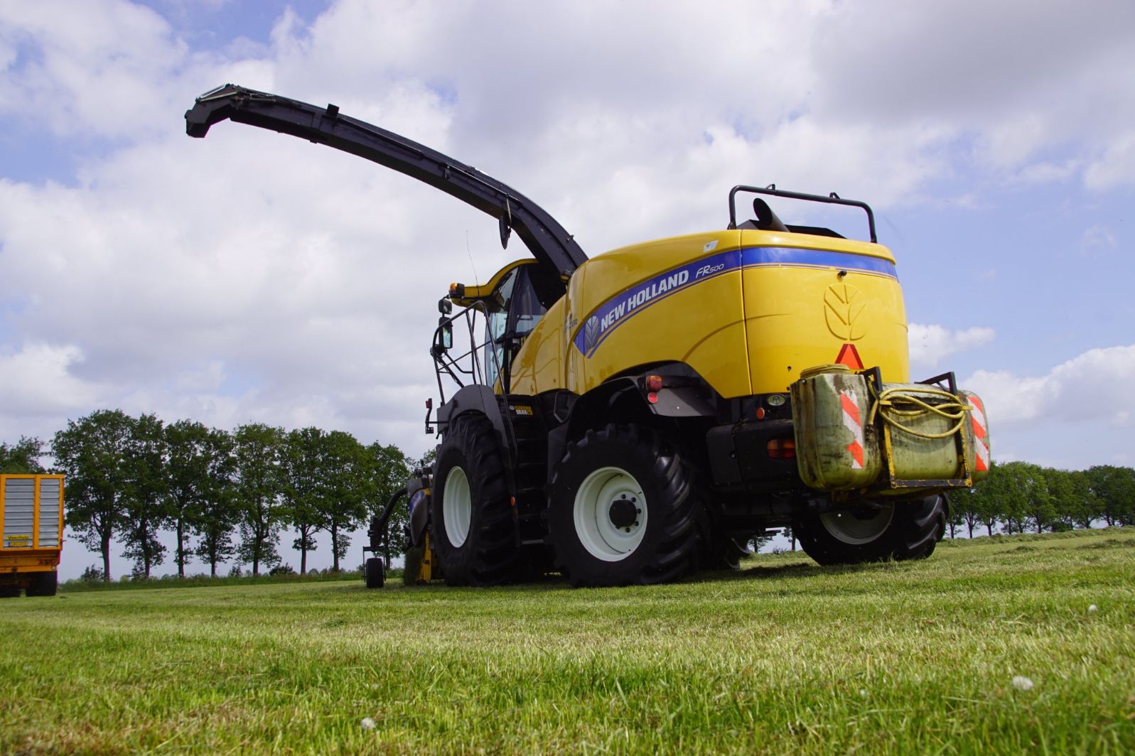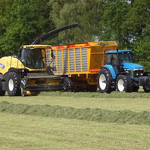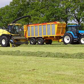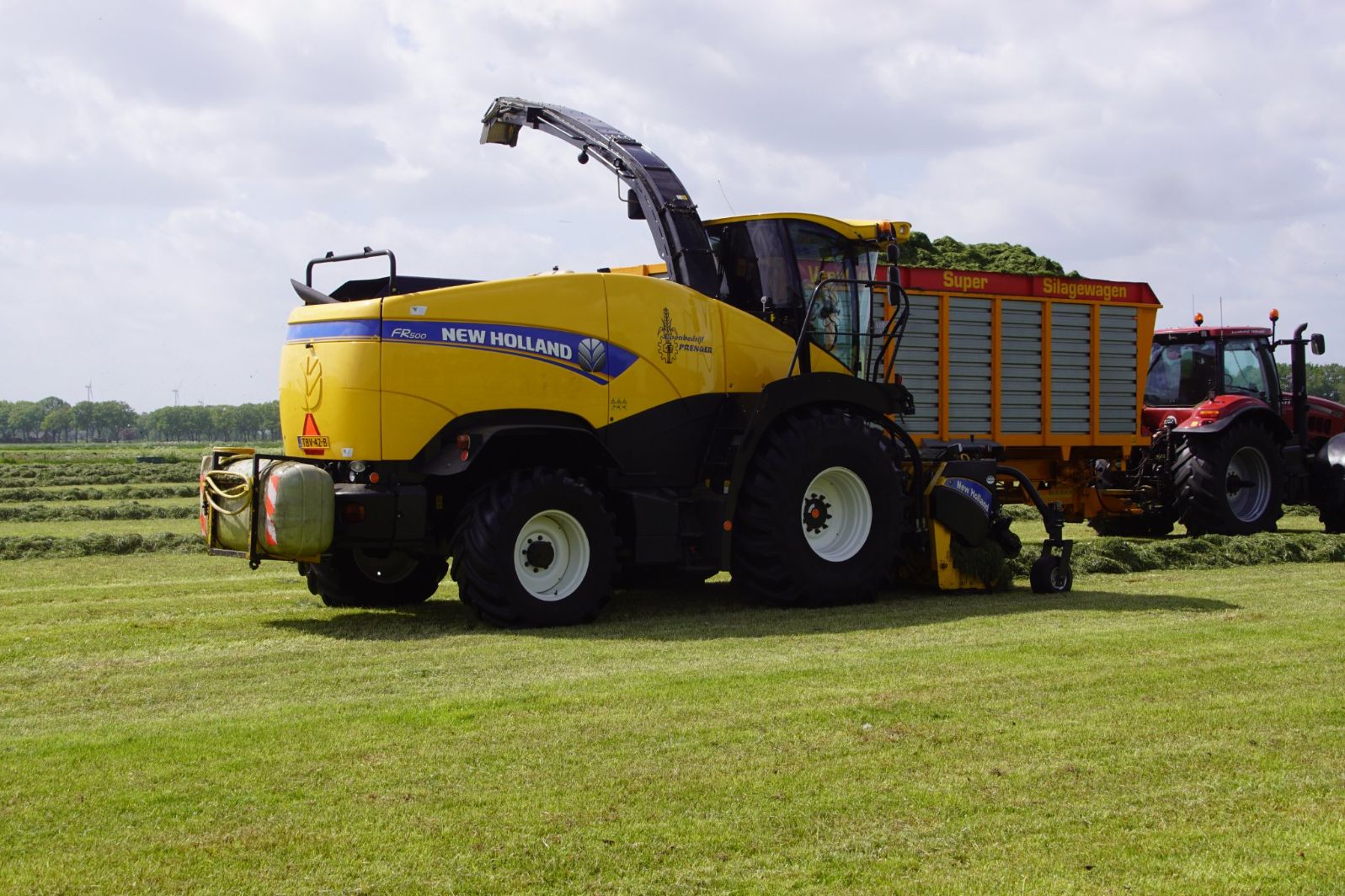 Loonbedrijf Prenger aan het gras hakselen met een New Holland FR 550-hakselaar. Voor de afvoer een New Holland 8870A en een Case-IH Magnum 225 met Veenhuis Super-silagewagens.