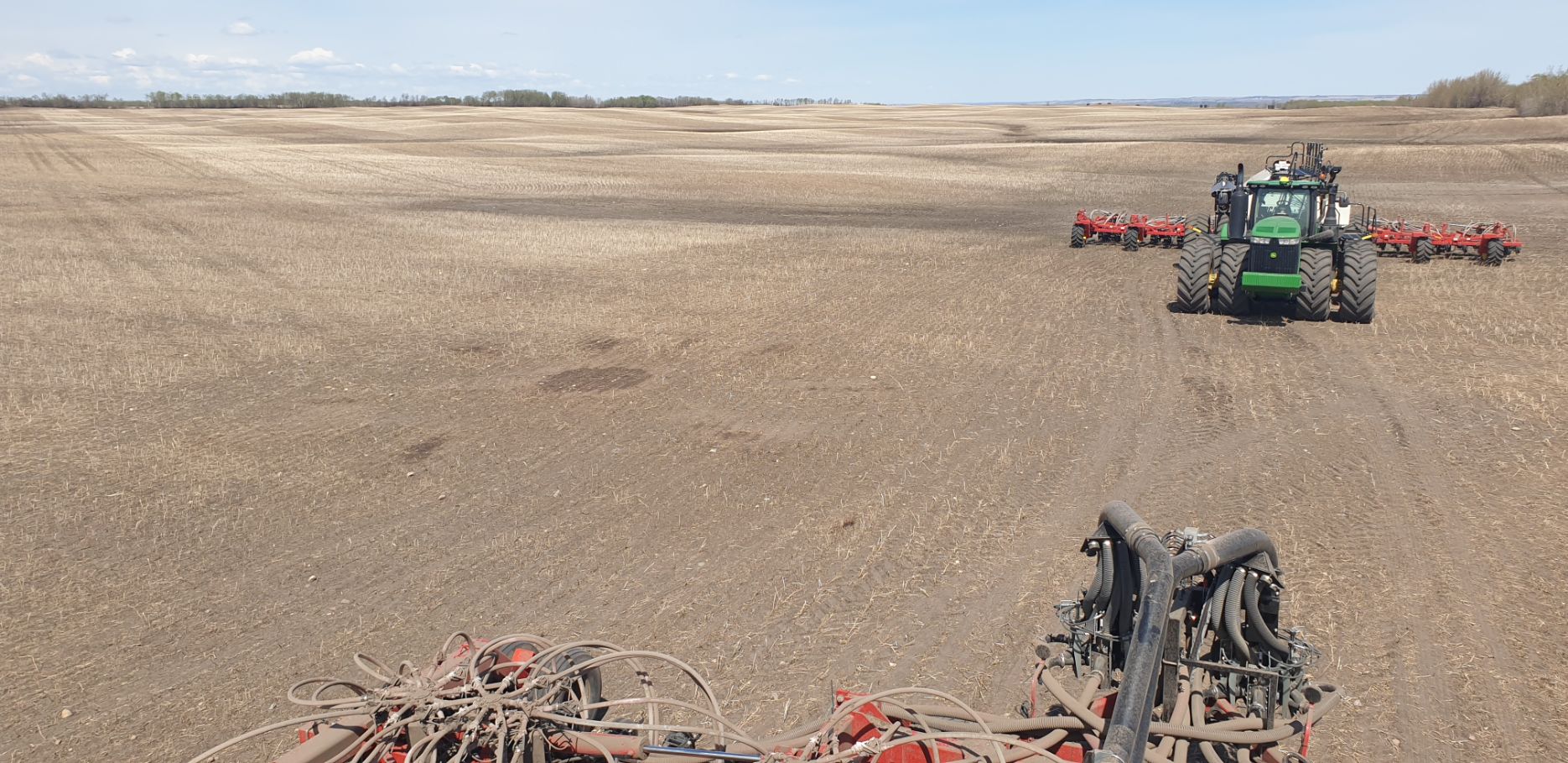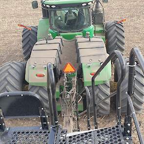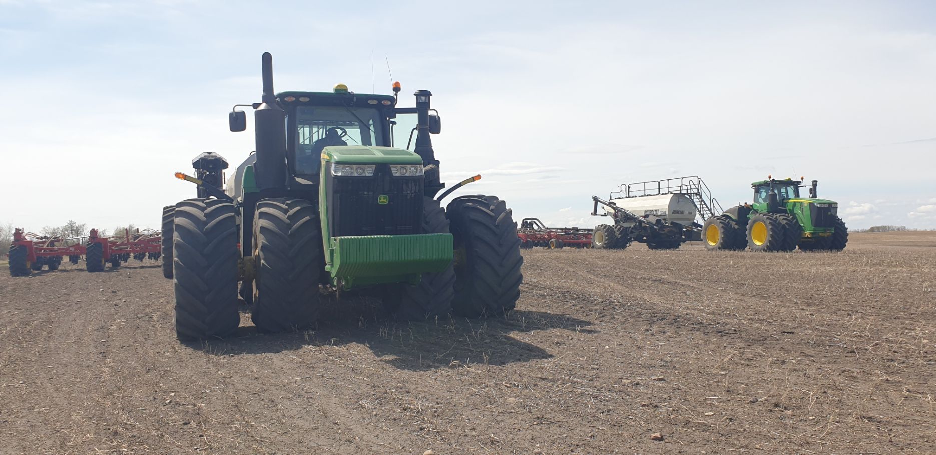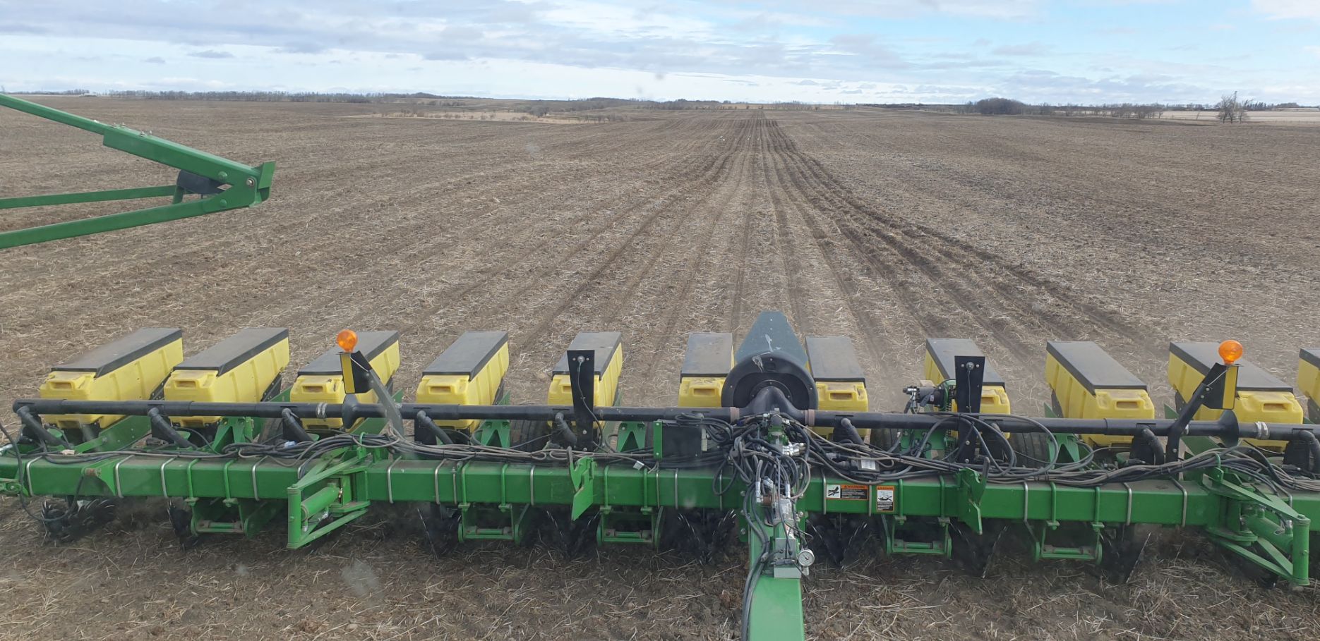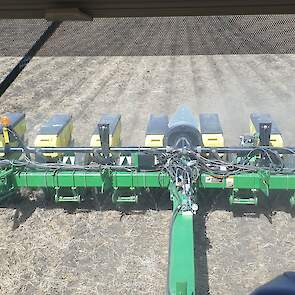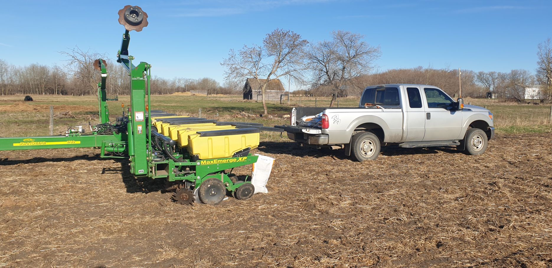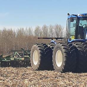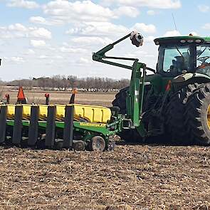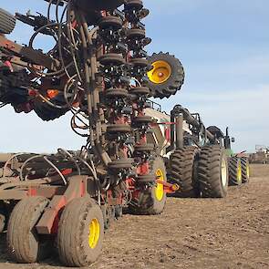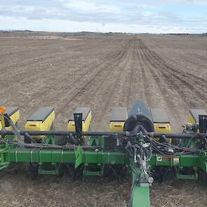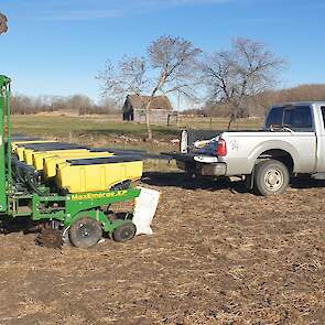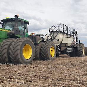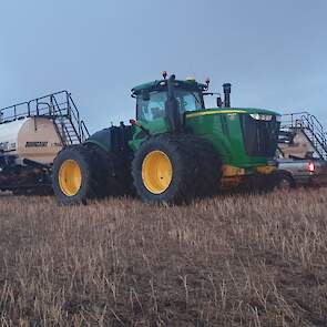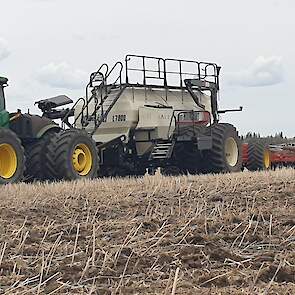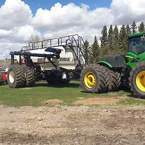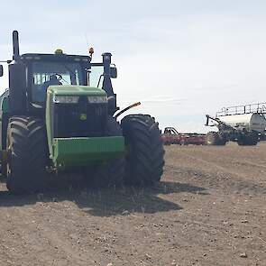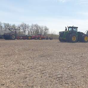 Maïs zaaien met een John Deere 7R290 en een 12-rijer maïspoter, New Holland 9040 met 40 voets Great Plains schijveneg. Aan het eind van de week twee dagen op pad geweest met een John Deere 9R620 met 60 voets Bourgault-zaaimachine met 20-tons zaaigoed-/ kunstmestwagen.