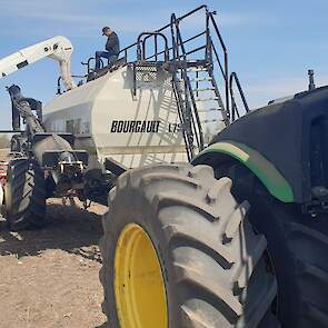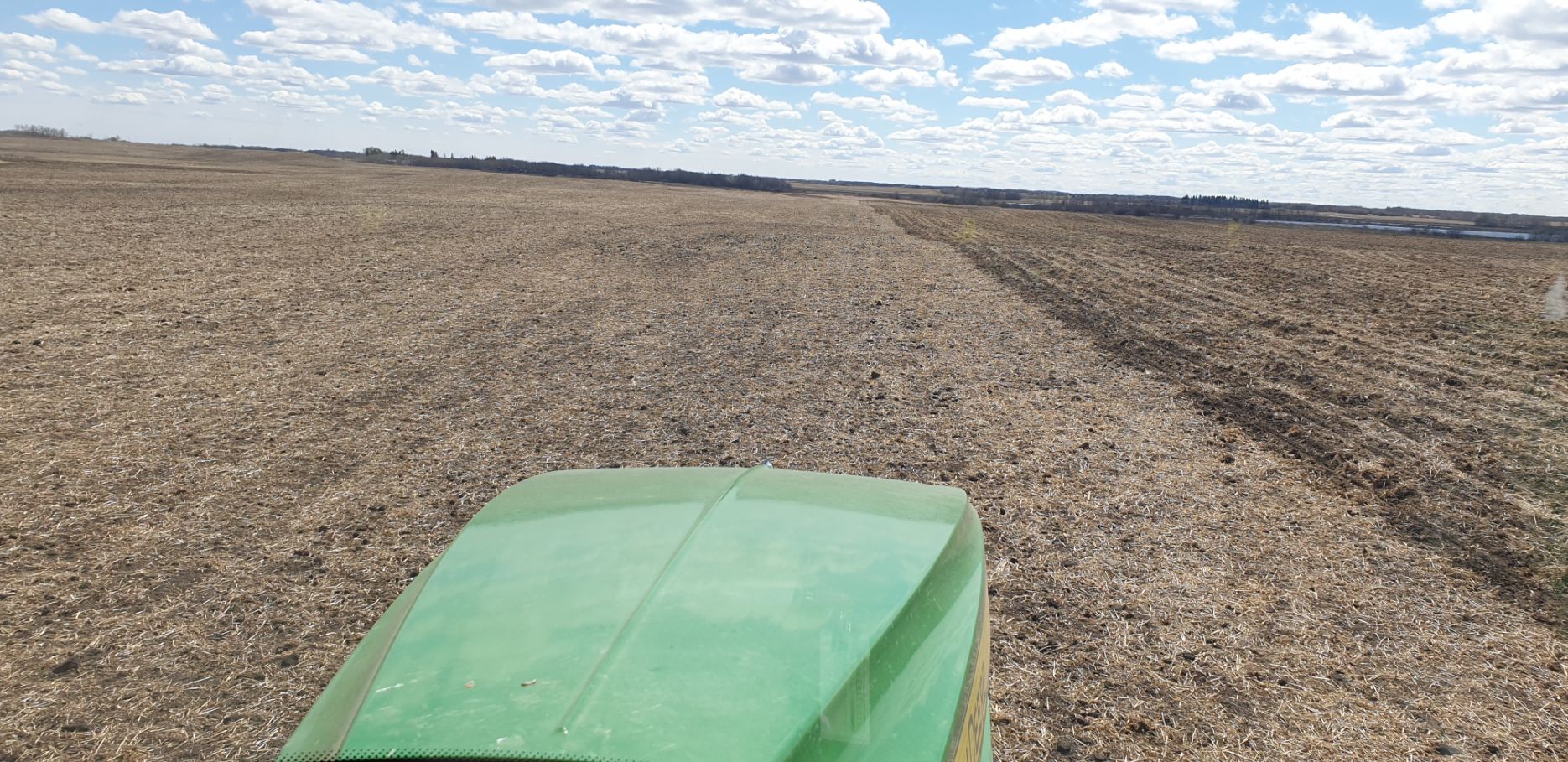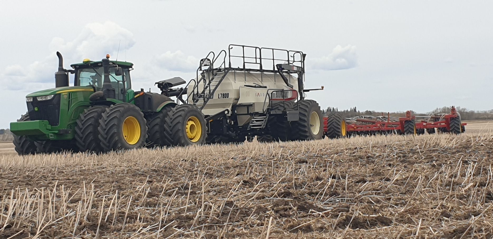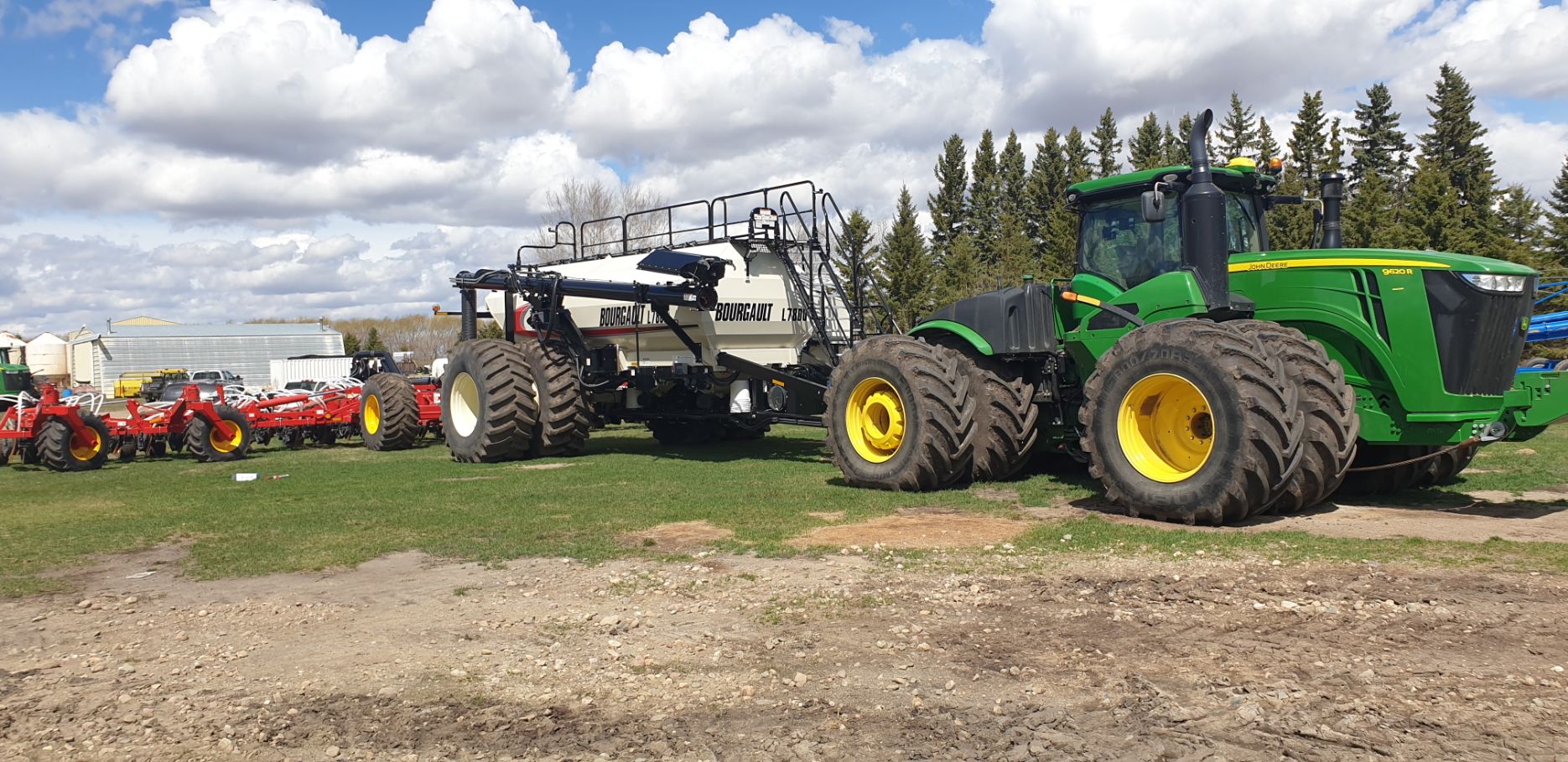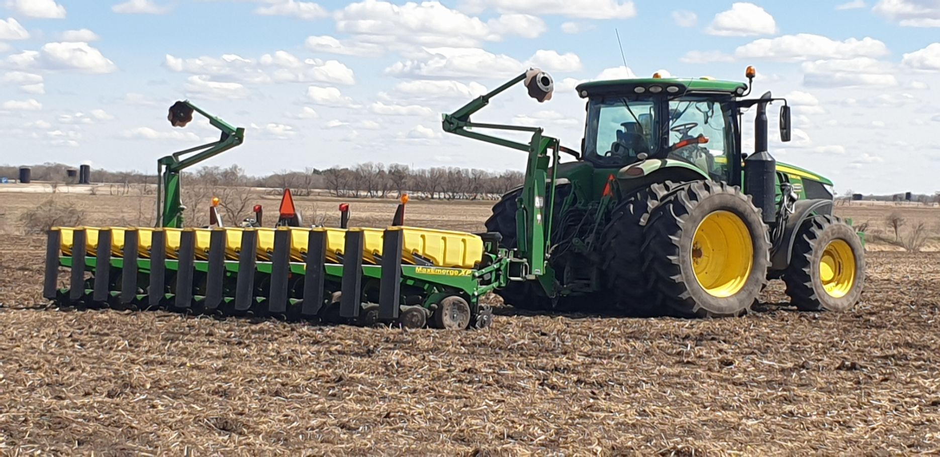 Maïs zaaien met een John Deere 7R290 en een 12-rijer maïspoter, New Holland 9040 met 40 voets Great Plains schijveneg. Aan het eind van de week twee dagen op pad geweest met een John Deere 9R620 met 60 voets Bourgault-zaaimachine met 20-tons zaaigoed-/ kunstmestwagen.