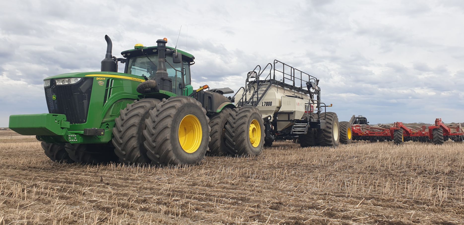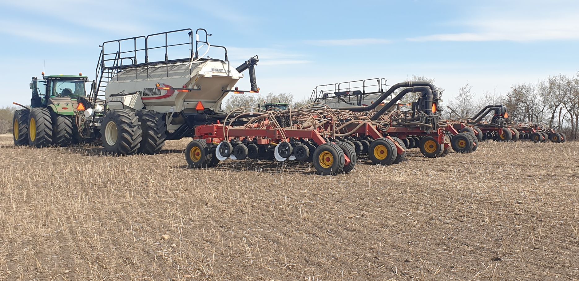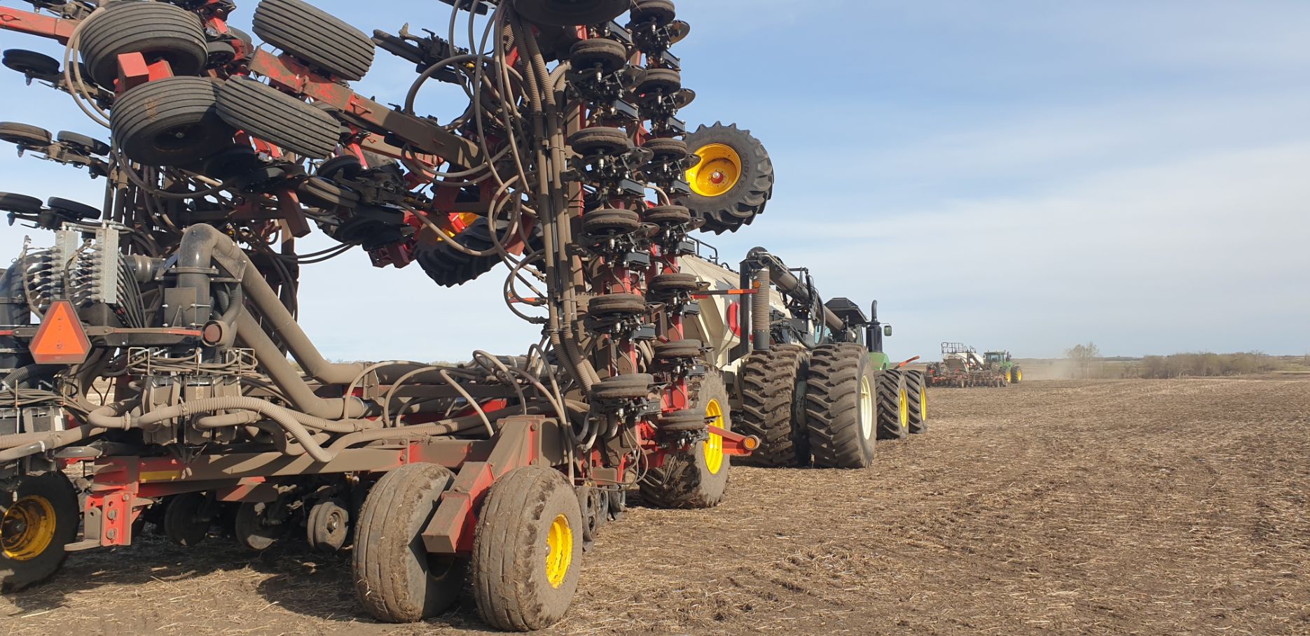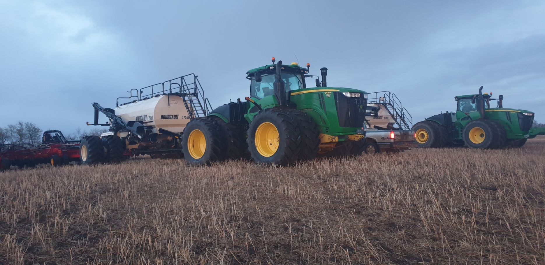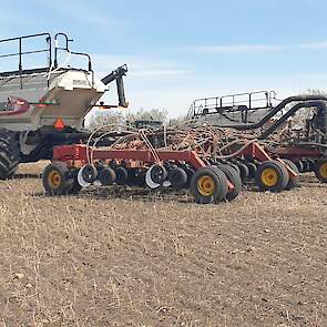Maïs zaaien met een John Deere 7R290 en een 12-rijer maïspoter, New Holland 9040 met 40 voets Great Plains schijveneg. Aan het eind van de week twee dagen op pad geweest met een John Deere 9R620 met 60 voets Bourgault-zaaimachine met 20-tons zaaigoed-/ kunstmestwagen.