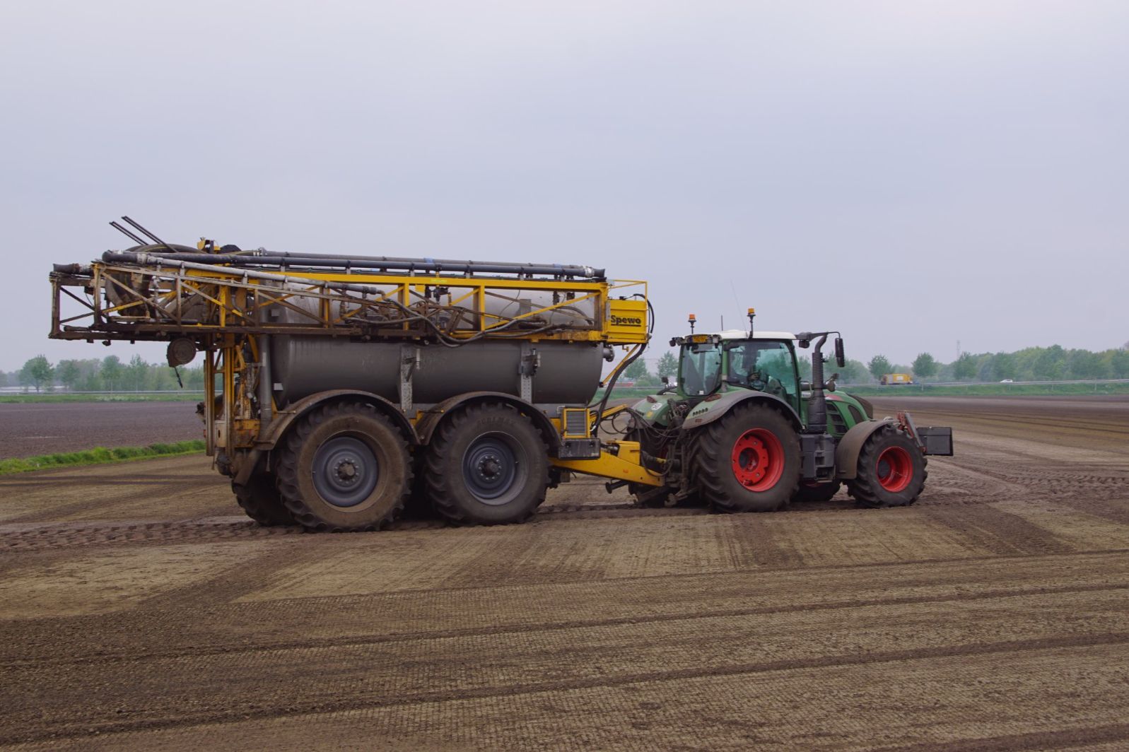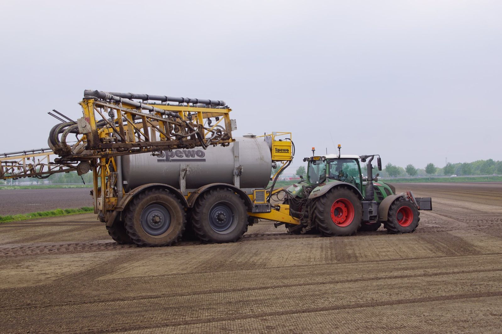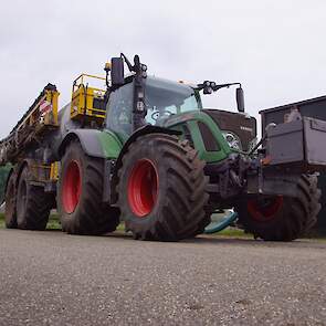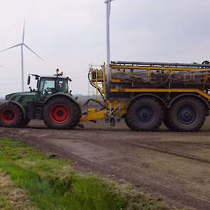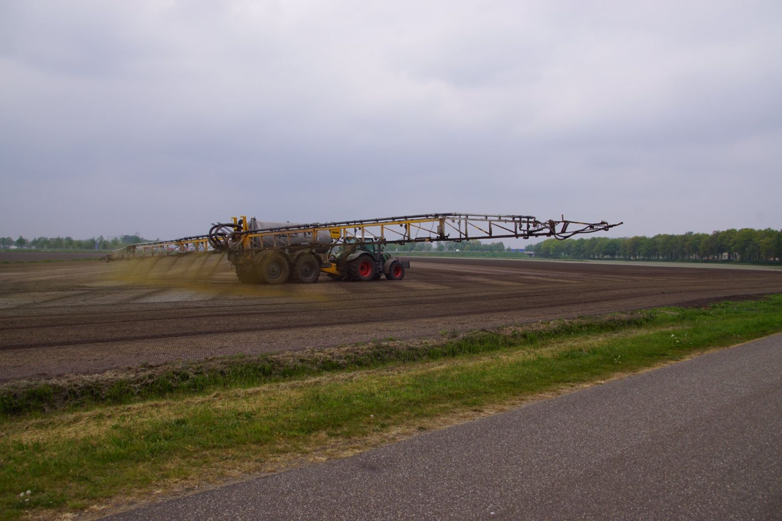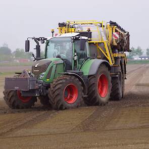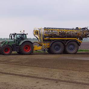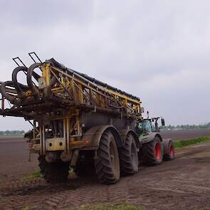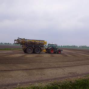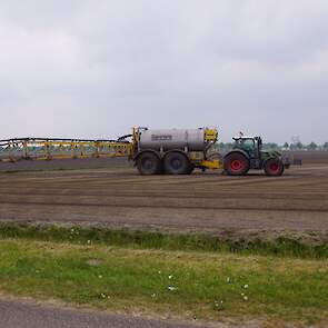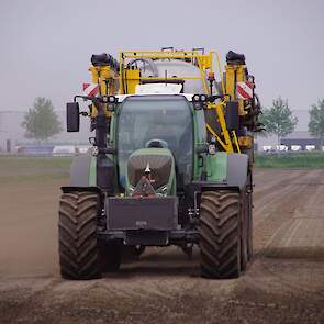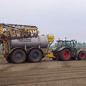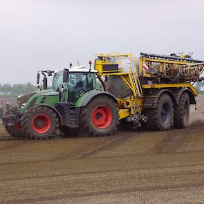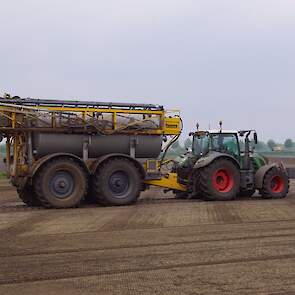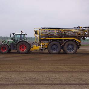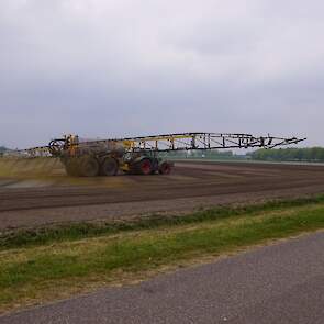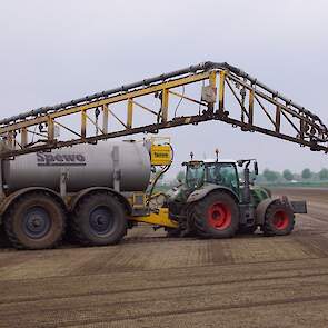 Met deze omgebouwde Dubex-spuit wordt, met daarvoor een Fendt 724, op een precieze manier en goed verdeeld het anti-stuifdek aangebracht.