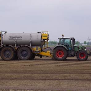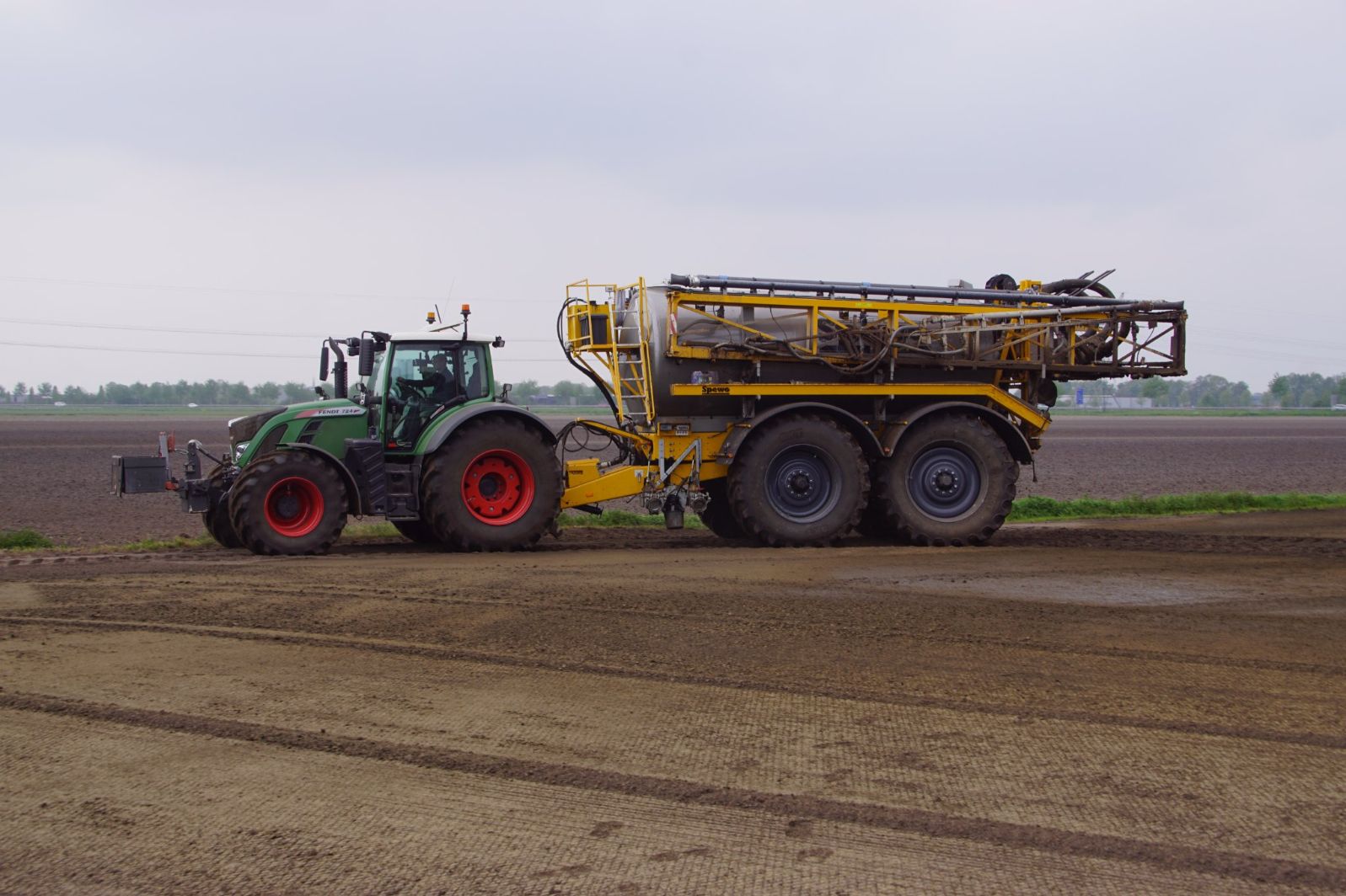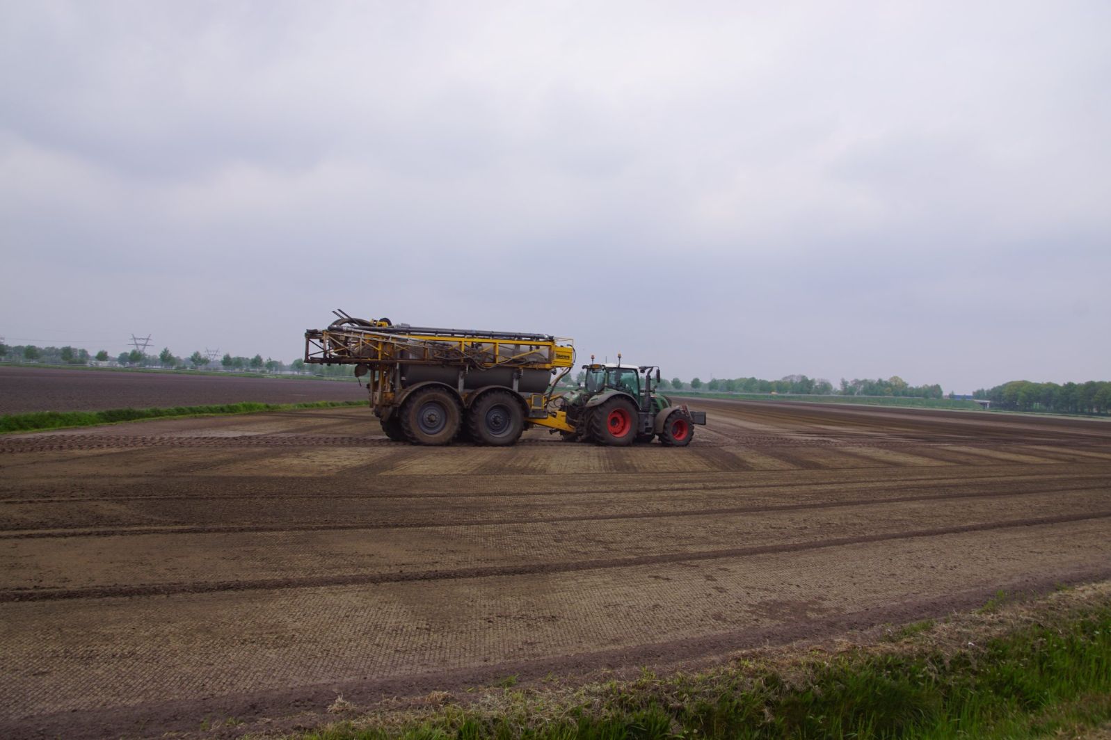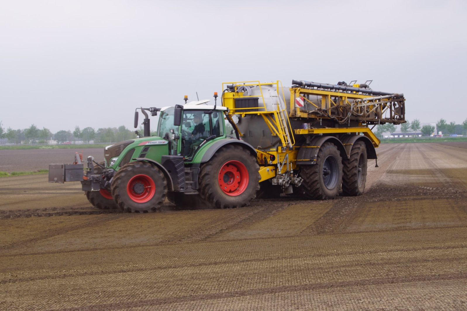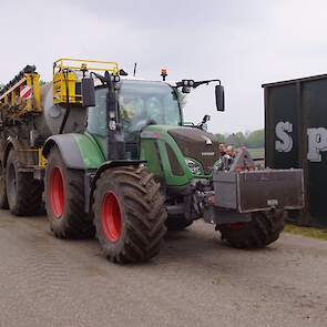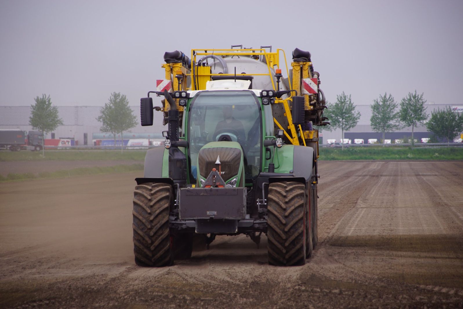 Met deze omgebouwde Dubex-spuit wordt, met daarvoor een Fendt 724, op een precieze manier en goed verdeeld het anti-stuifdek aangebracht.