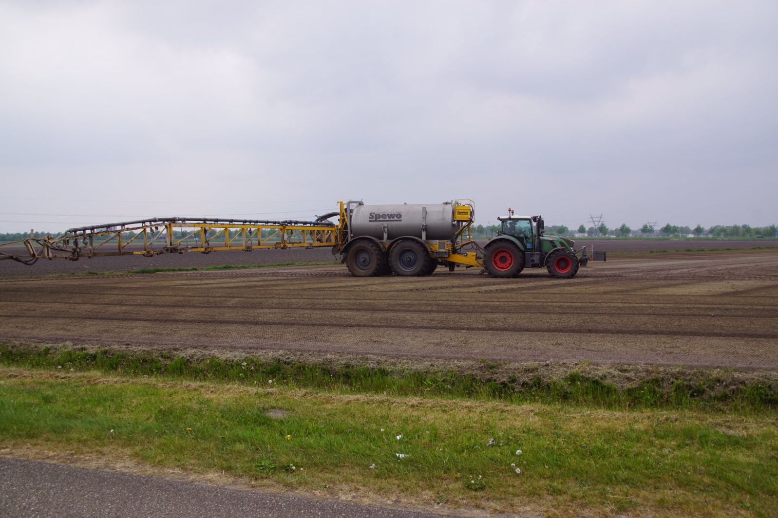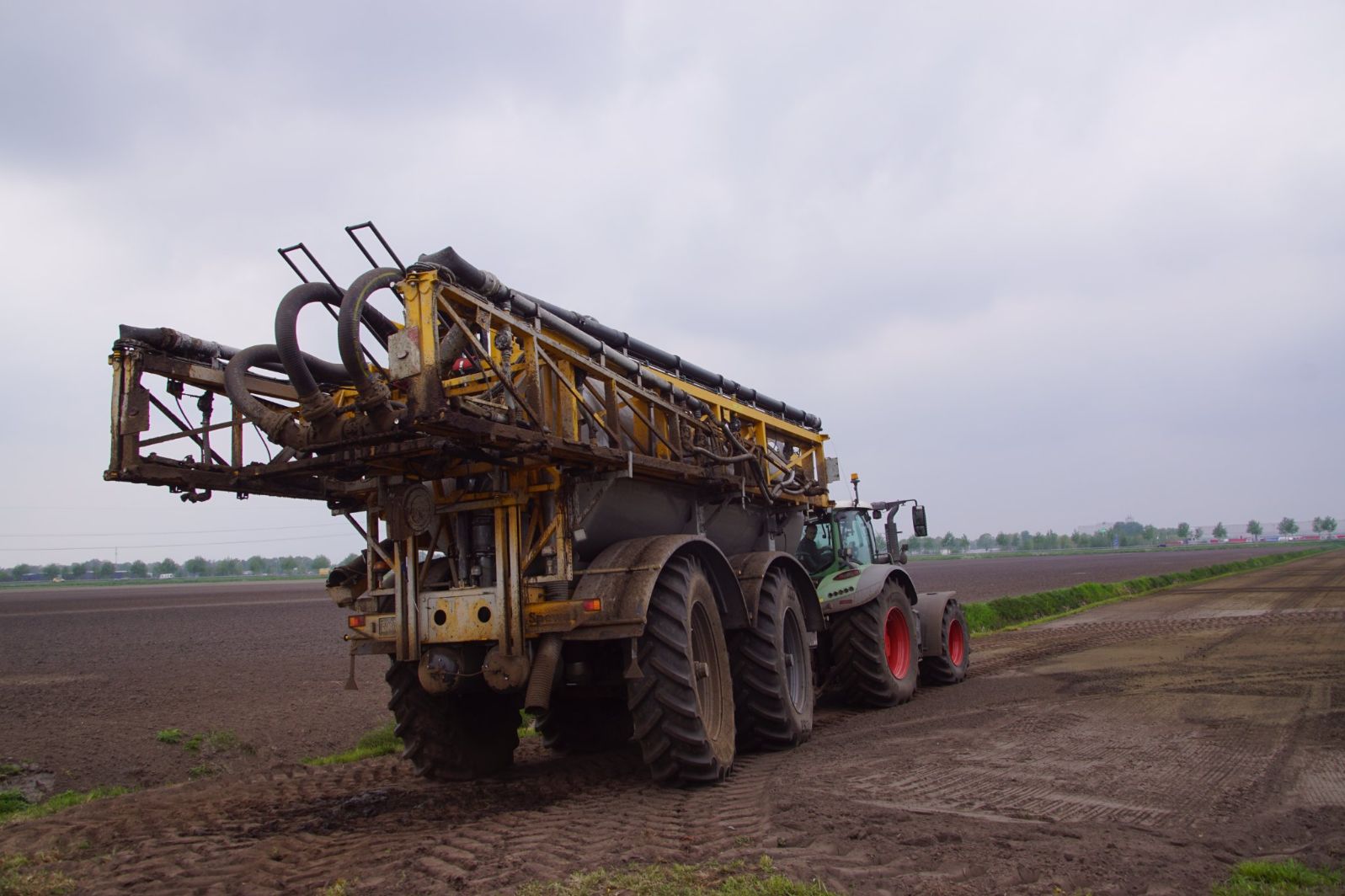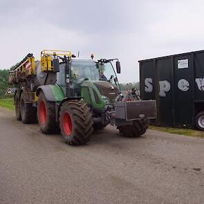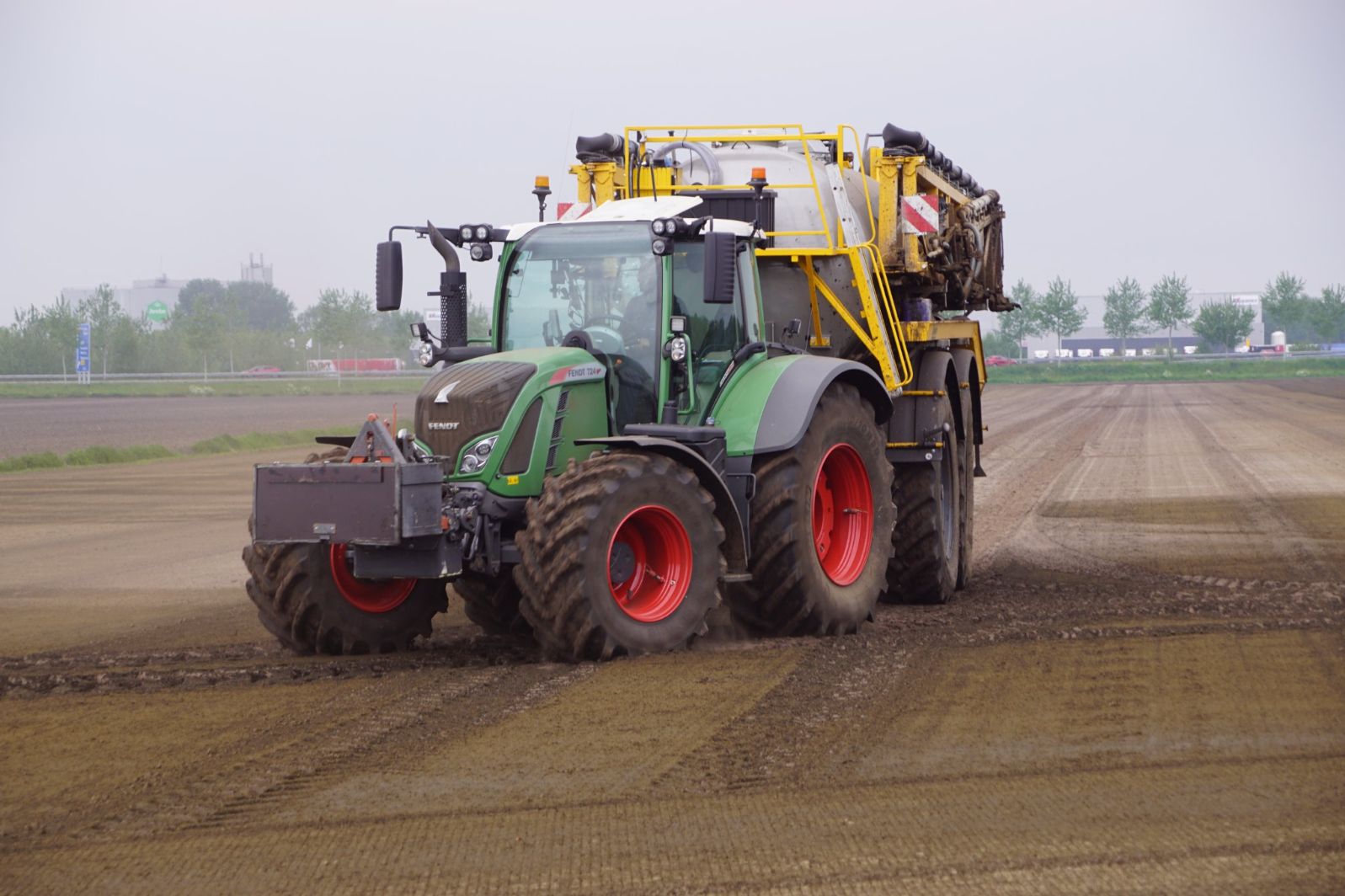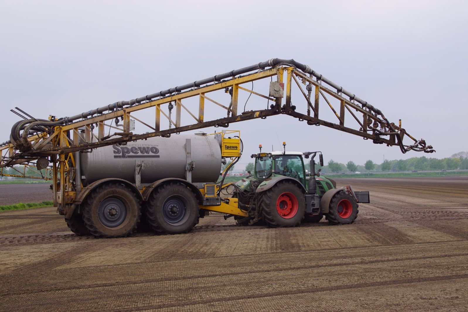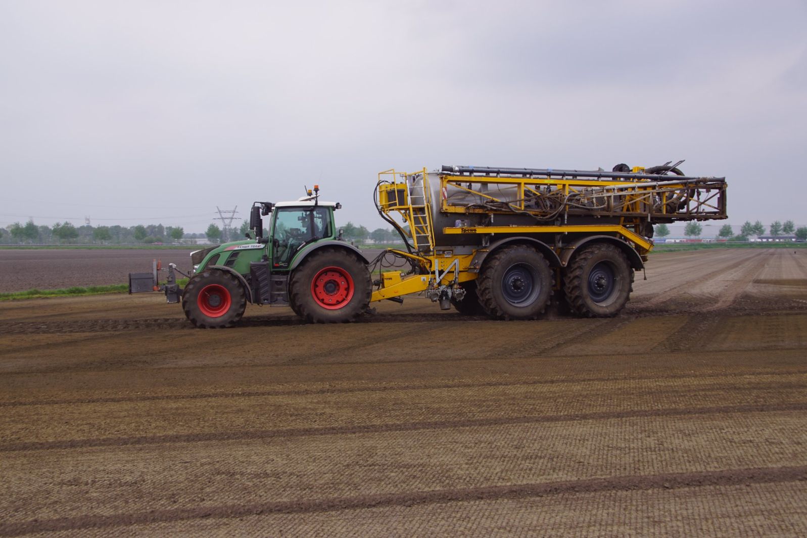 Met deze omgebouwde Dubex-spuit wordt, met daarvoor een Fendt 724, op een precieze manier en goed verdeeld het anti-stuifdek aangebracht.