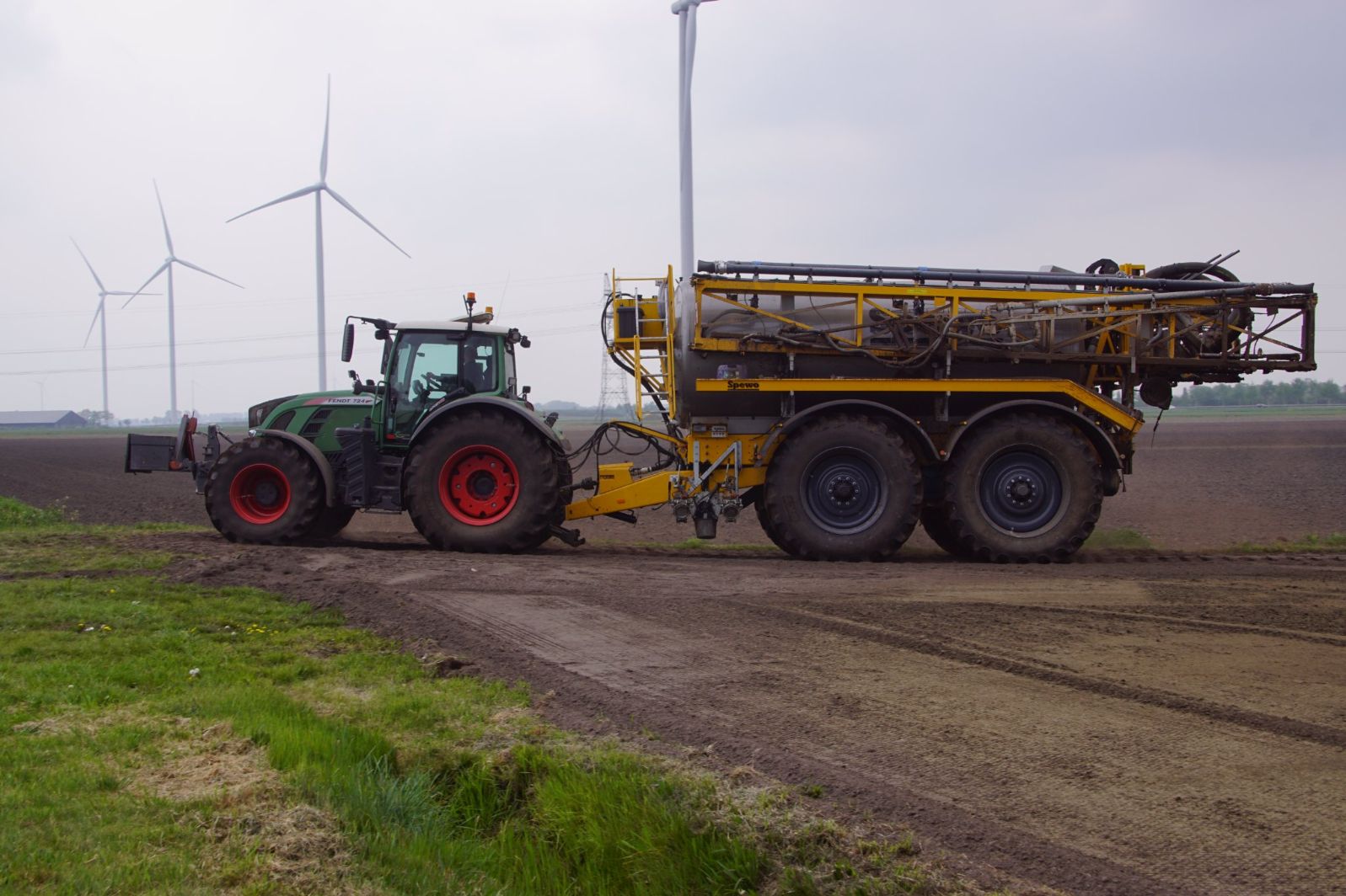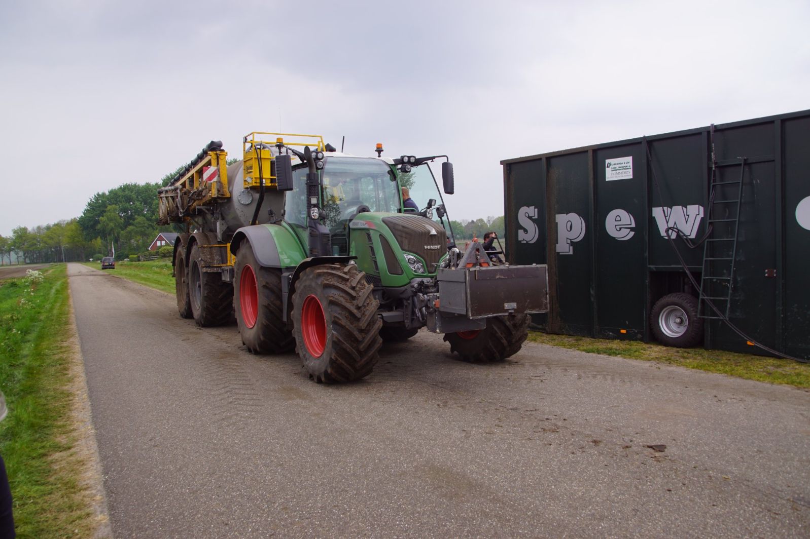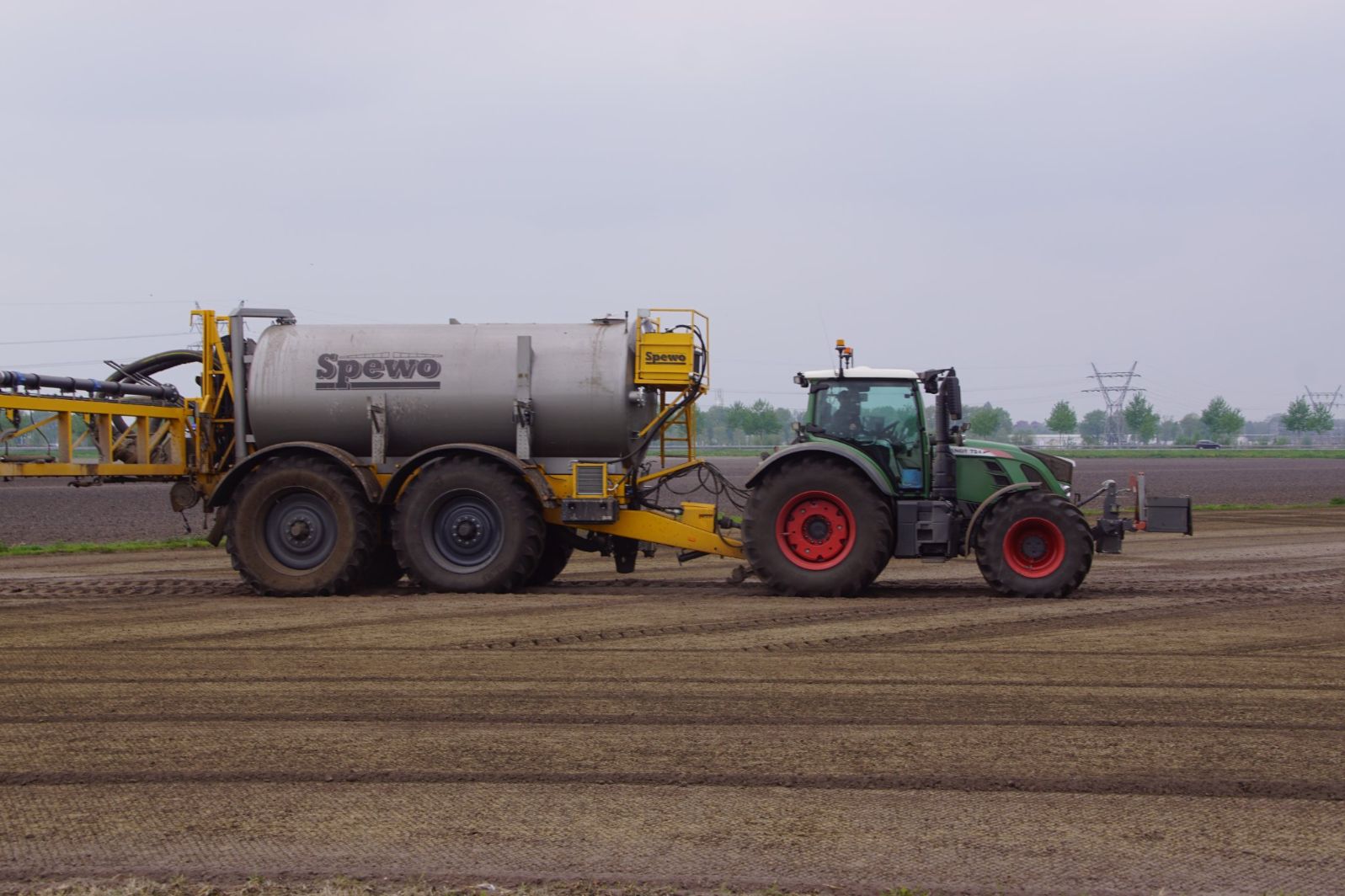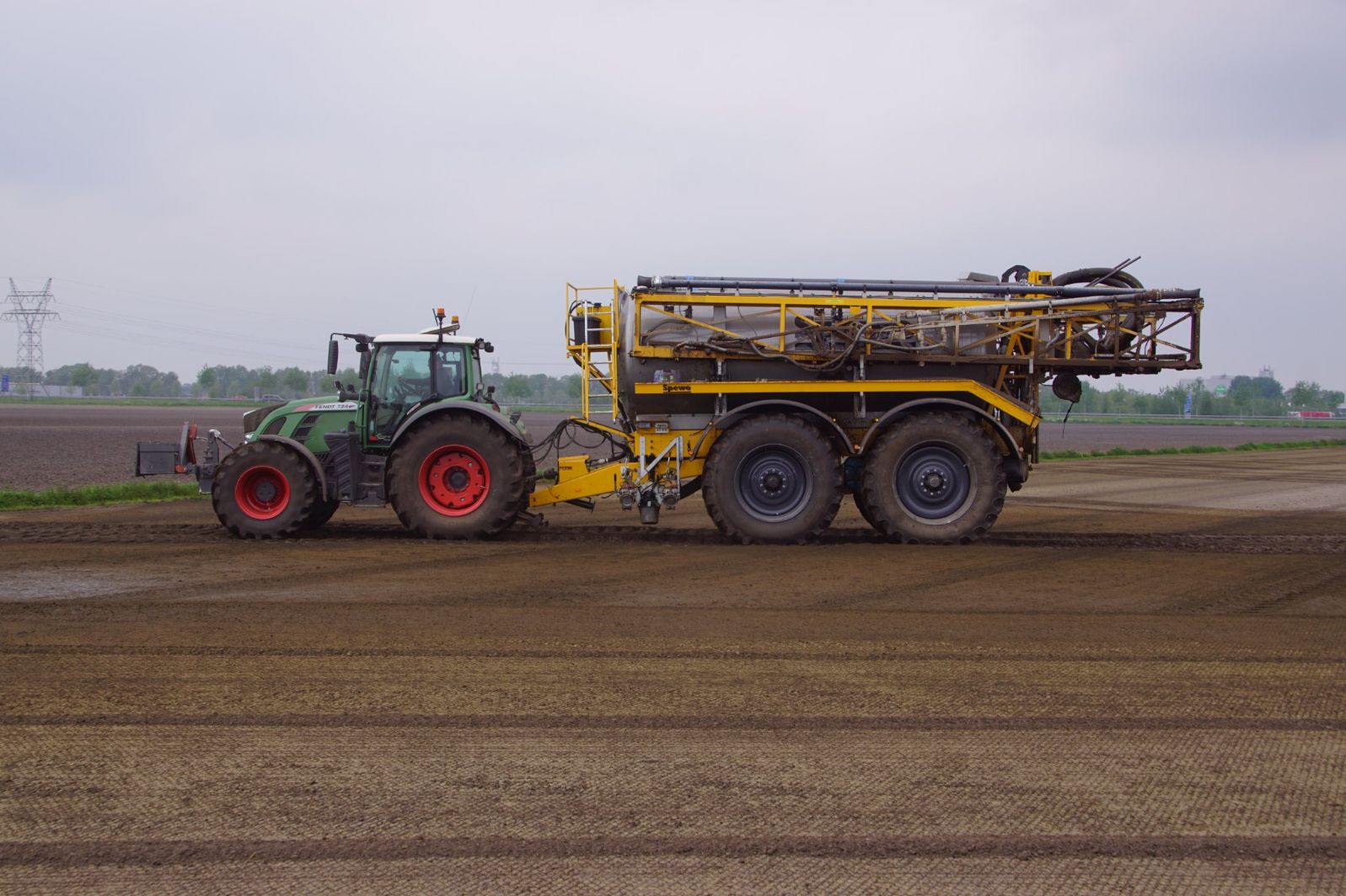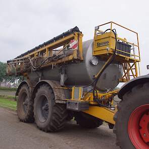 Met deze omgebouwde Dubex-spuit wordt, met daarvoor een Fendt 724, op een precieze manier en goed verdeeld het anti-stuifdek aangebracht.