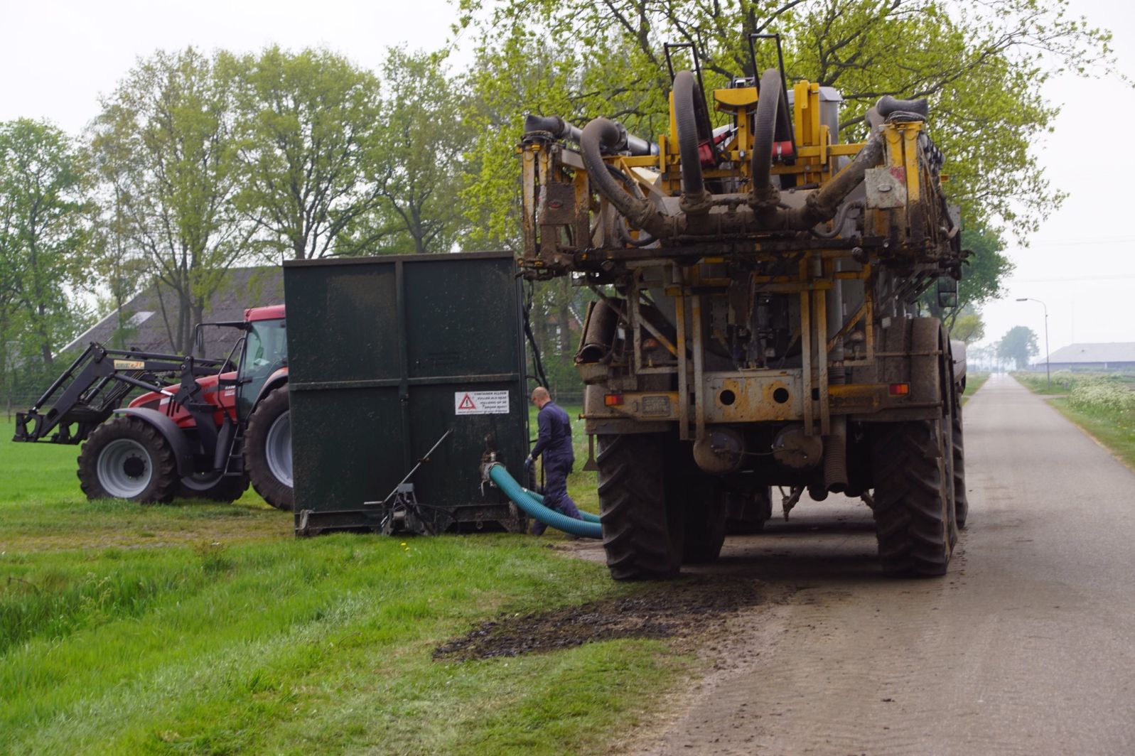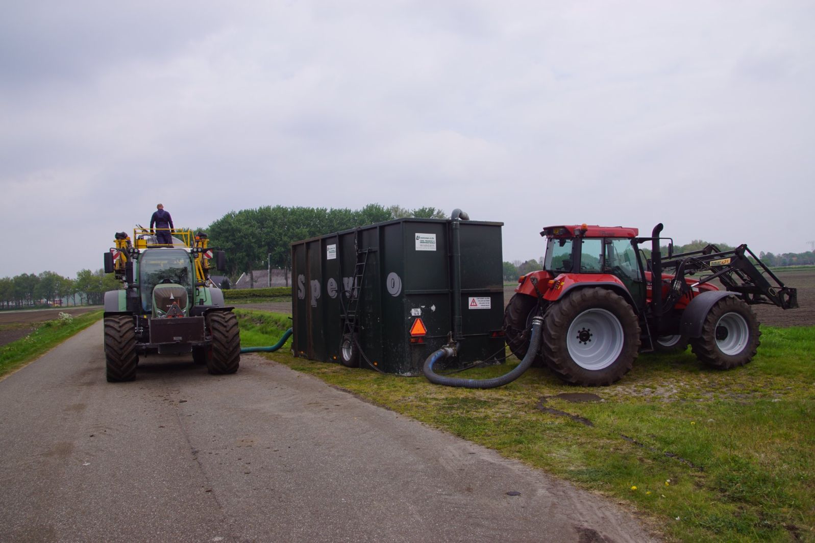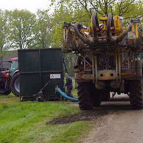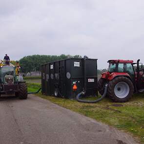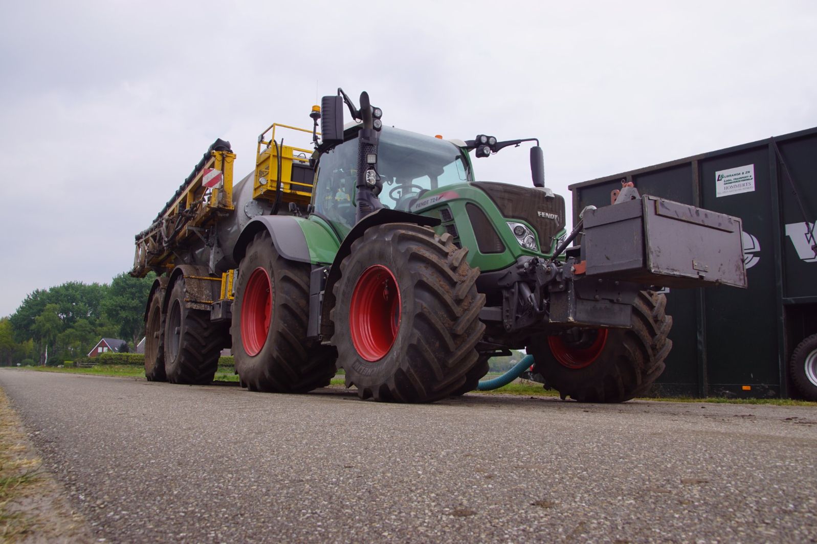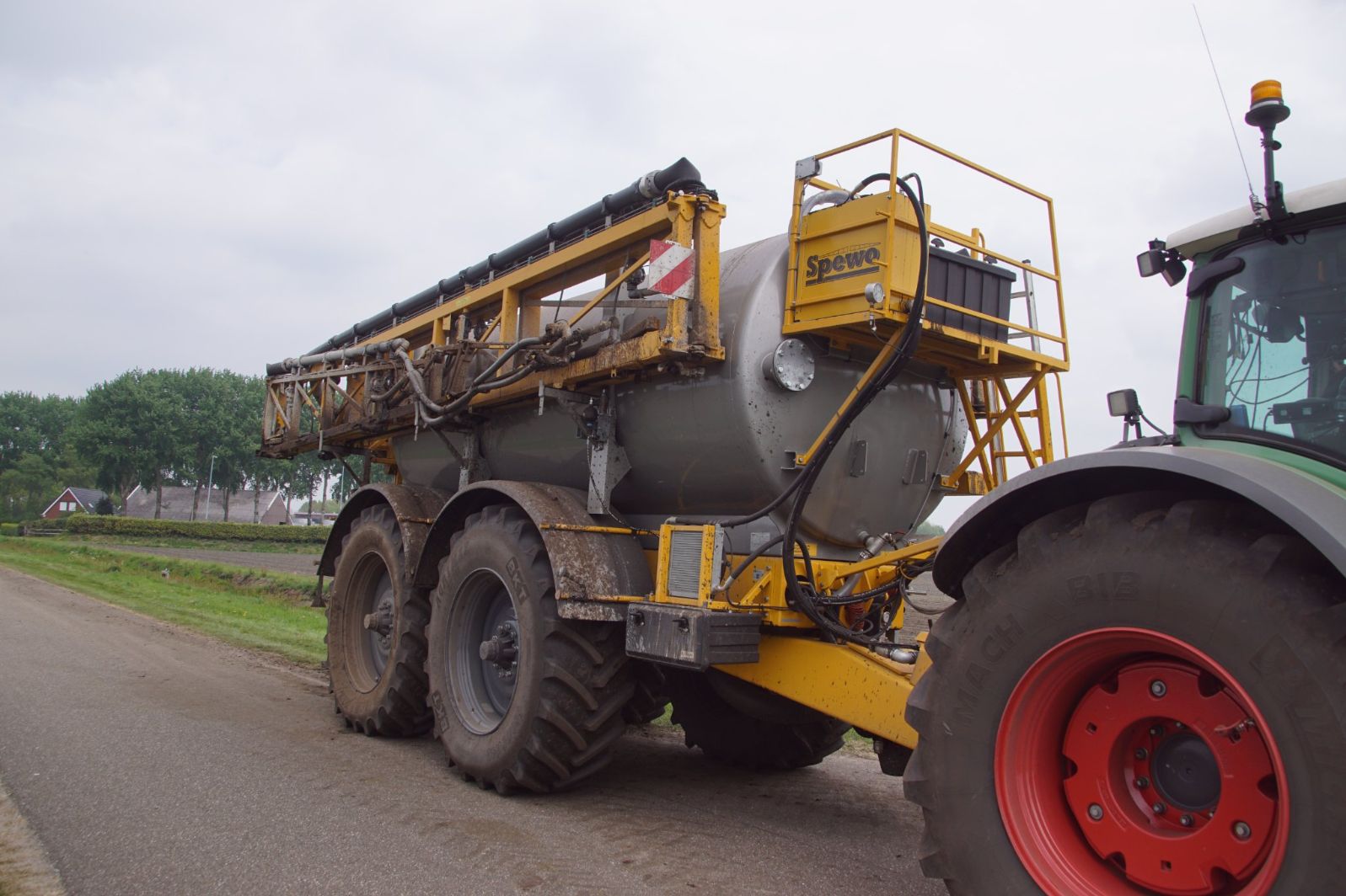 Met deze omgebouwde Dubex-spuit wordt, met daarvoor een Fendt 724, op een precieze manier en goed verdeeld het anti-stuifdek aangebracht.