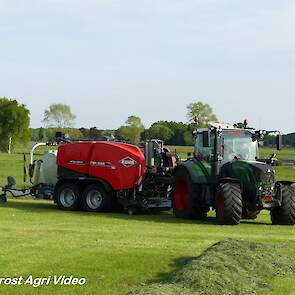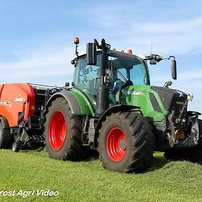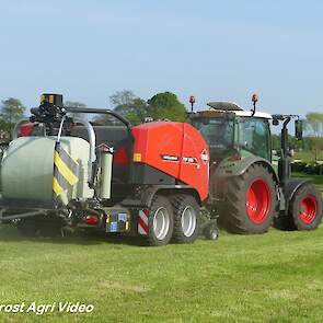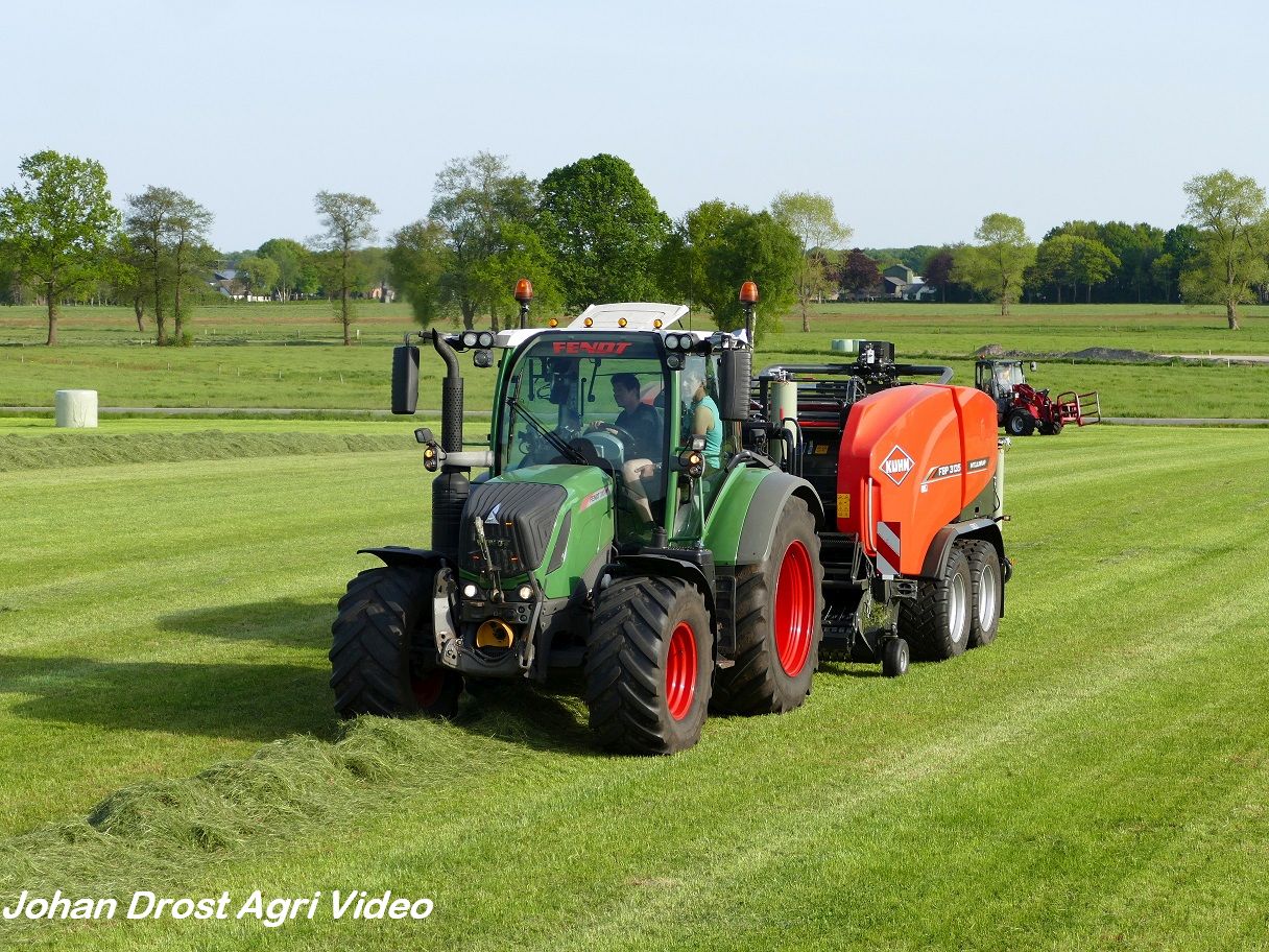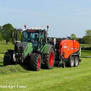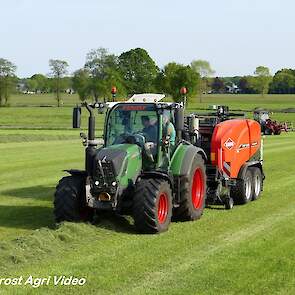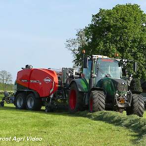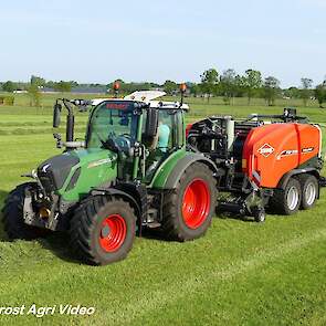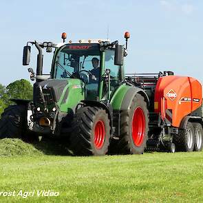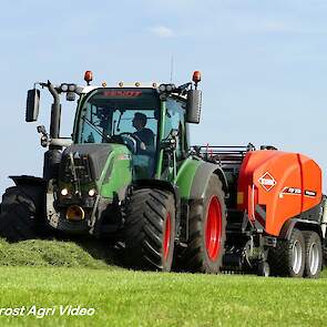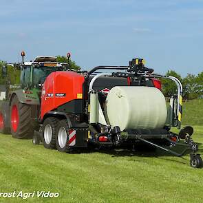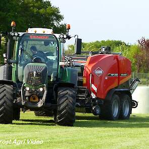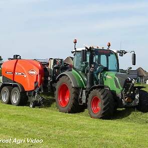 Bloemendal Dienstverlening uit Elspeet (GD) aan het ronde balen persen en wikkelen met een Fendt 313 Vario en een nieuwe Kuhn FBP 3135 Intelliwrap pers-wikkelcombinatie.