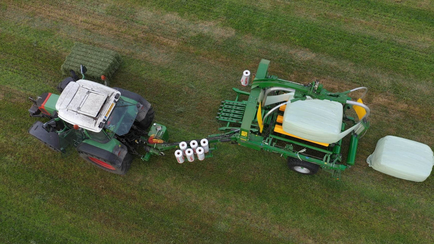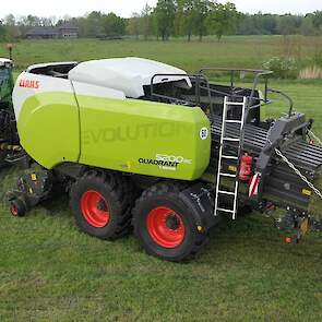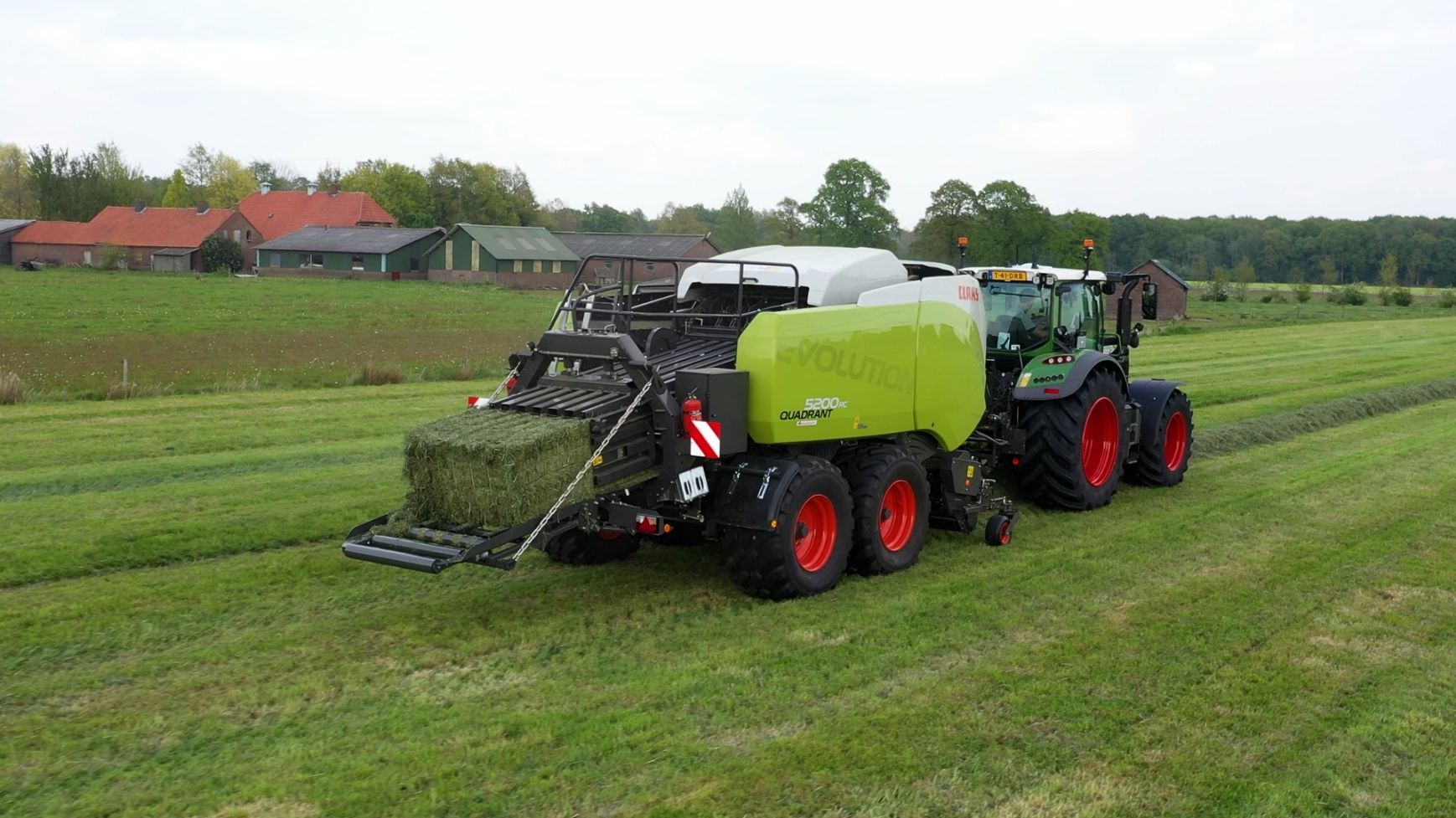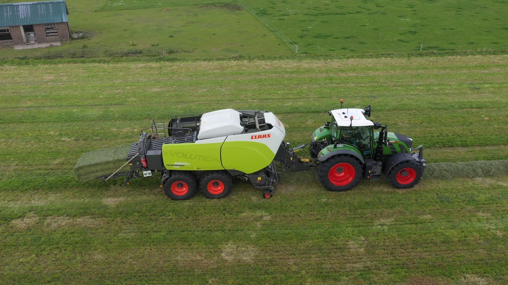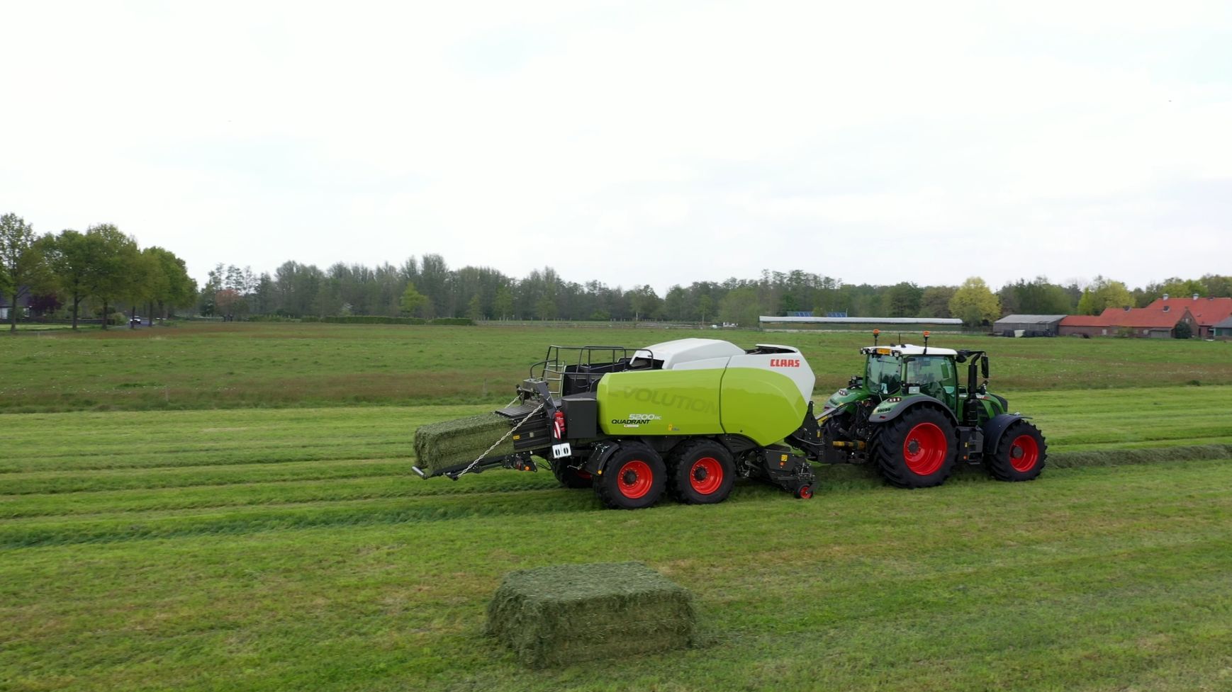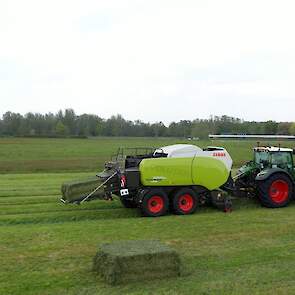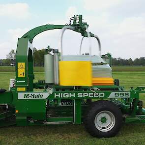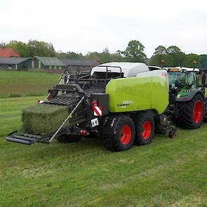 Een Claas Quadrant 5200 RC vierkante balenpers en een Mc Hale High Speed 998-balenwikkelaar zijn hier in actie te zien.