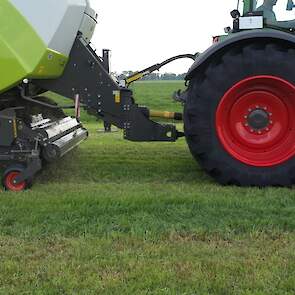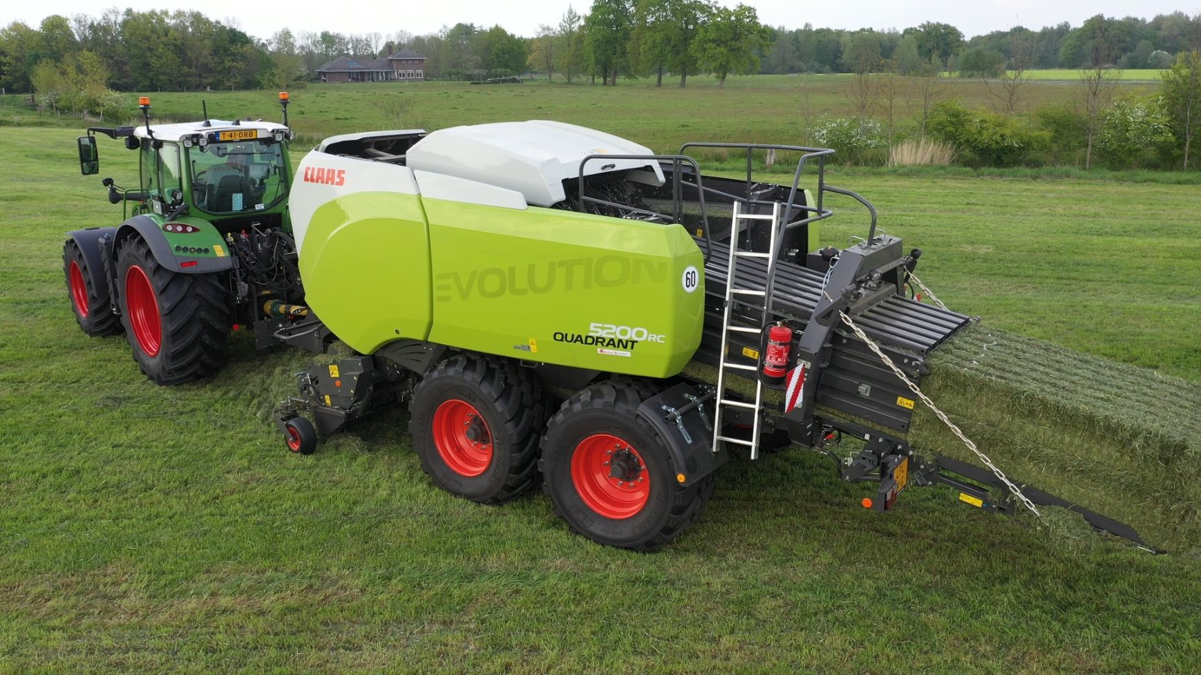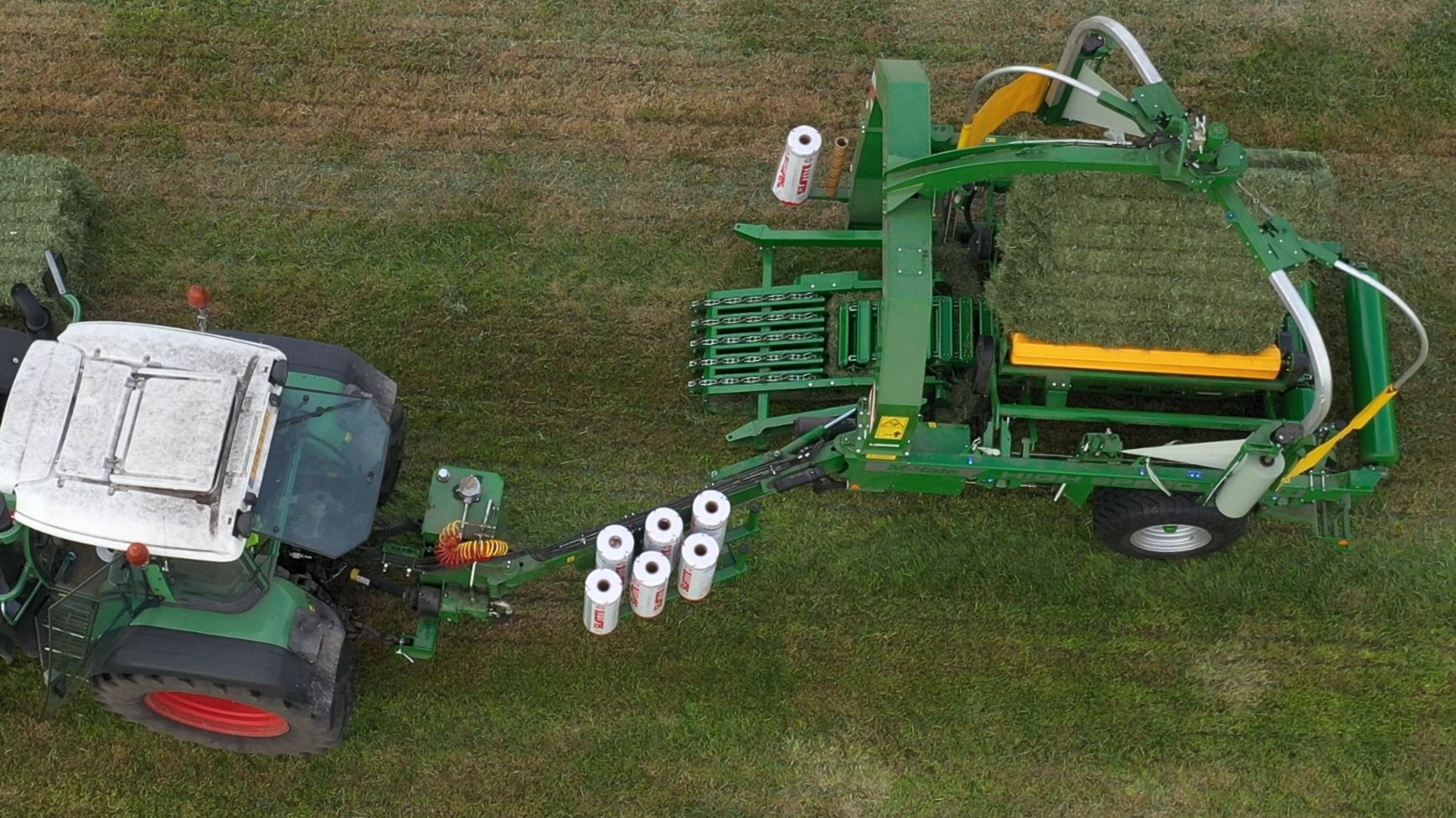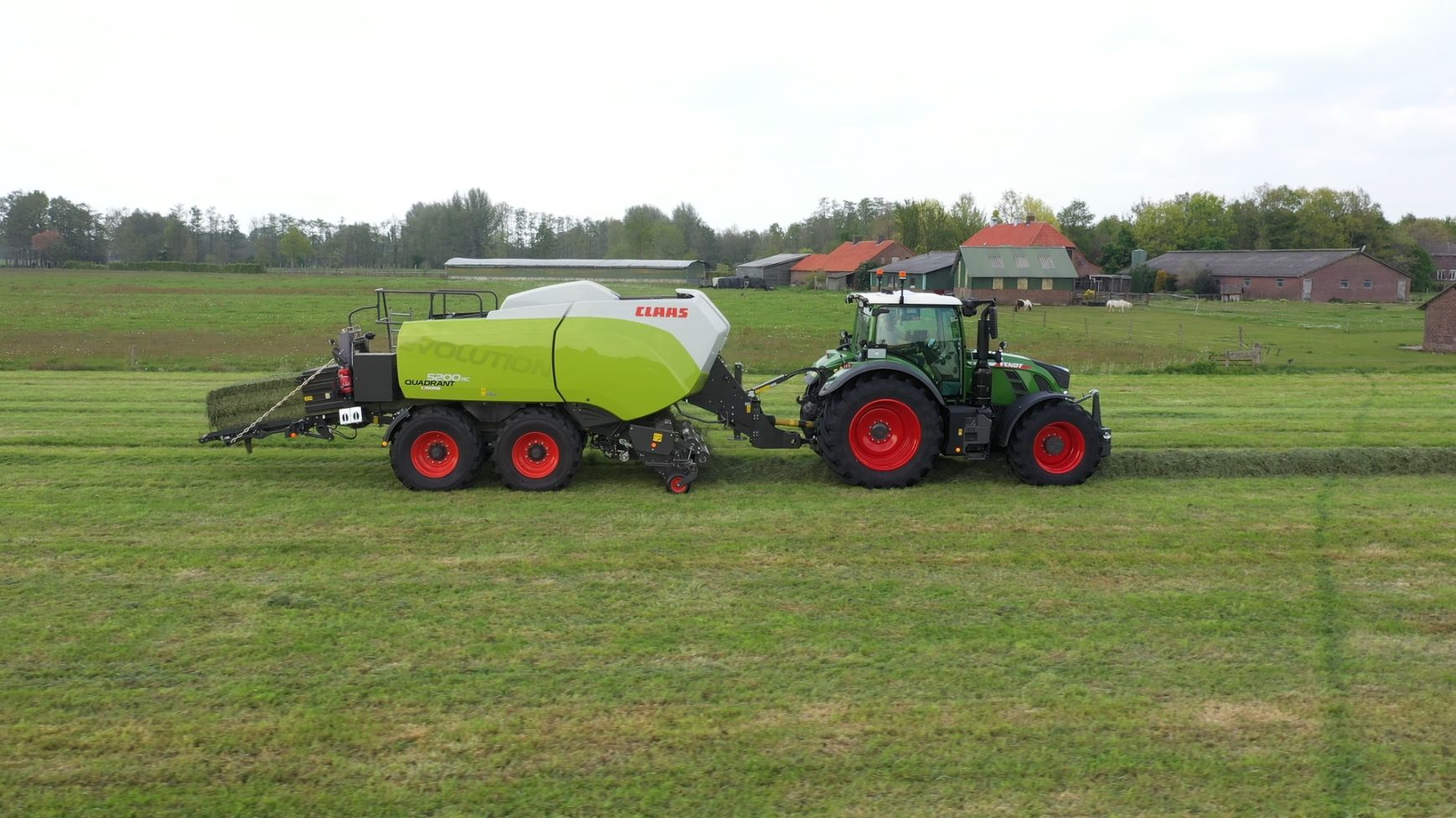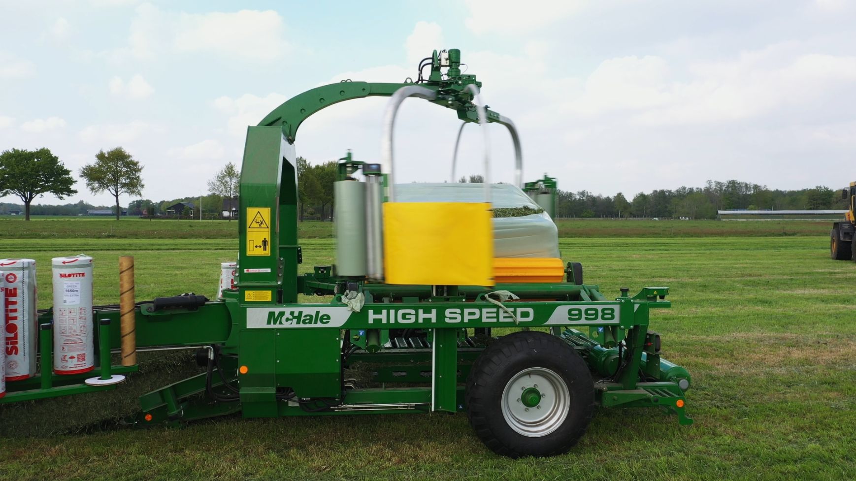 Een Claas Quadrant 5200 RC vierkante balenpers en een Mc Hale High Speed 998-balenwikkelaar zijn hier in actie te zien.