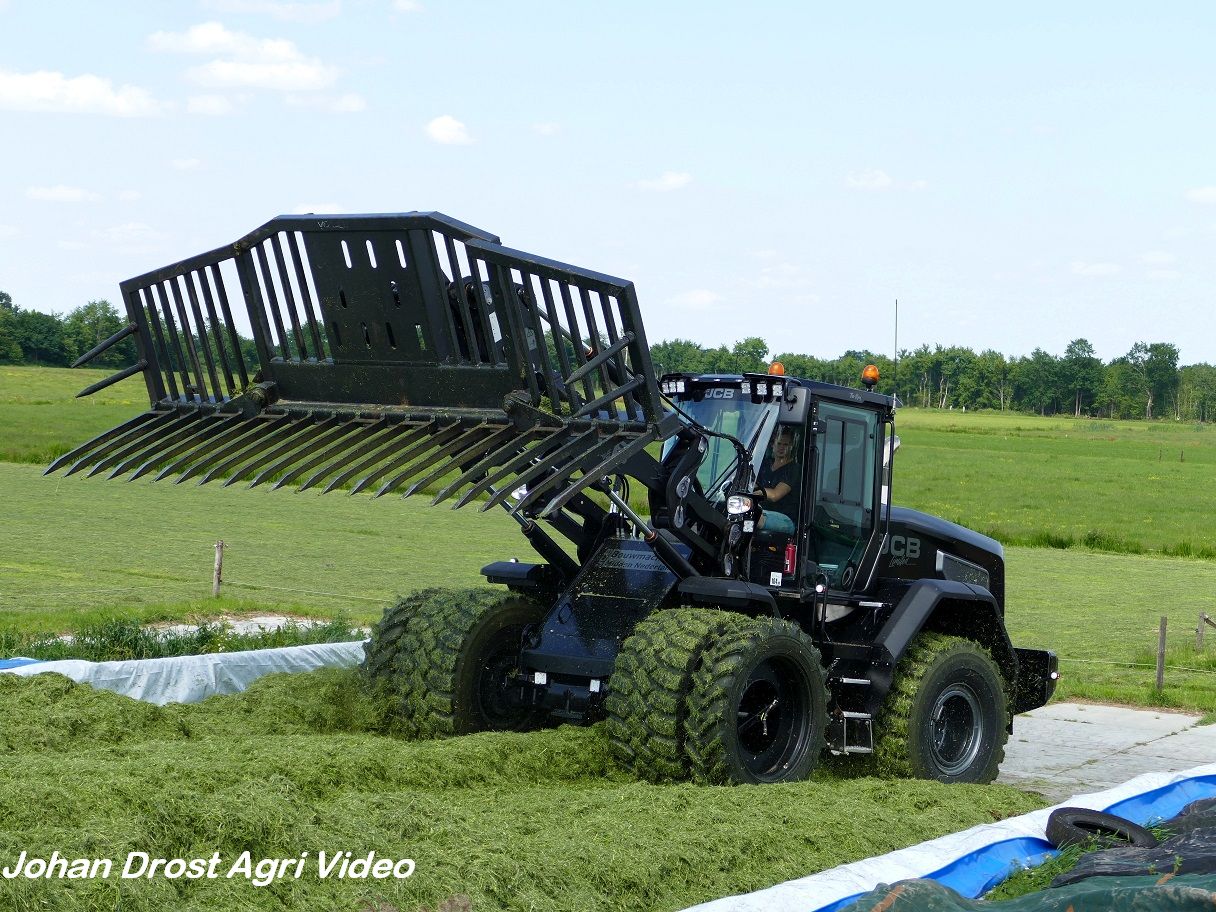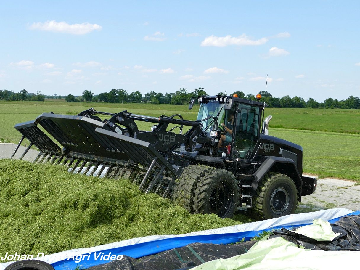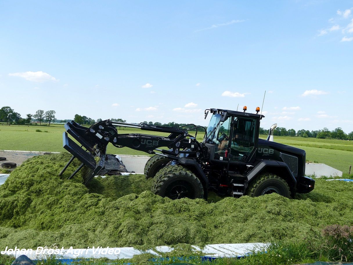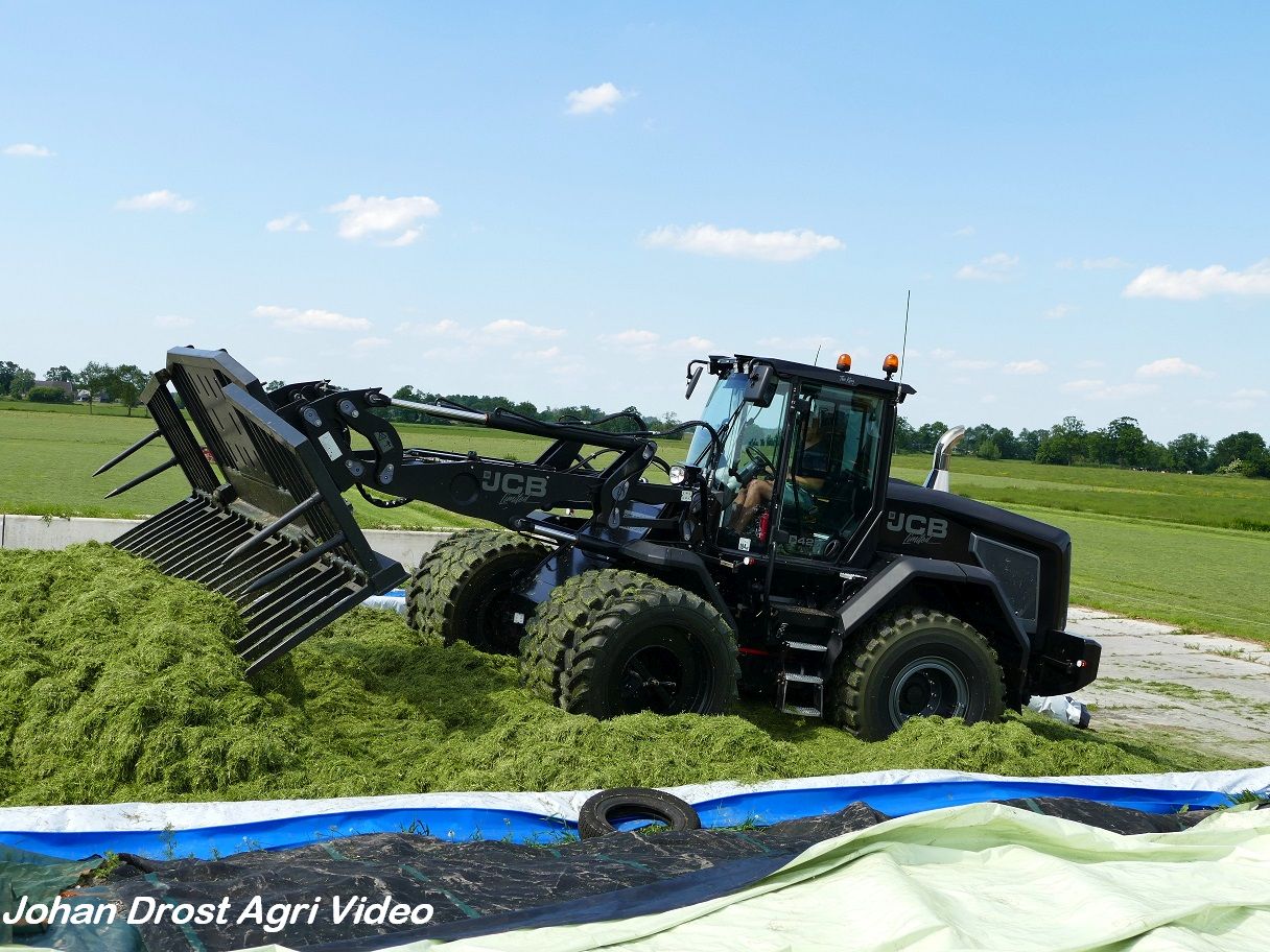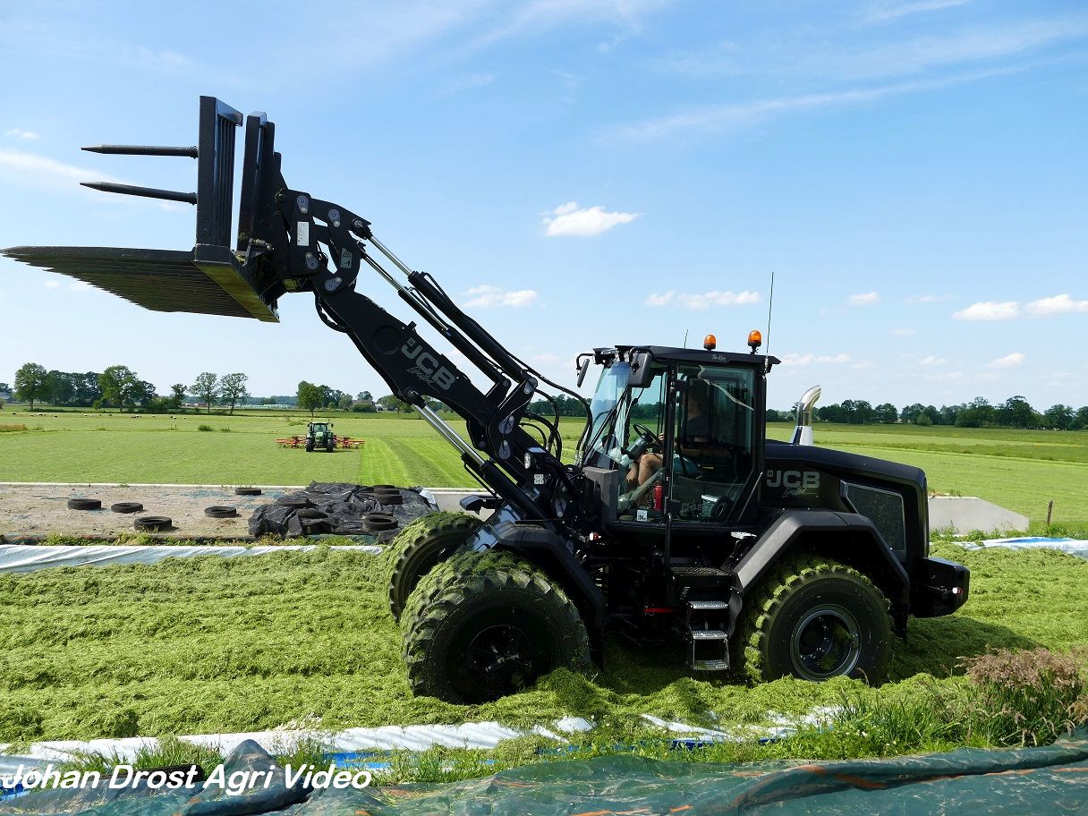 Loonbedrijf van Spijkeren uit Doornspijk (GD) aan het gras hakselen met een Claas Jaguar 940, een John Deere 6150R en een John Deere 6155R met Kaweco Radium 50. Op de kuil een JCB 427 Agri Limited Edition van Van Veelen Holsteins uit Biddinghuizen (FL).