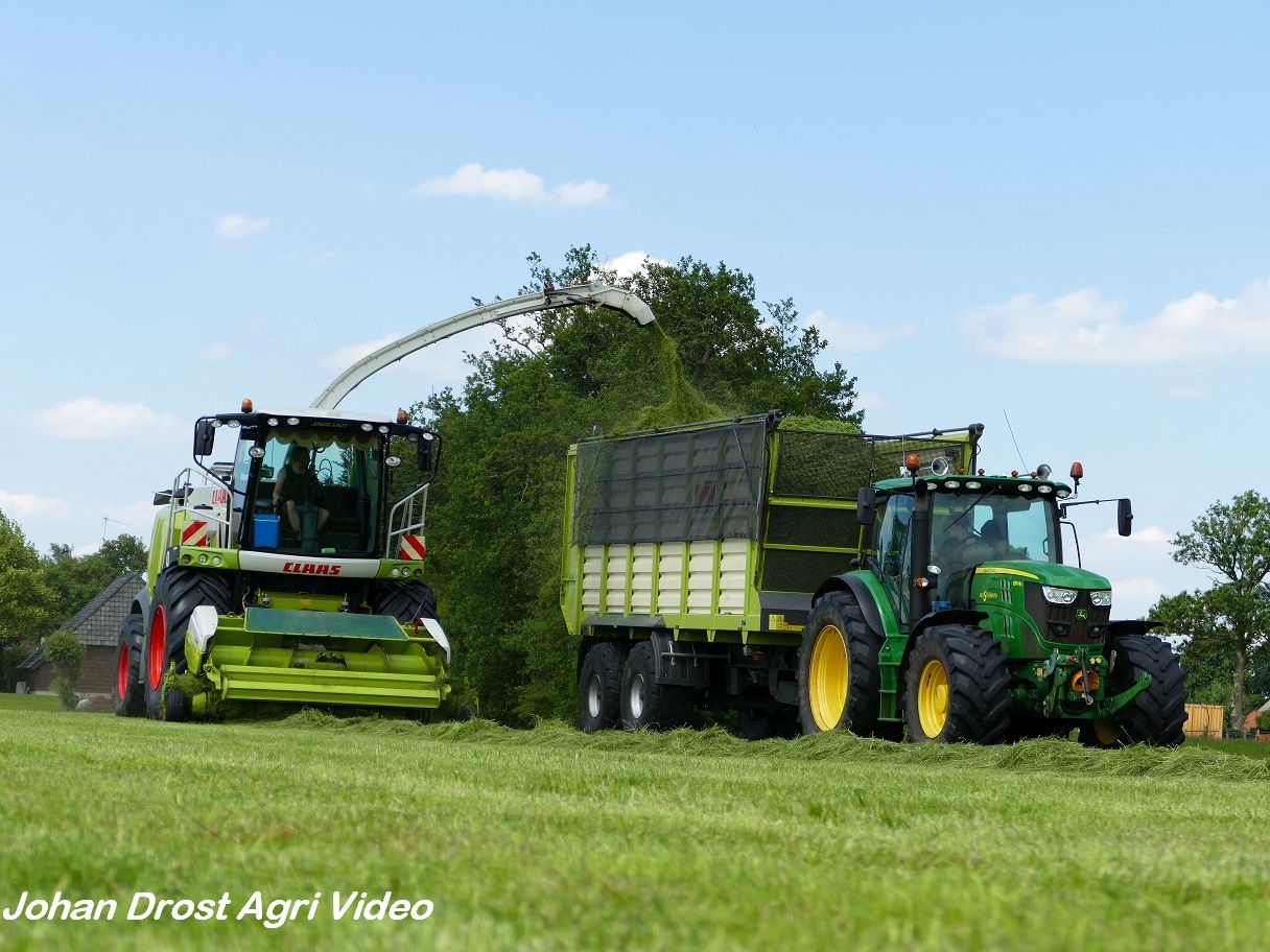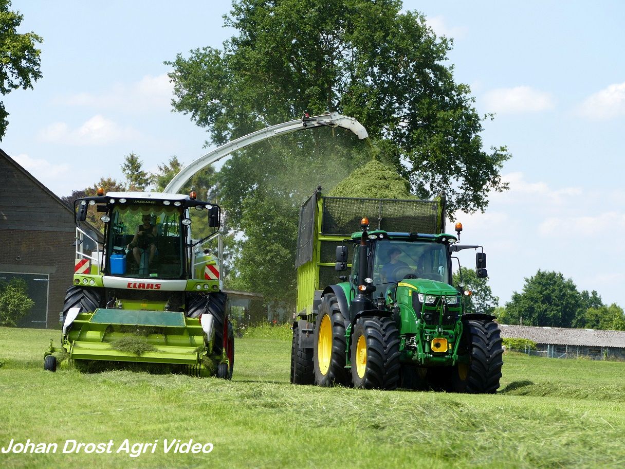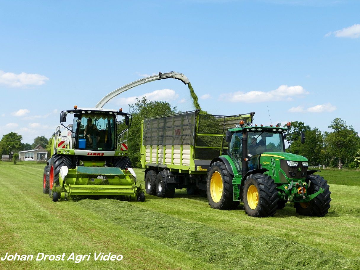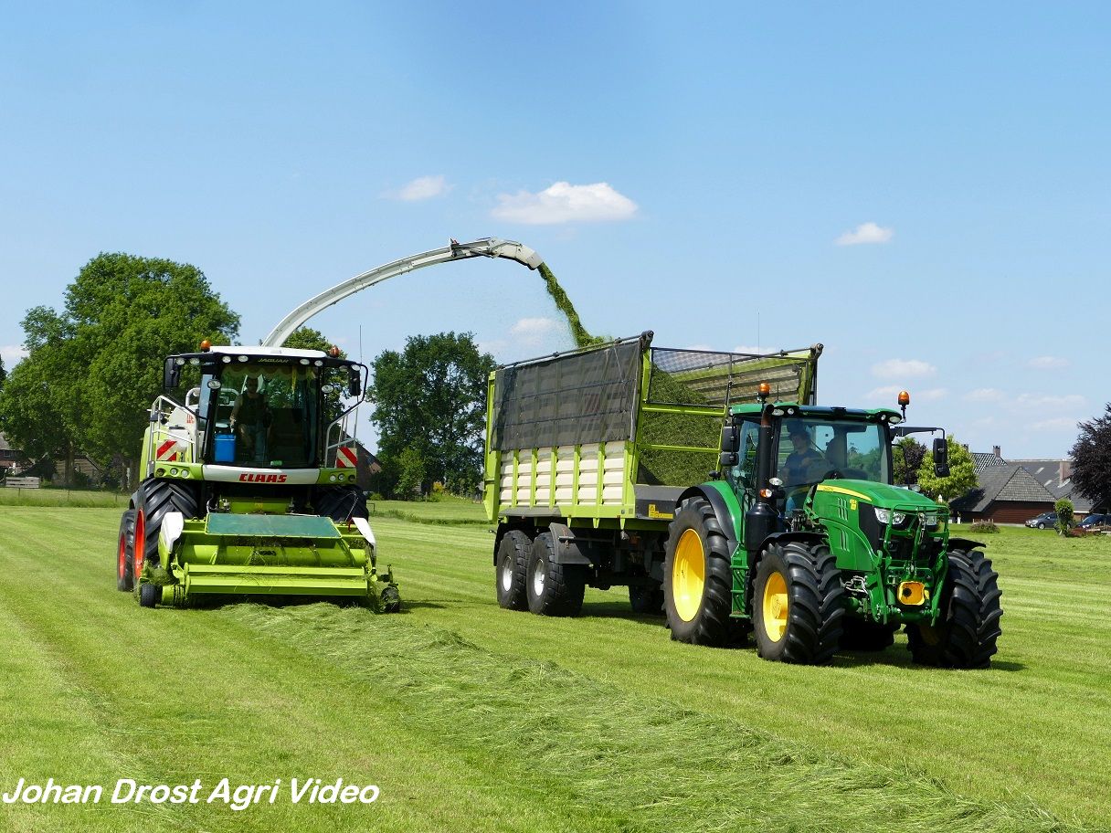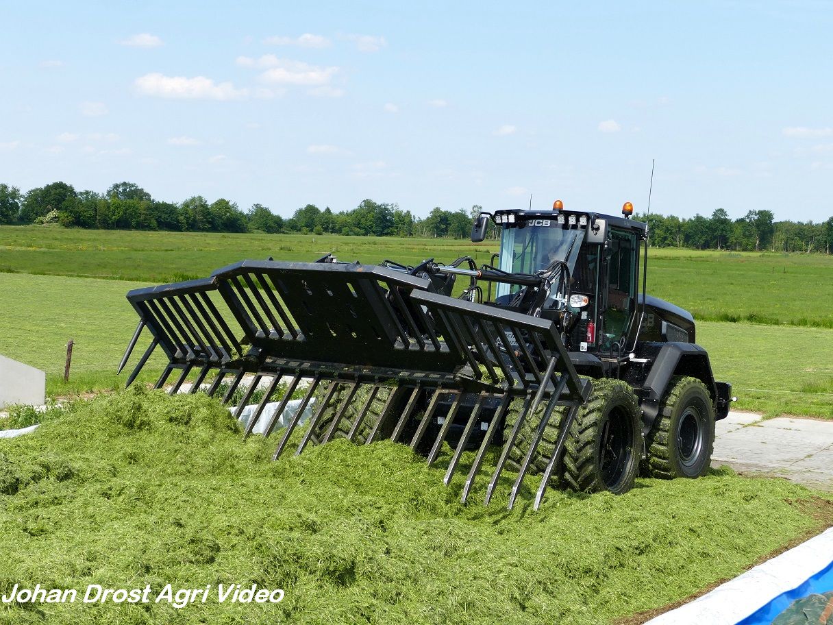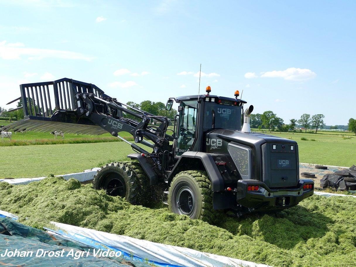 Loonbedrijf van Spijkeren uit Doornspijk (GD) aan het gras hakselen met een Claas Jaguar 940, een John Deere 6150R en een John Deere 6155R met Kaweco Radium 50. Op de kuil een JCB 427 Agri Limited Edition van Van Veelen Holsteins uit Biddinghuizen (FL).