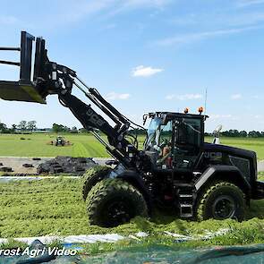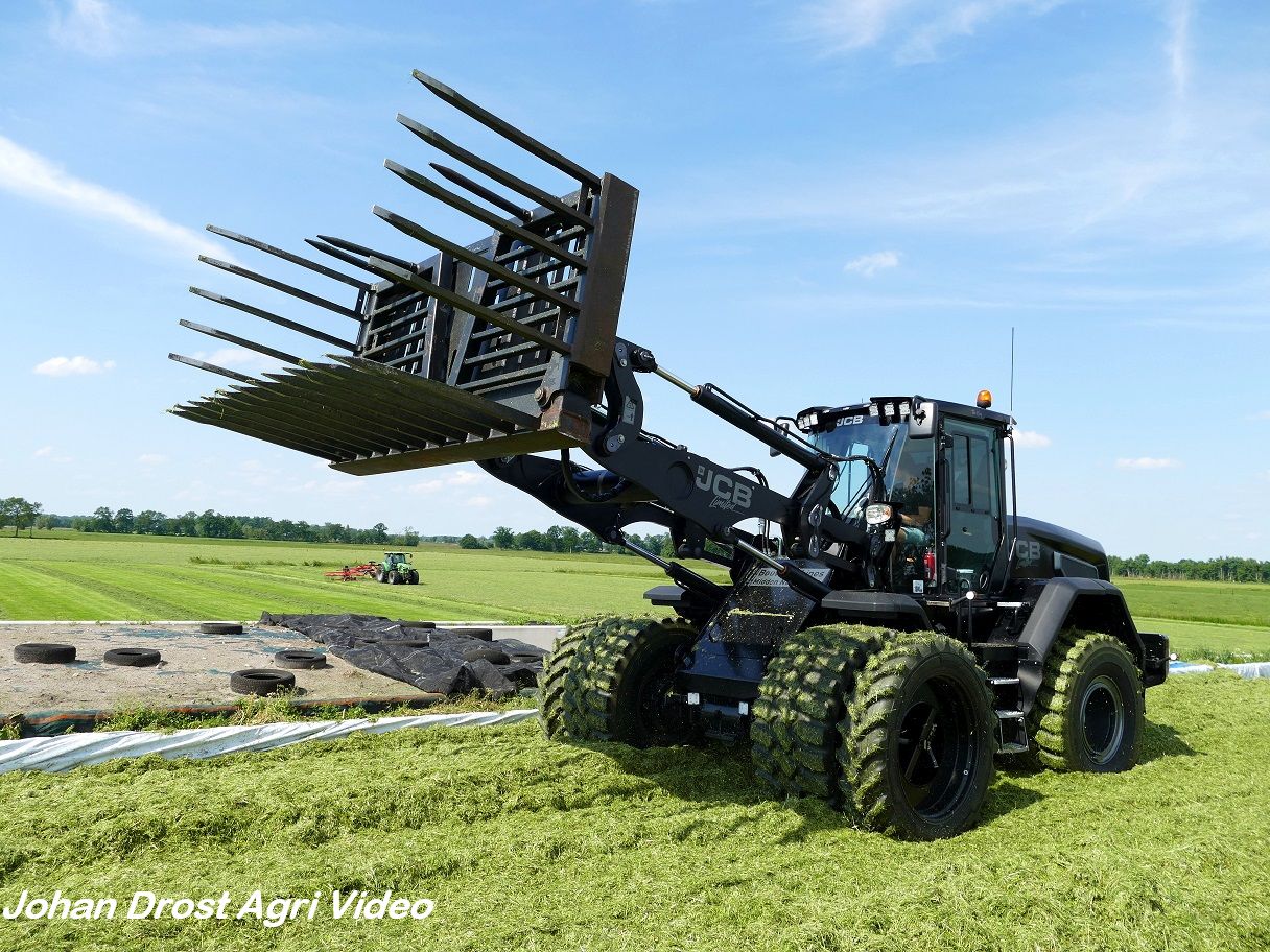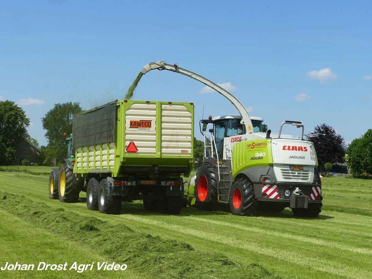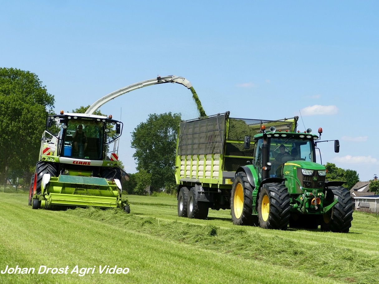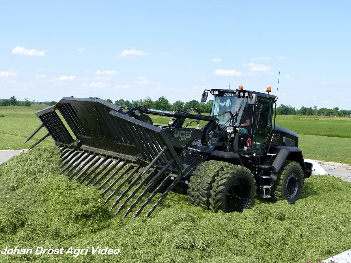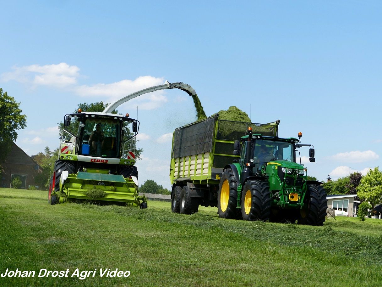Loonbedrijf van Spijkeren uit Doornspijk (GD) aan het gras hakselen met een Claas Jaguar 940, een John Deere 6150R en een John Deere 6155R met Kaweco Radium 50. Op de kuil een JCB 427 Agri Limited Edition van Van Veelen Holsteins uit Biddinghuizen (FL).