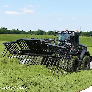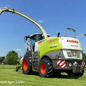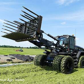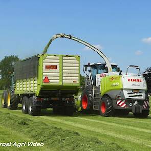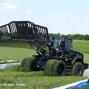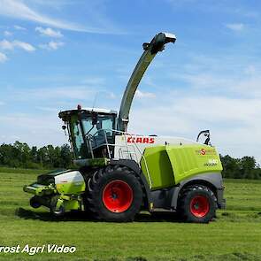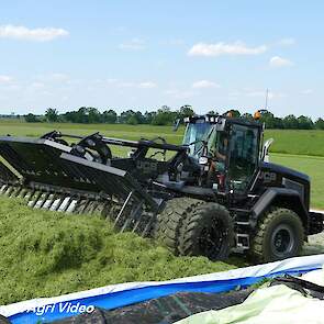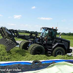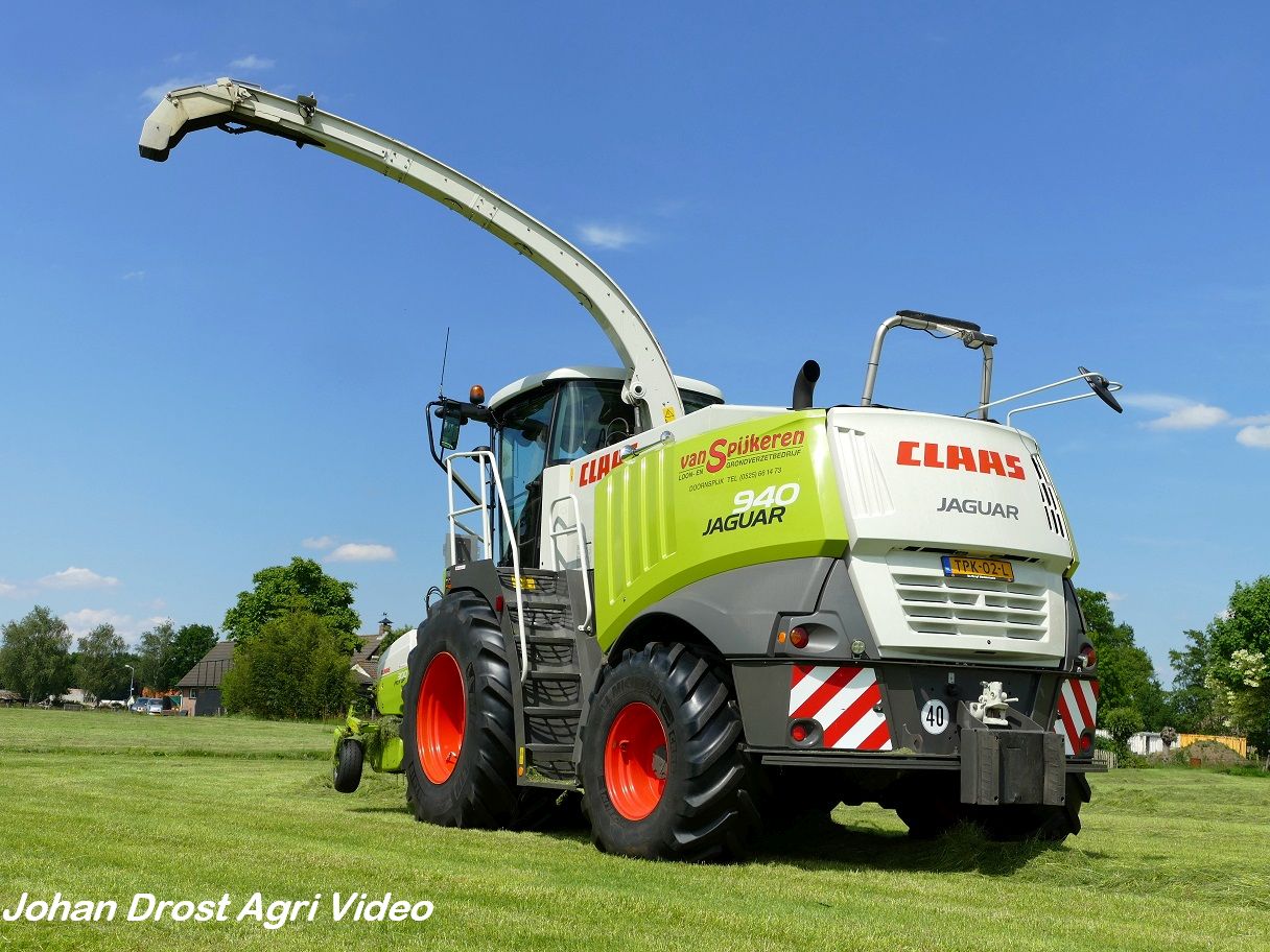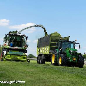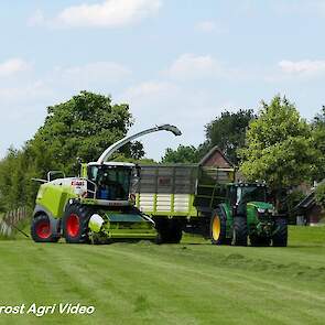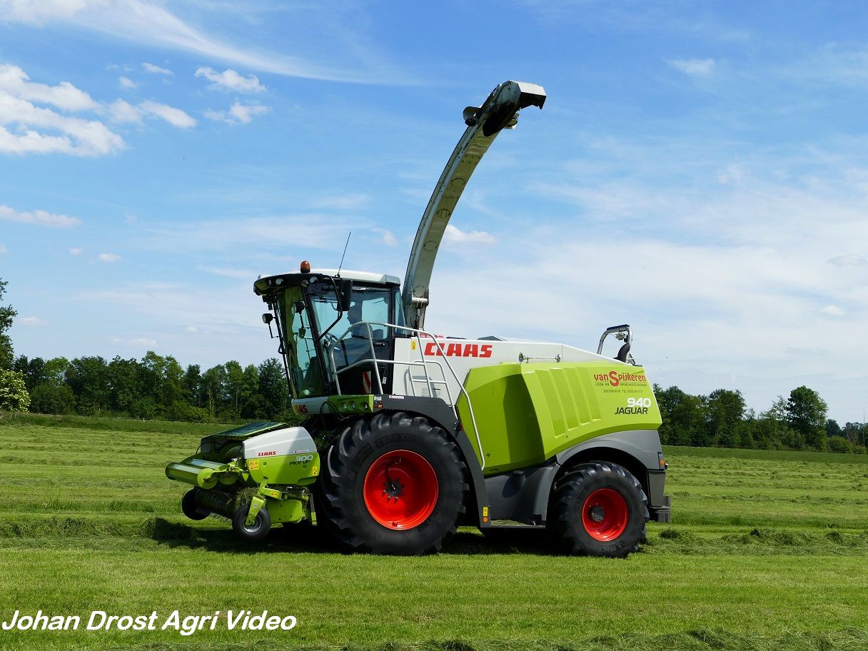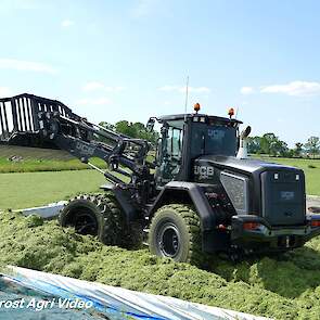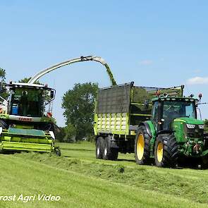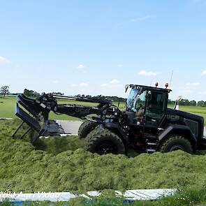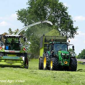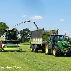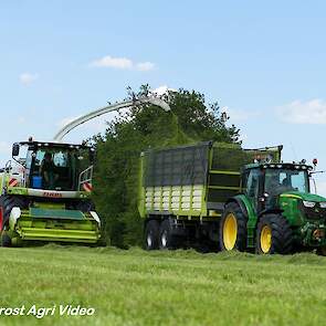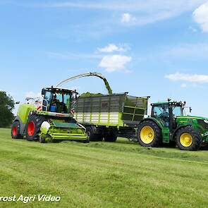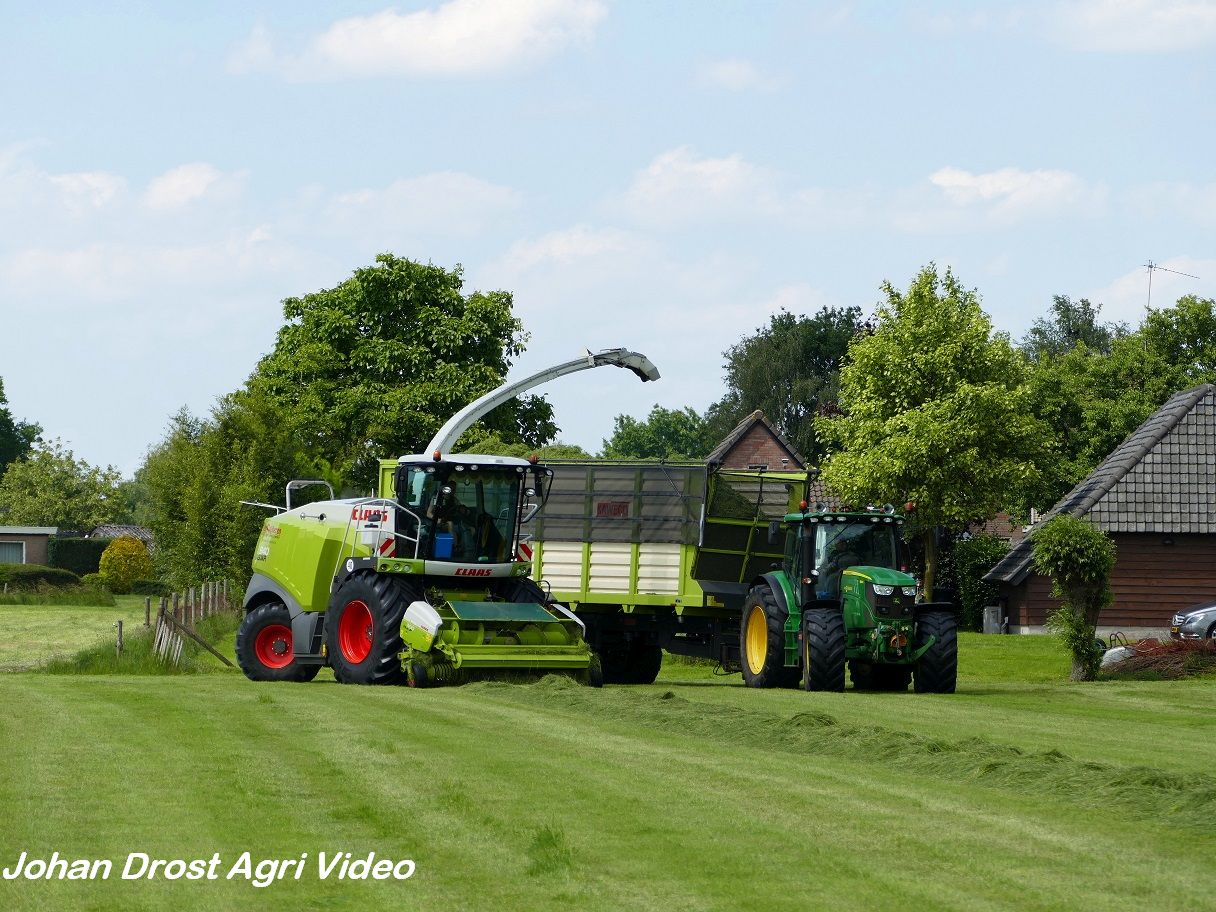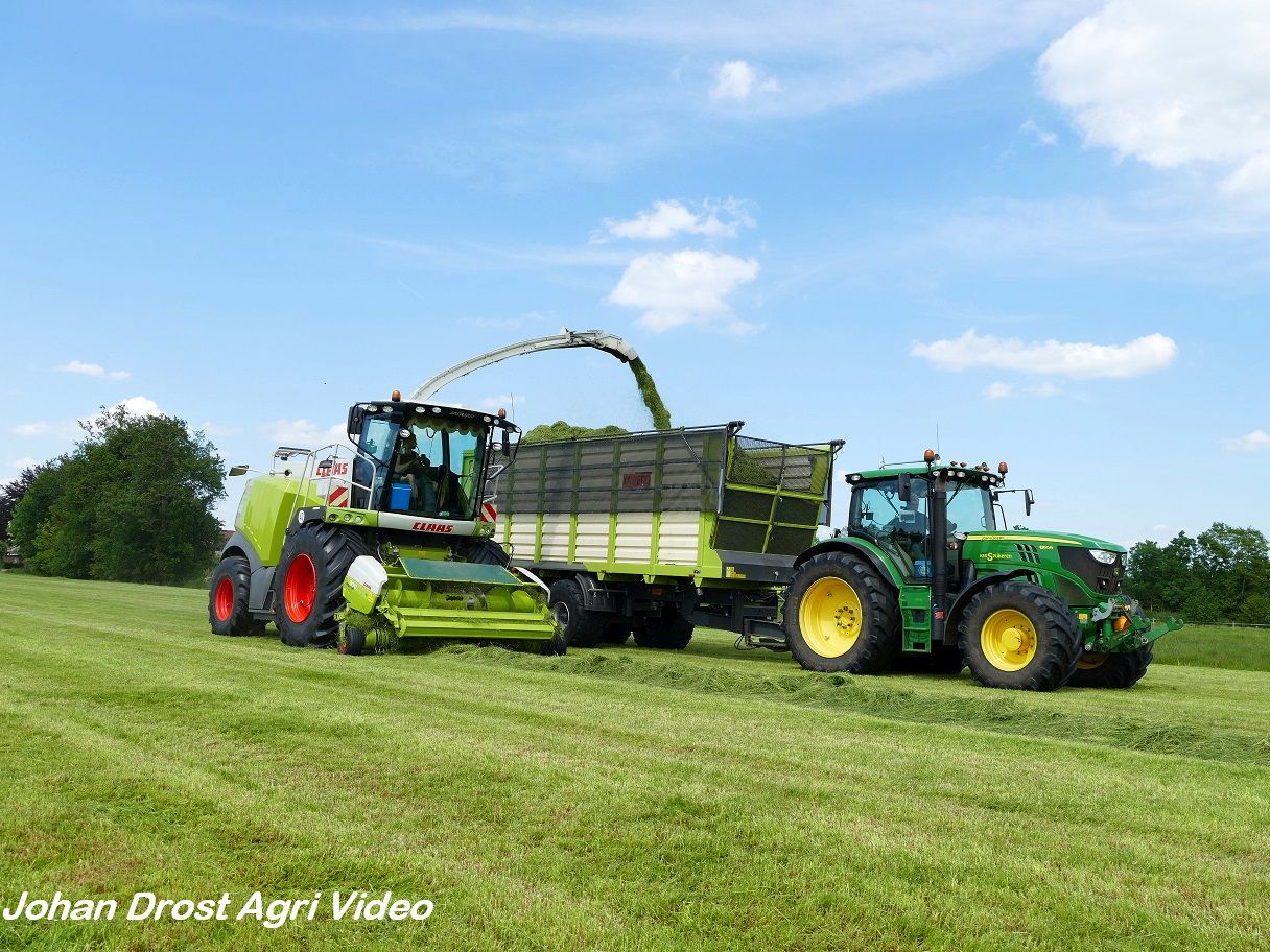 Loonbedrijf van Spijkeren uit Doornspijk (GD) aan het gras hakselen met een Claas Jaguar 940, een John Deere 6150R en een John Deere 6155R met Kaweco Radium 50. Op de kuil een JCB 427 Agri Limited Edition van Van Veelen Holsteins uit Biddinghuizen (FL).