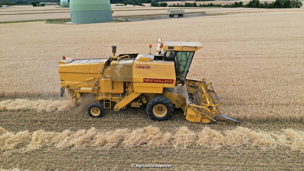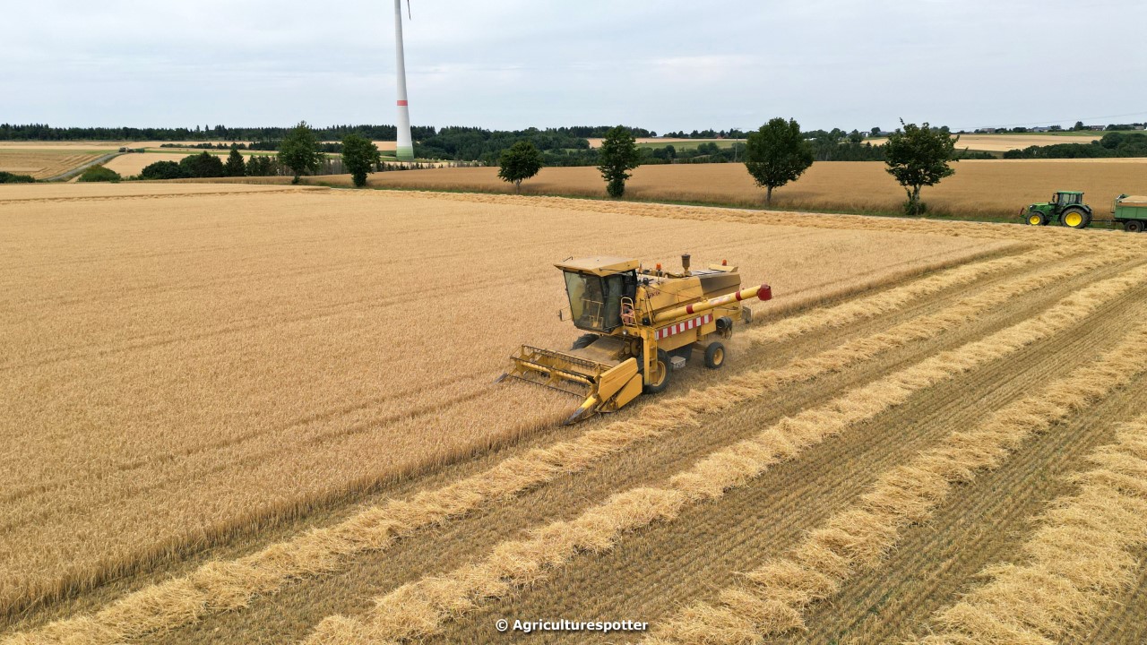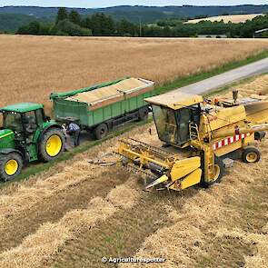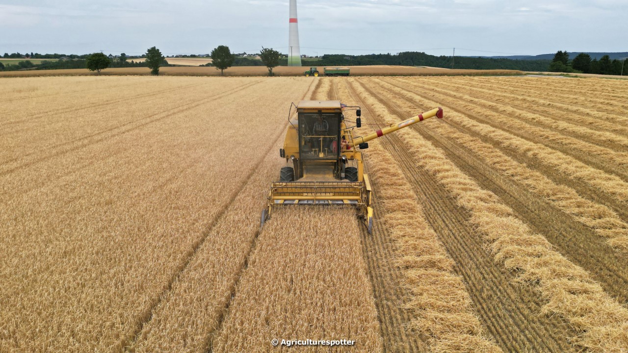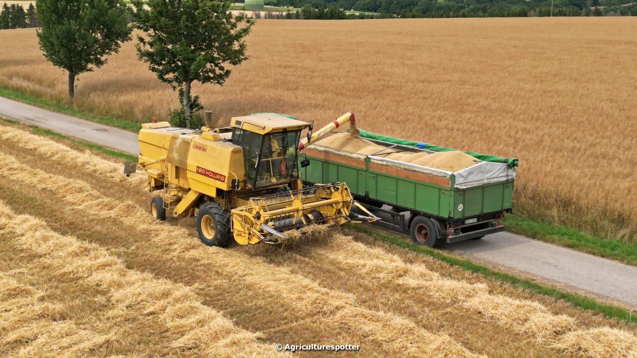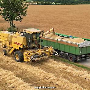Tarwe dorsen in Schleiden (Euskirchen) in de Eifel in Duitsland met een prachtige New Holland Clayson 8030. Het transport van het graan werd gedaan met een John Deere 6120M.