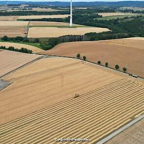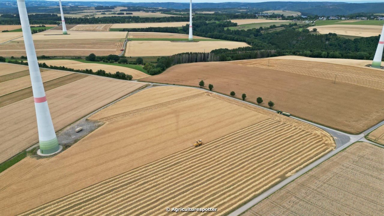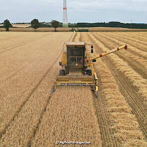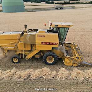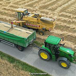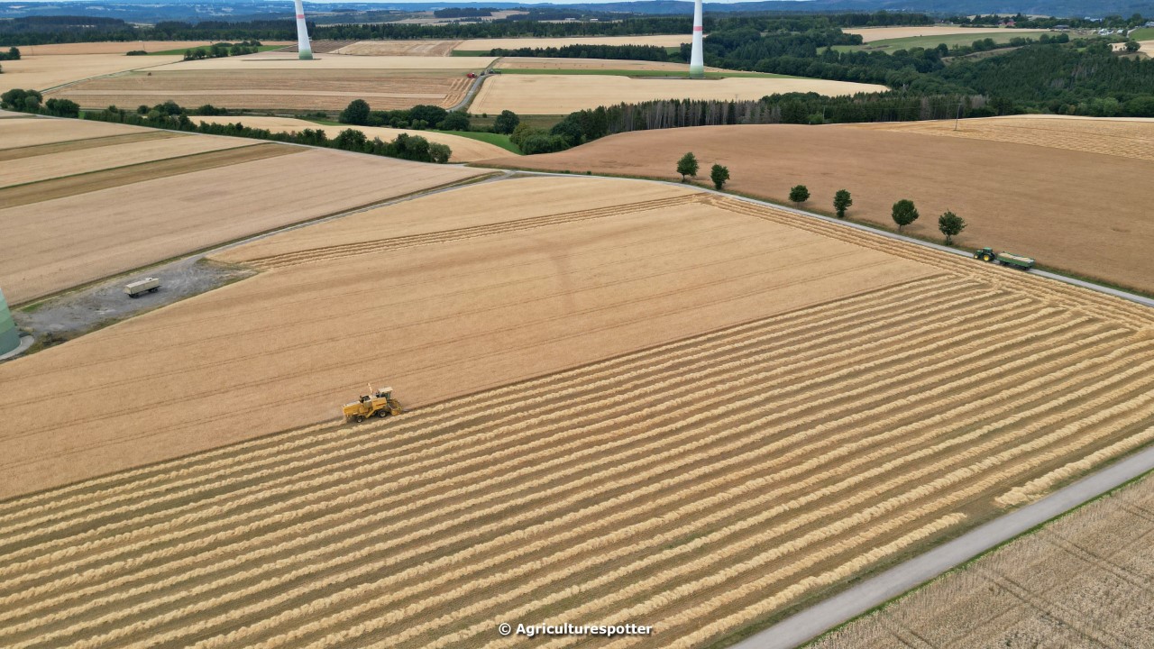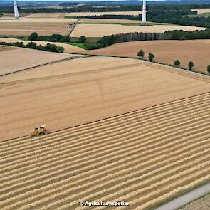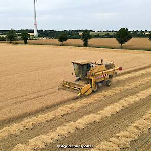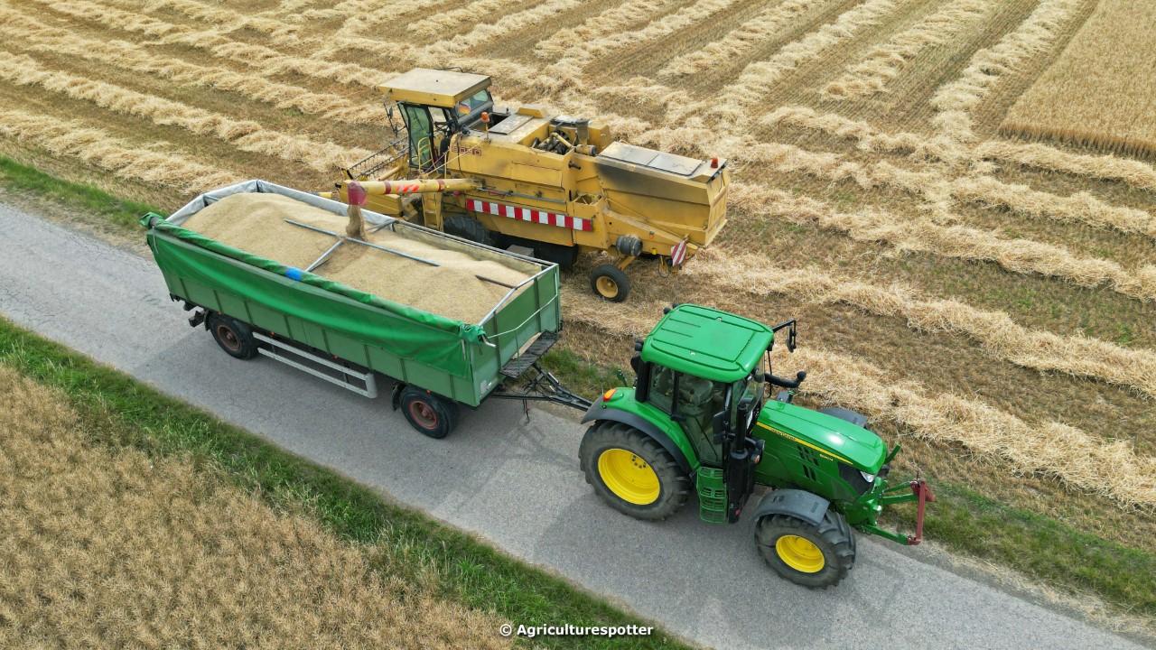 Tarwe dorsen in Schleiden (Euskirchen) in de Eifel in Duitsland met een prachtige New Holland Clayson 8030. Het transport van het graan werd gedaan met een John Deere 6120M.