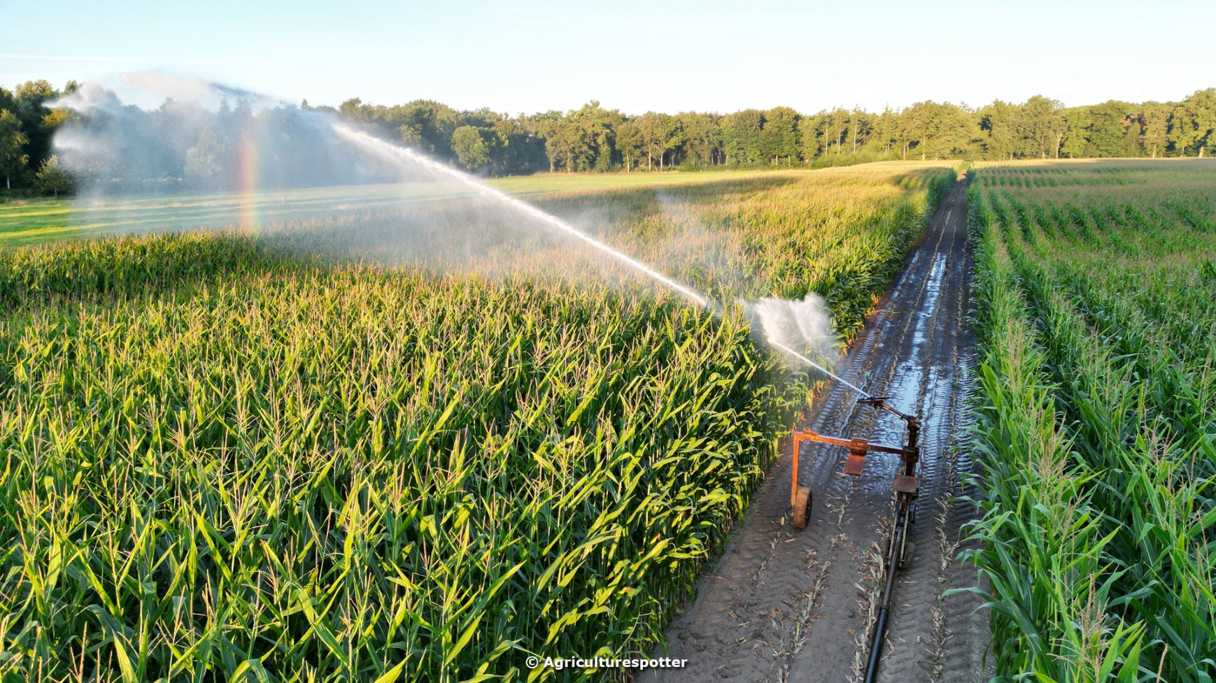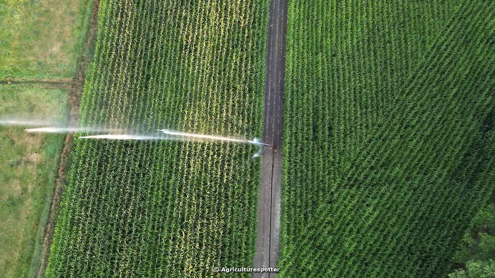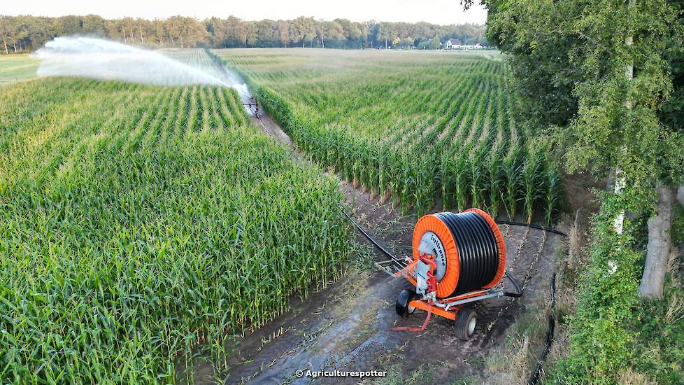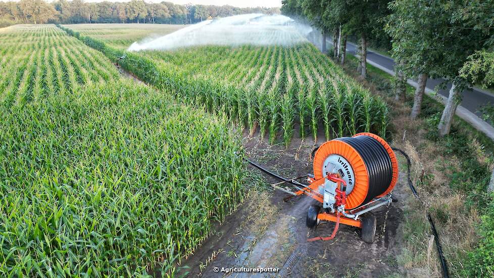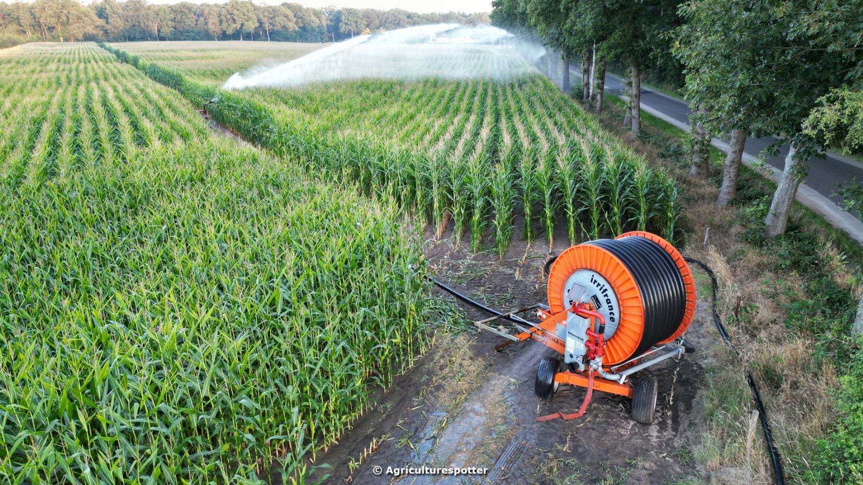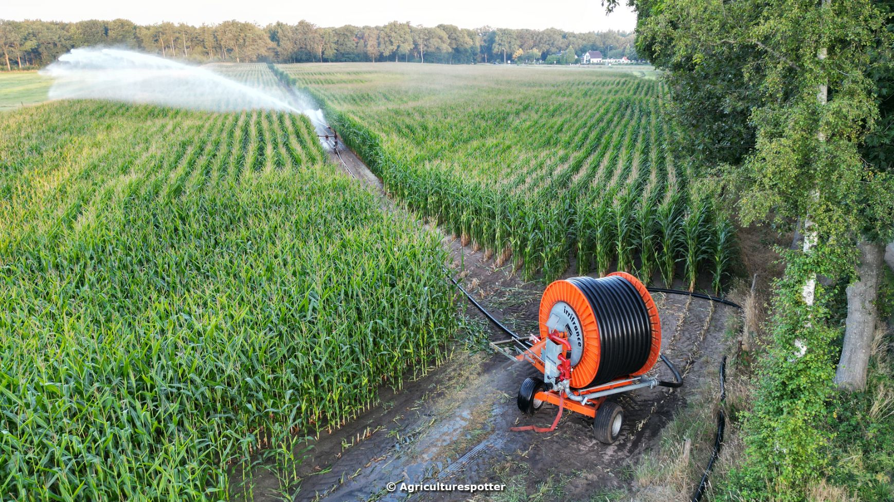 Met de aanhoudende droogte en het neerslagtekort zie je op steeds meer plaatsen dat men de gewassen moet gaan beregenen om te voorkomen dat ze uitdrogen of in het ergste geval veel te vroeg moeten gaan maïs hakselen. Hier zijn ze aan het maïs beregenen in Voorthuizen (GD) met een Irrifrance Optima 1020-beregeningsinstallatie.
