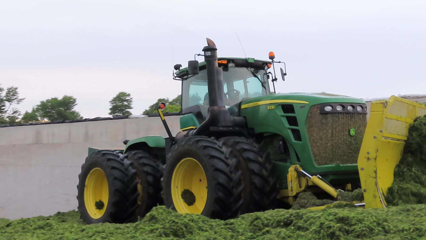 Familie Van Nes oogst luzerne in Canada. Ze hebben een geweldige vloot John Deere-tractoren en een grote oogstmachine.